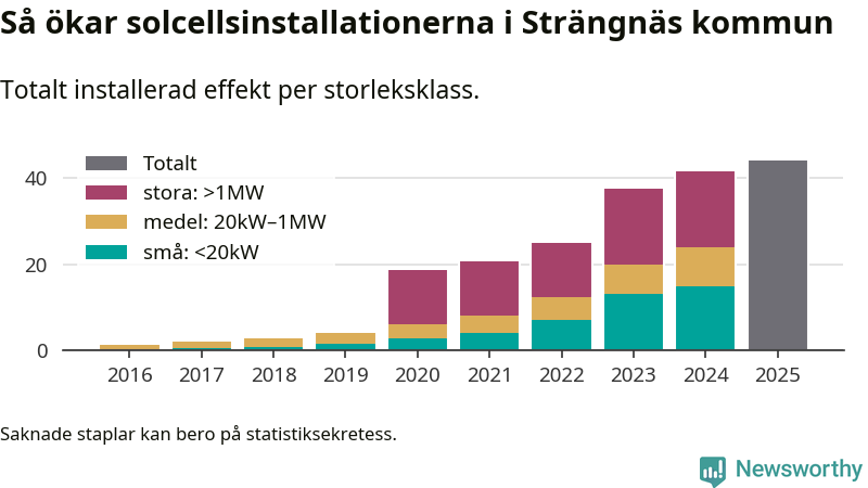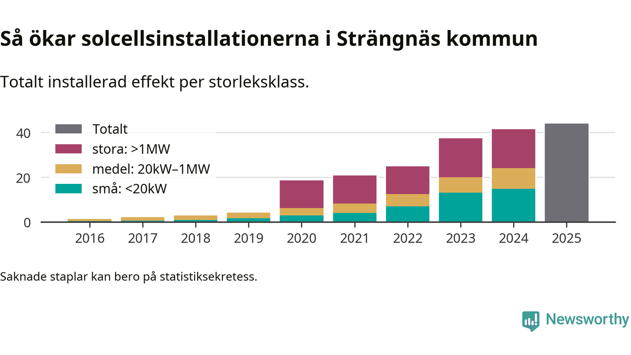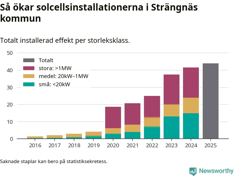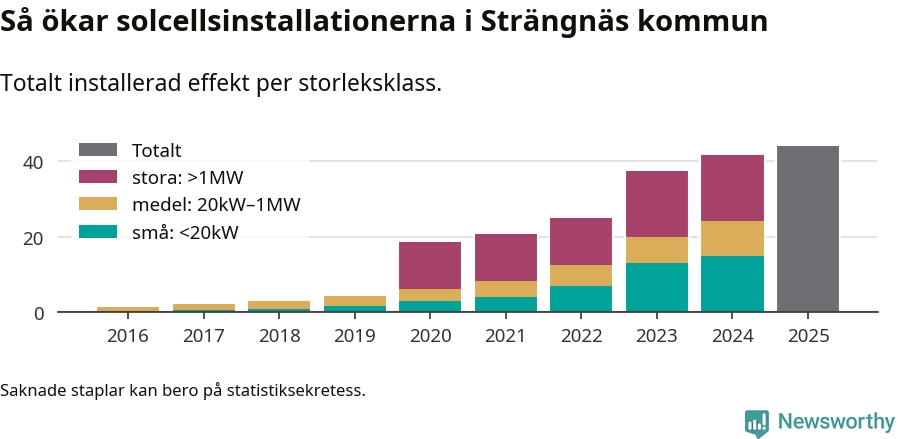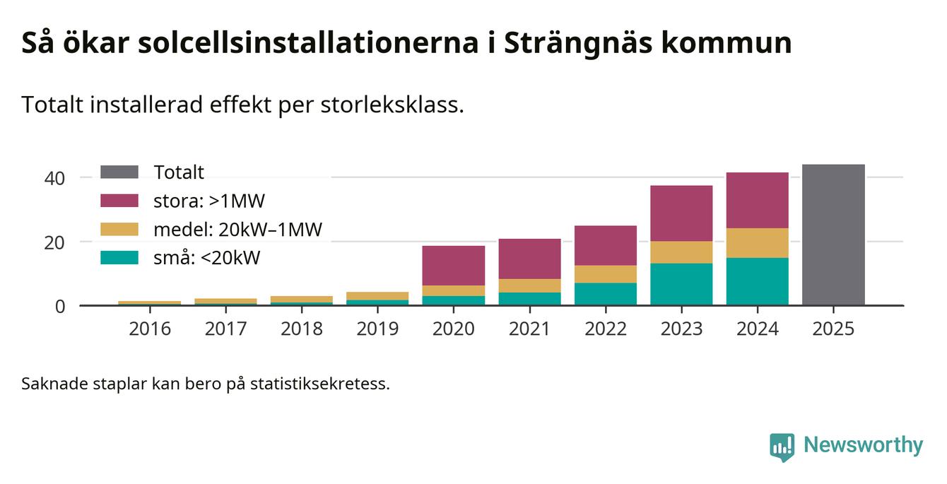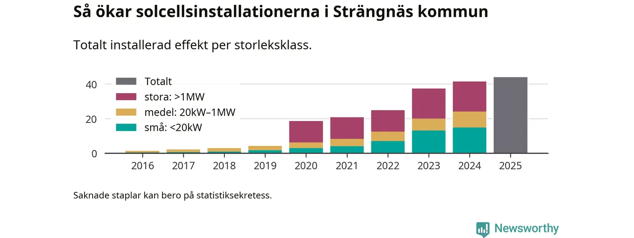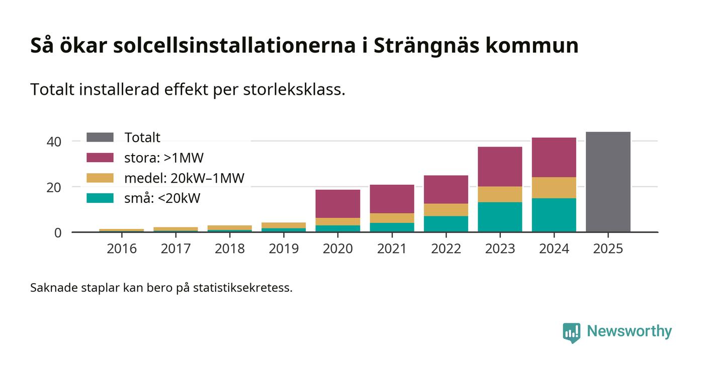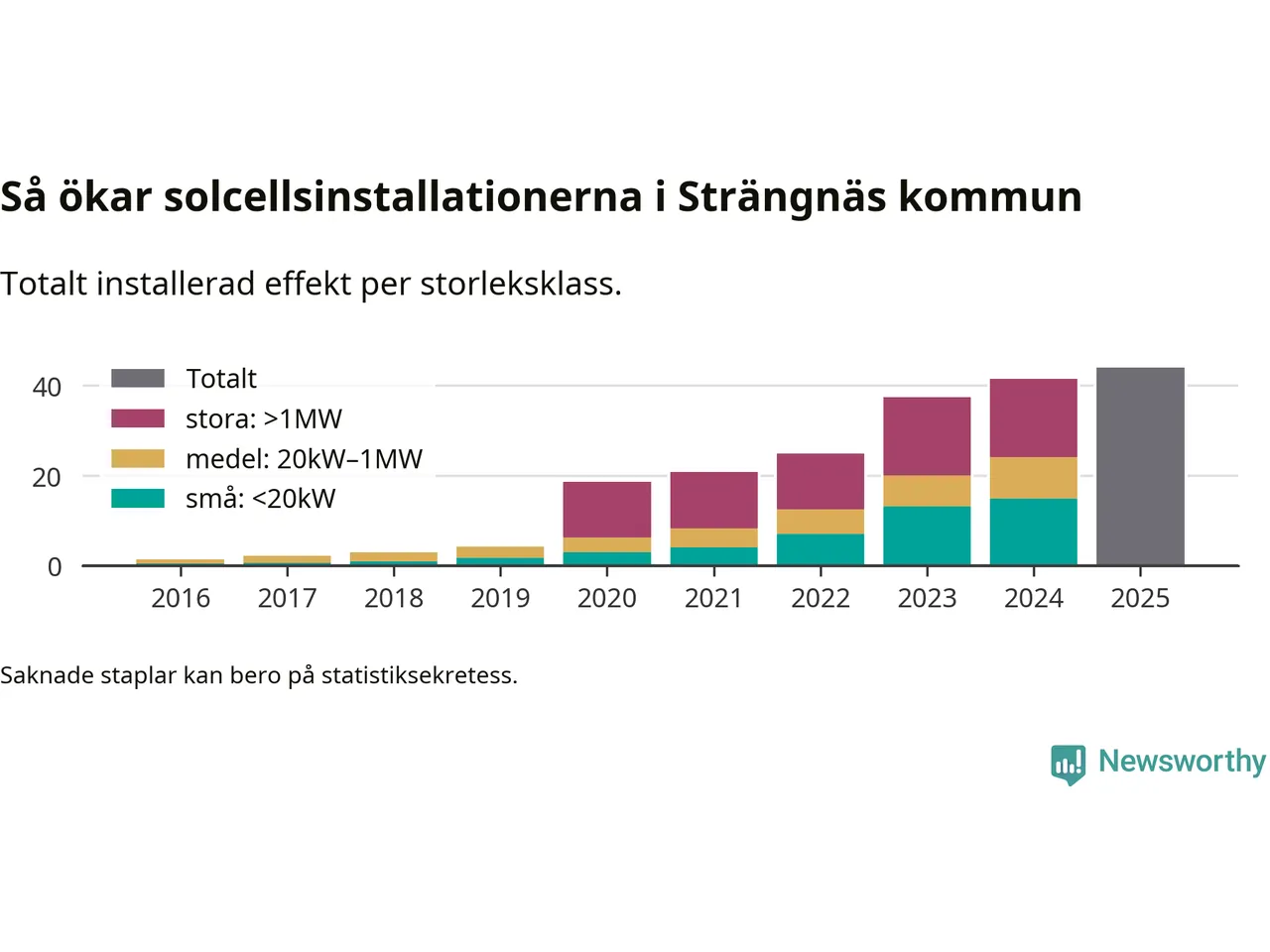 Under 2025 anslöts 2,5 megawatt ny solel till elnätet i Strängnäs kommun, en ökning med 6 procent jämfört med året innan.