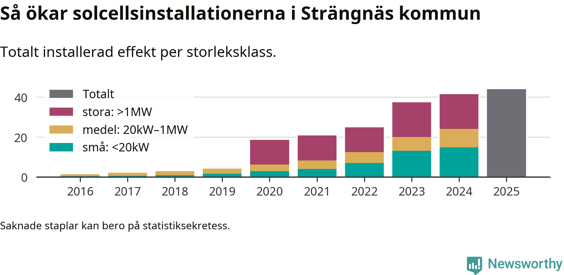 Det är framför allt de stora anläggningarna som driver tillväxten. Småskalig solel dominerar fortfarande produktionen – mer än hälften av effekten finns i anläggningar under 20 kilowatt – men det är bland de stora anläggningarna vi ser den största ökningstakten.