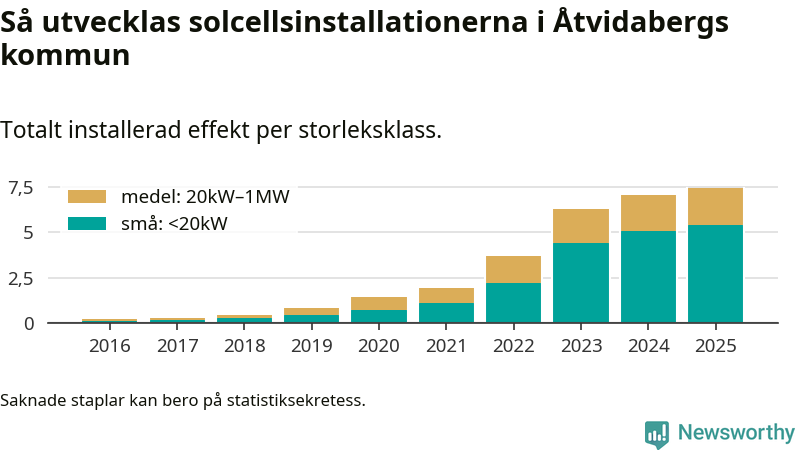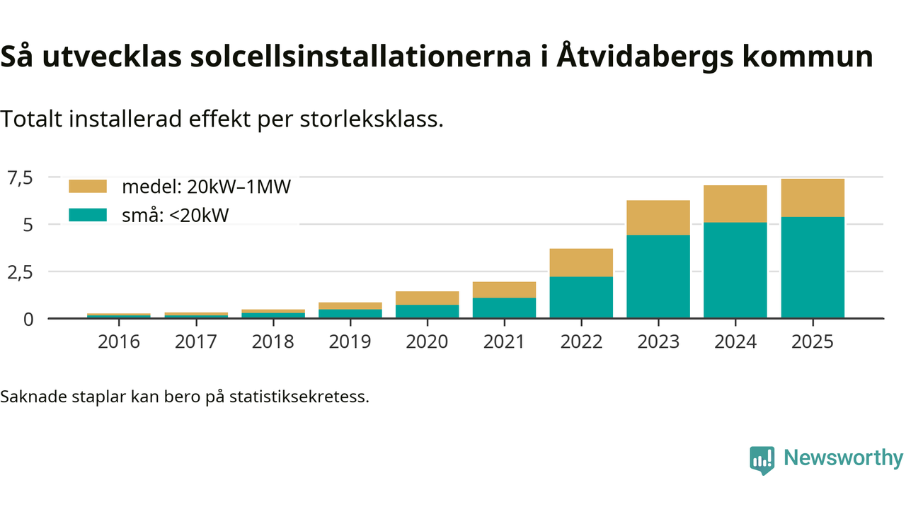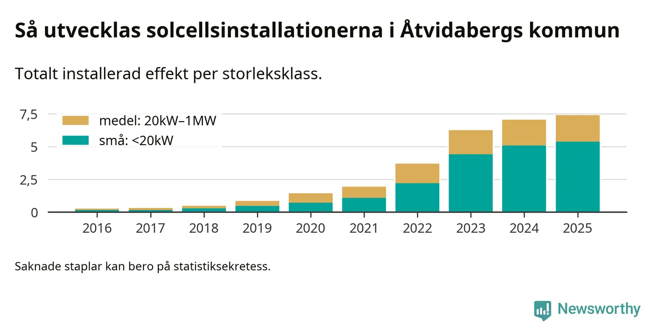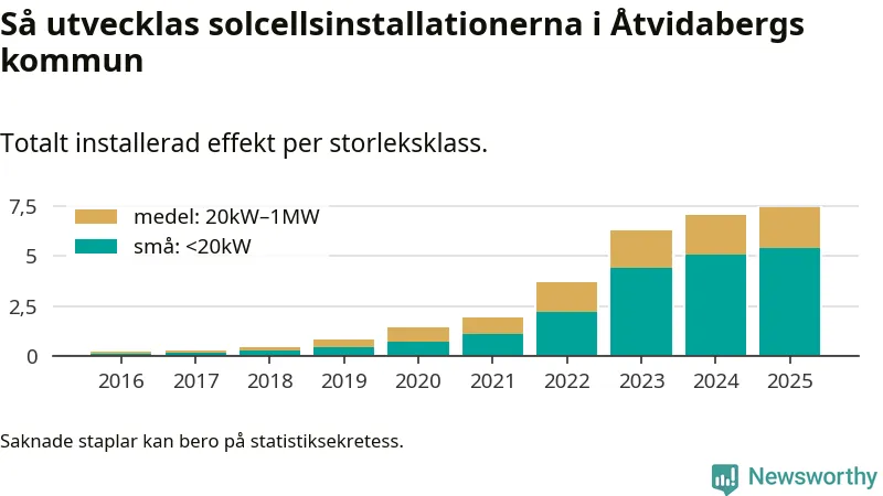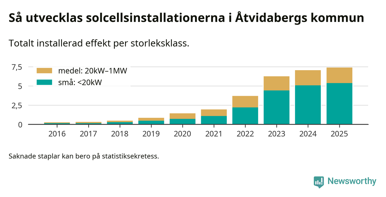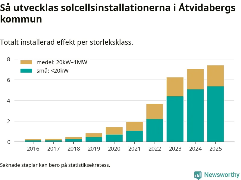 Det är framför allt de stora anläggningarna som driver tillväxten. Småskalig solel dominerar fortfarande produktionen – mer än hälften av effekten finns i anläggningar under 20 kilowatt – men det är bland de stora anläggningarna vi ser den största ökningstakten.