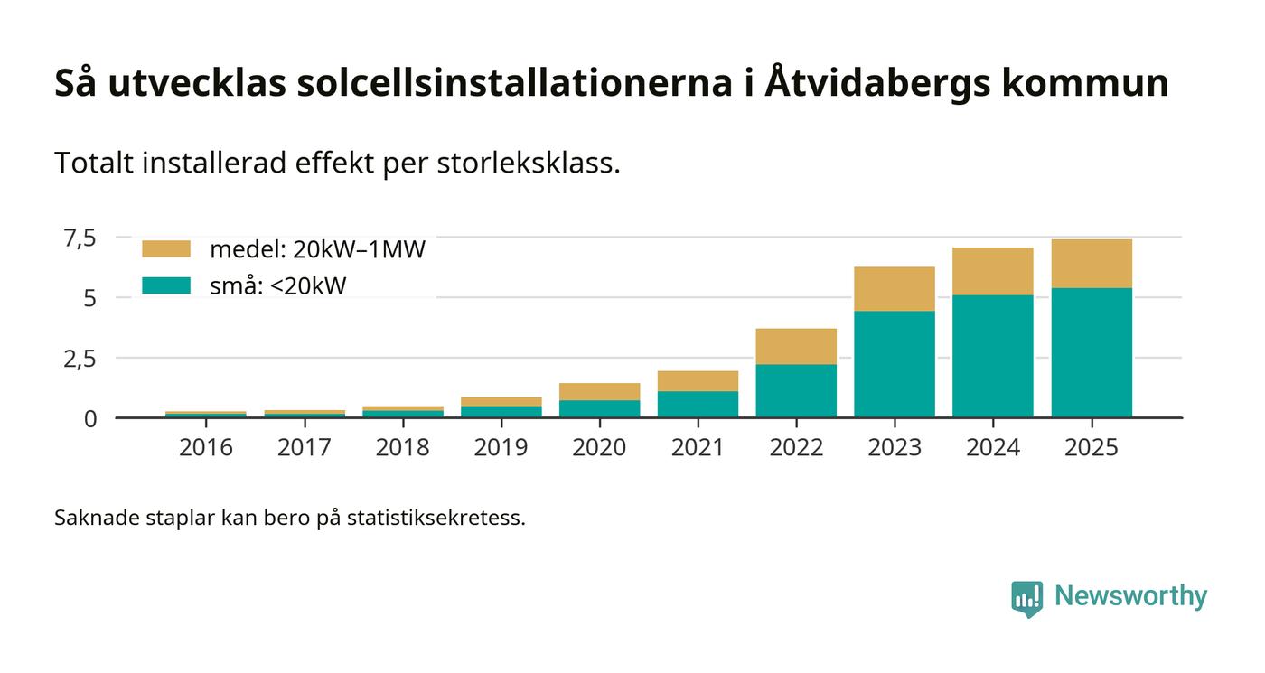 Totalt finns 589 nätanslutna anläggningar, om sammanlagt 7,4 megawatt i kommunen. Det motsvarar, i runda tal, en elproduktion på någonstans mellan 14 och 15 procent av vad hushållen i Åtvidaberg förbrukar per år.1