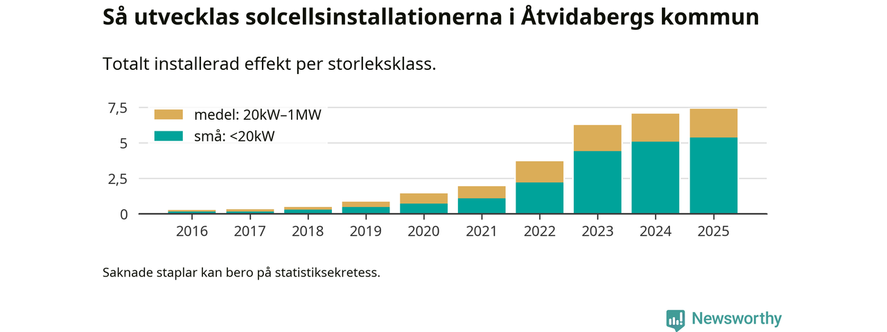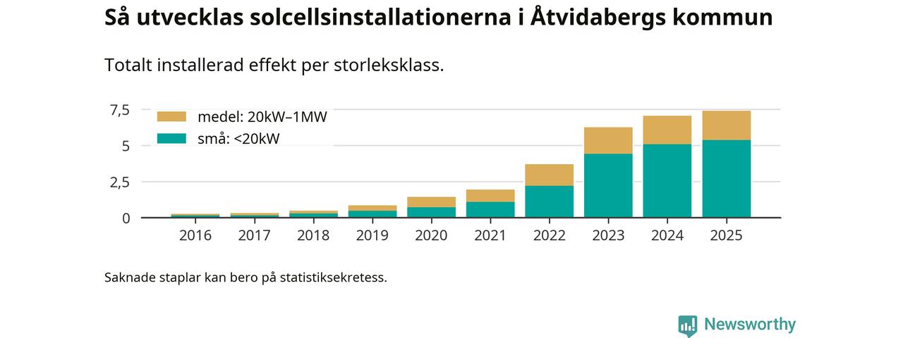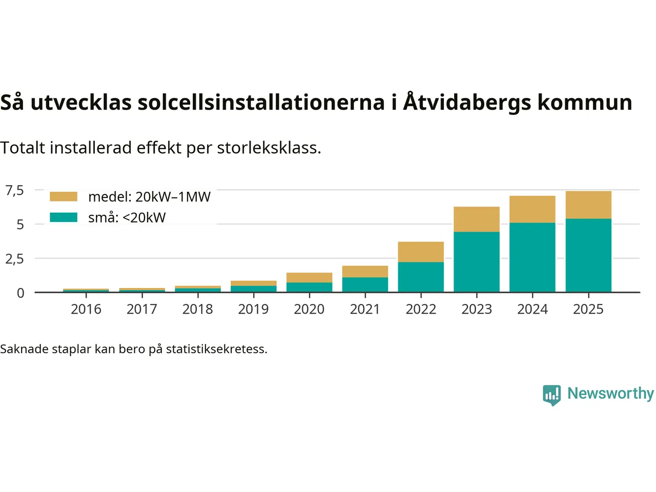 Under 2025 anslöts 350 kilowatt ny solel till elnätet i Åtvidabergs kommun, en ökning med 5 procent jämfört med året innan.