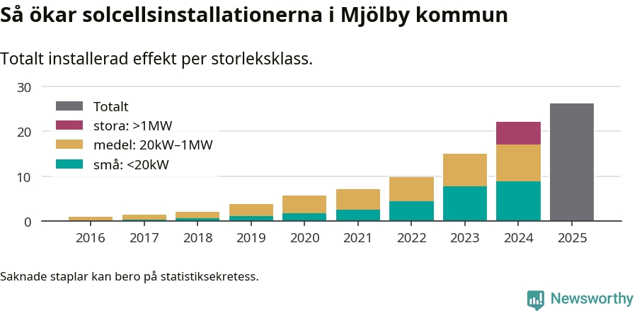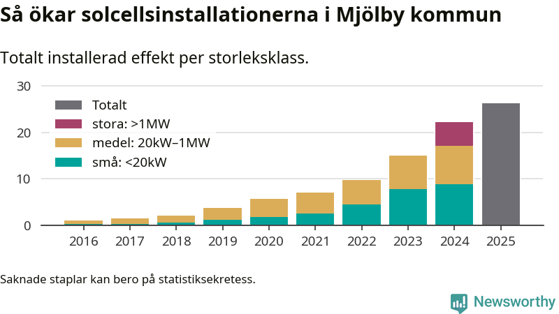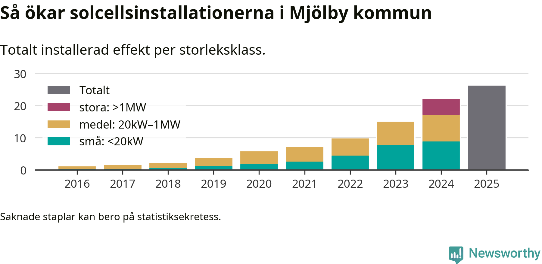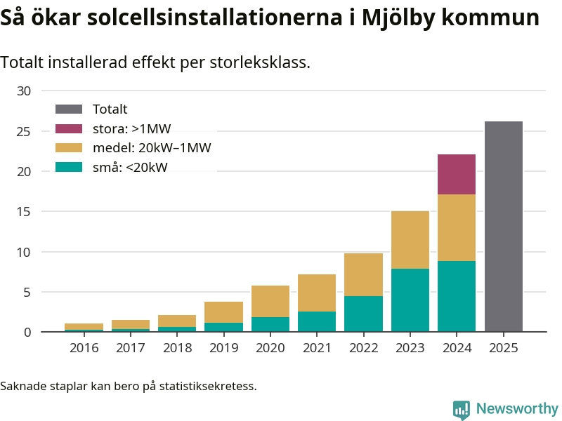 Det är framför allt de stora anläggningarna som driver tillväxten. Småskalig solel dominerar fortfarande produktionen – mer än hälften av effekten finns i anläggningar under 20 kilowatt – men det är bland de stora anläggningarna vi ser den största ökningstakten.