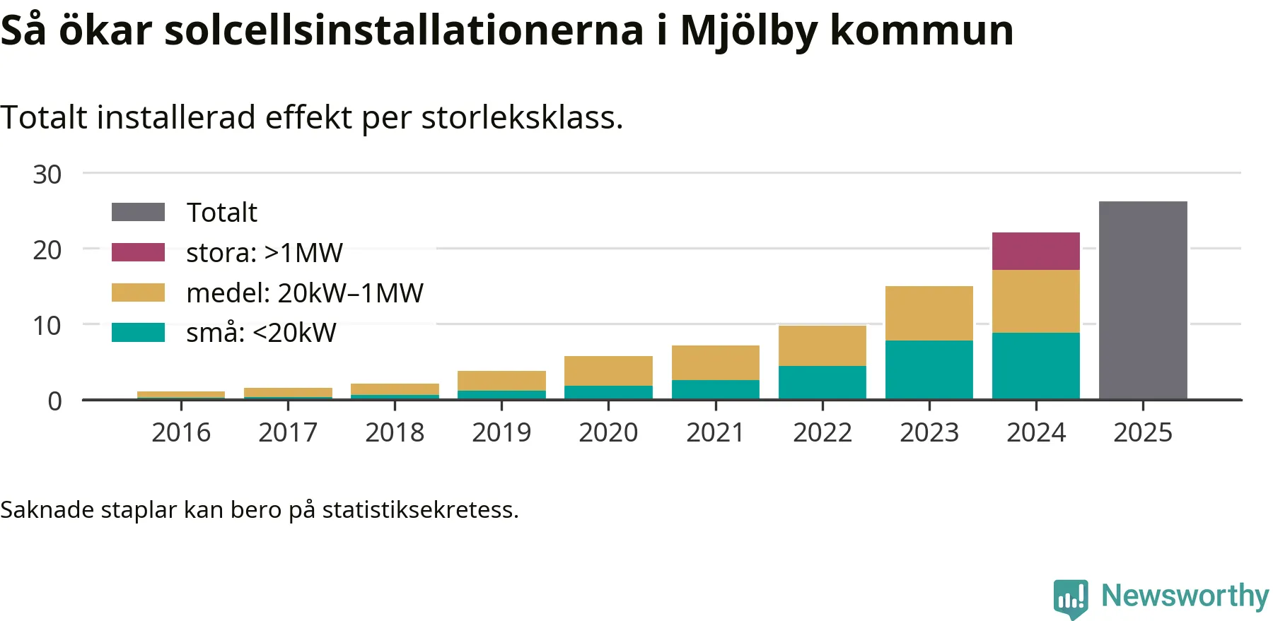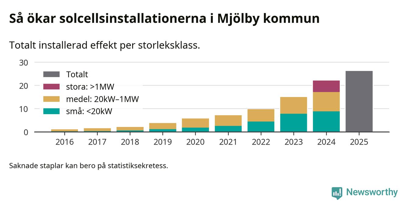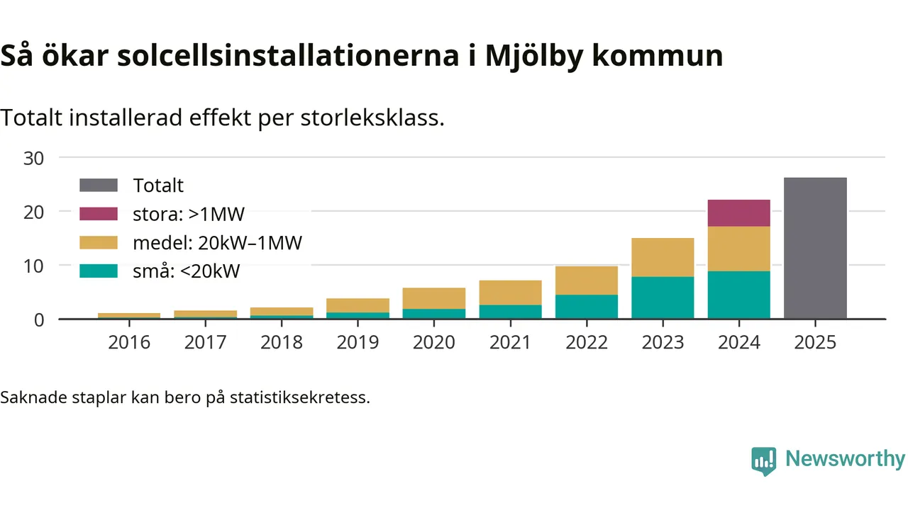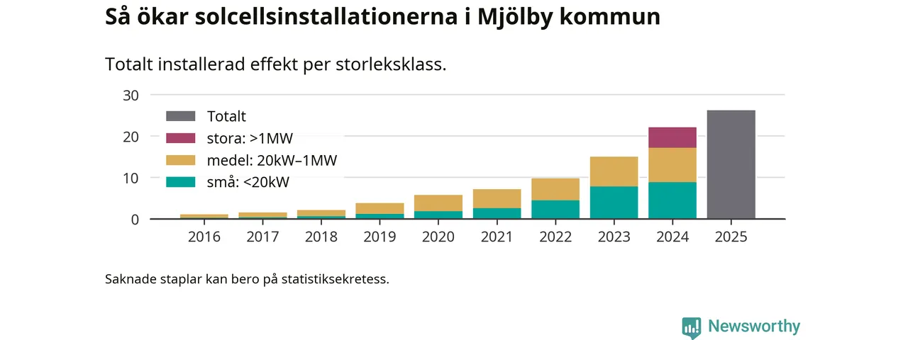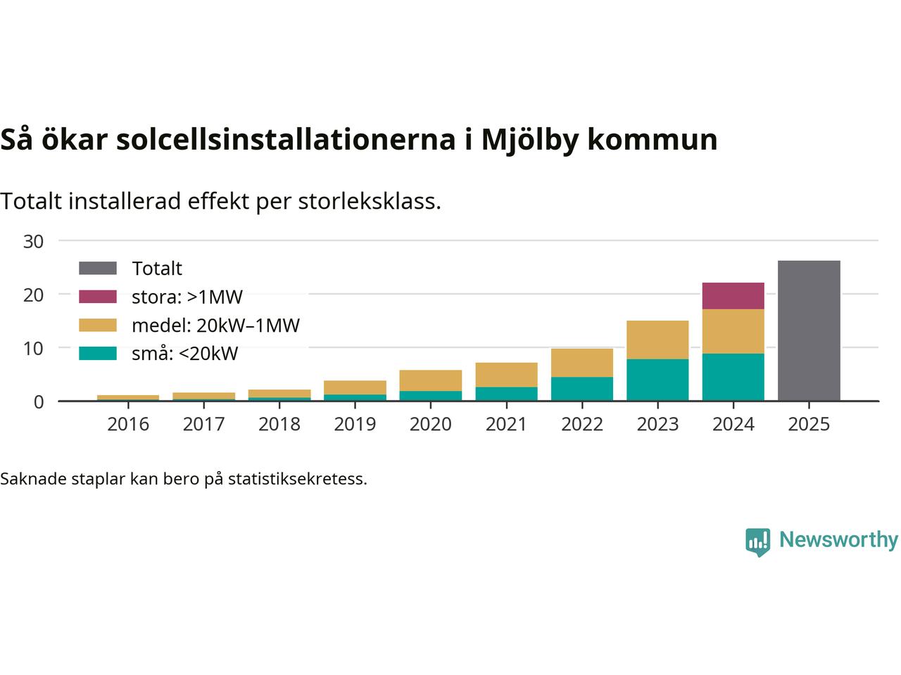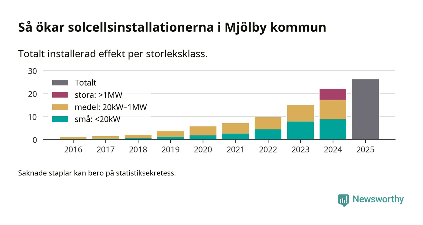Under 2025 anslöts 4,1 megawatt ny solel till elnätet i Mjölby kommun, en ökning med 18 procent jämfört med året innan.