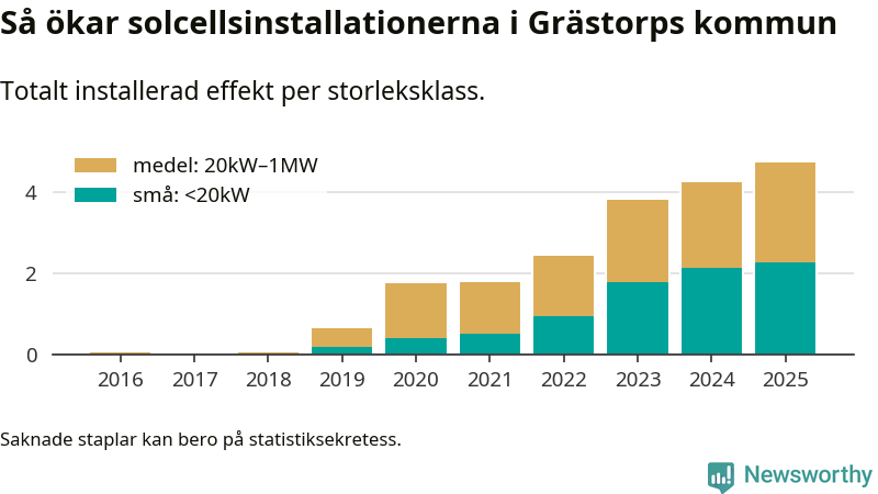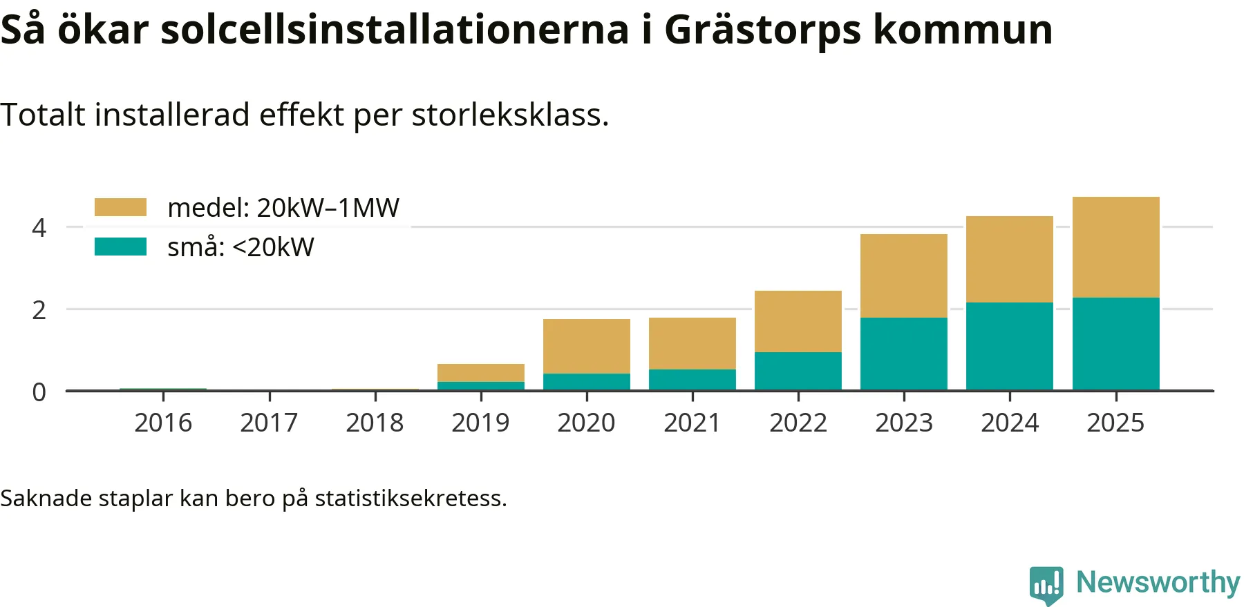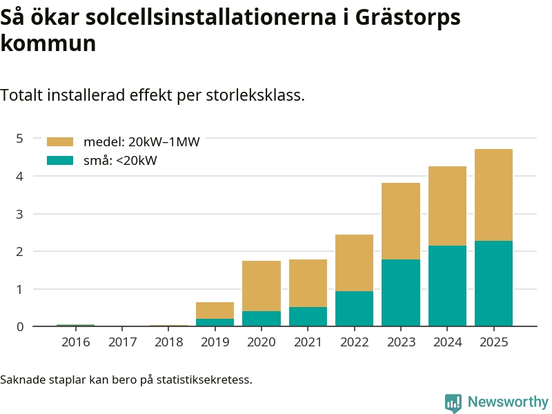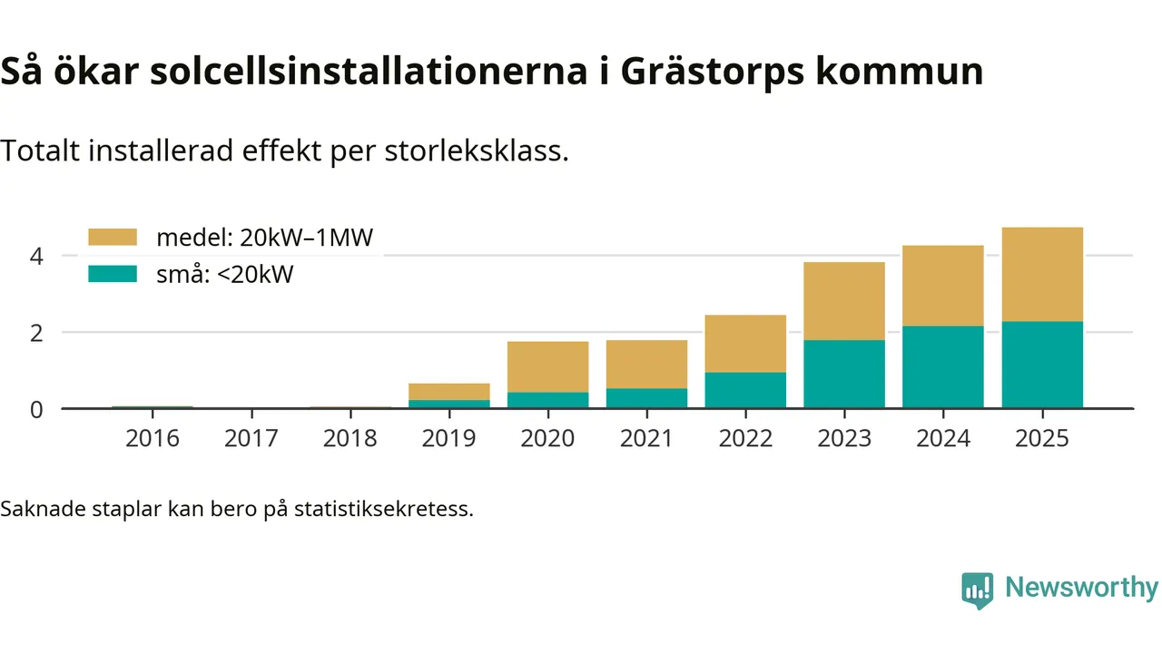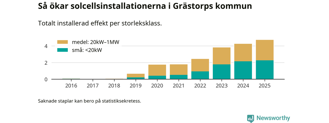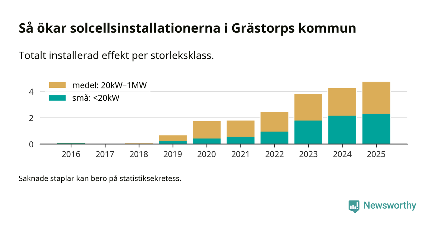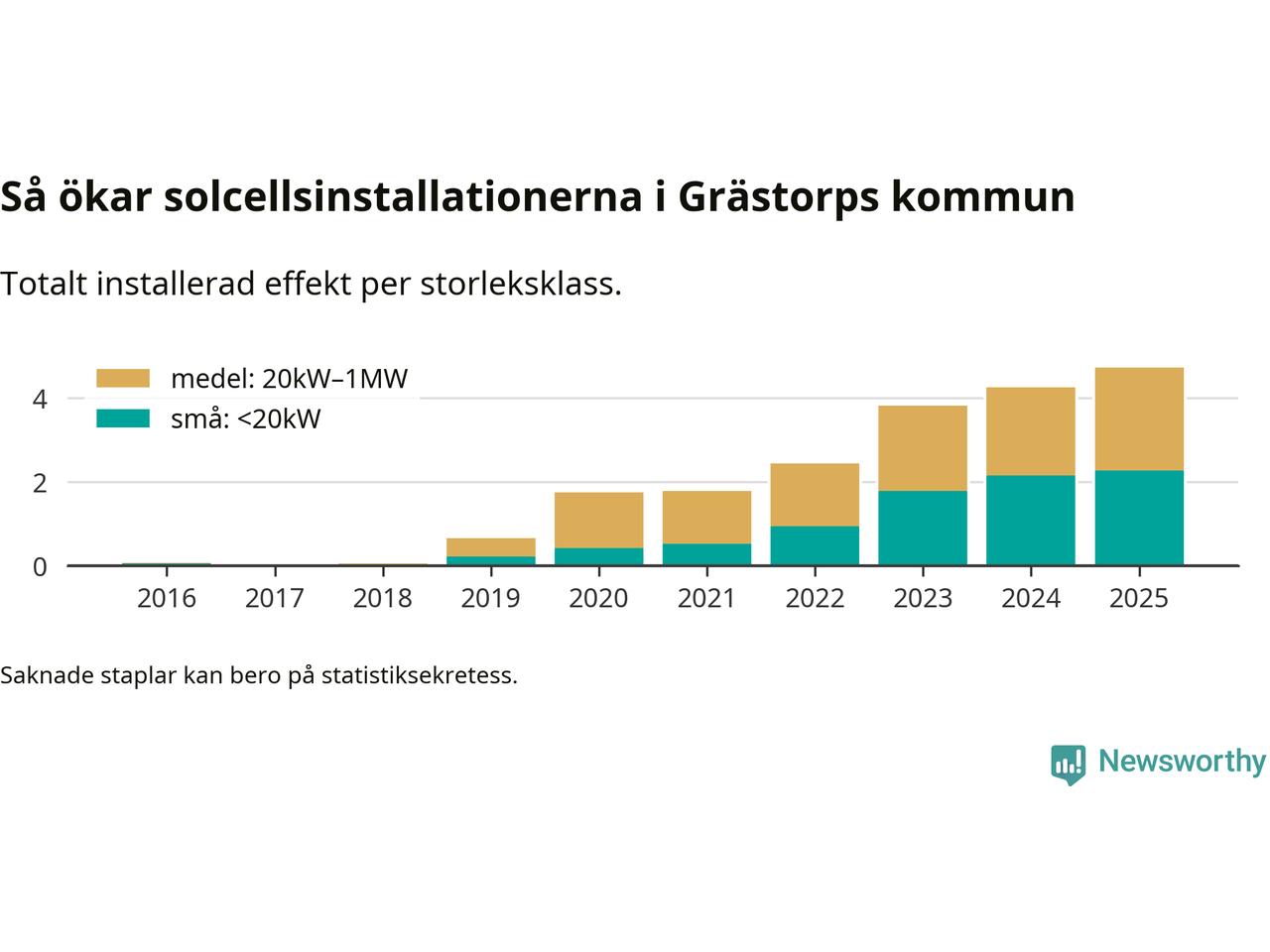 Den största delen av solelen i Grästorp, 52 procent, kommer från medelstora anläggningar, totalt 61 stycken. Det skiljer Grästorp från de flesta andra delar av landet, där de småskaliga installationerna dominerar. I hela Sverige står anläggningar under 20 kilowatt för mer än hälften av den installerade effekten. Generellt är deras andel störst i kommuner med många villahushåll, medan större anläggningar dominerar i tätbefolkade kommuner med fler flerfamiljsbostäder – och förstås i de småkommuner som har någon av landets stora markanläggningar för solel.