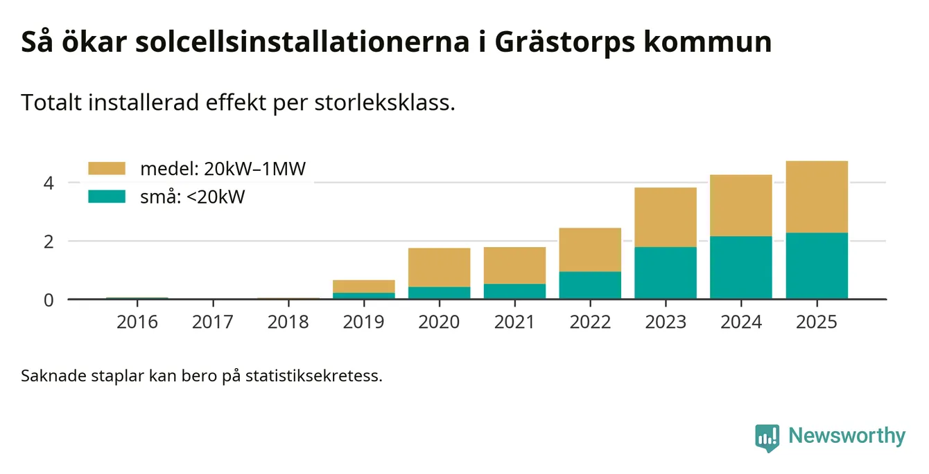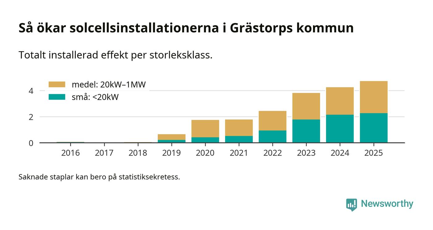 Under 2025 anslöts 470 kilowatt ny solel till elnätet i Grästorps kommun, en ökning med 11 procent jämfört med året innan.