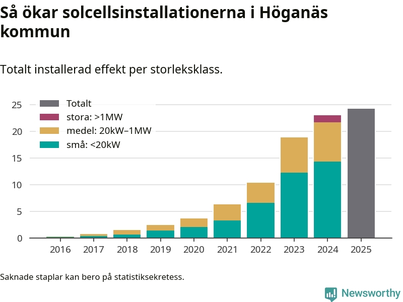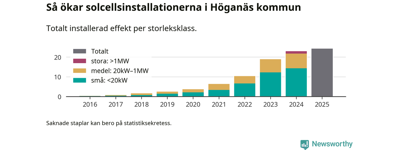 Det är framför allt de stora anläggningarna som driver tillväxten. Småskalig solel dominerar fortfarande produktionen – mer än hälften av effekten finns i anläggningar under 20 kilowatt – men det är bland de stora anläggningarna vi ser den största ökningstakten.