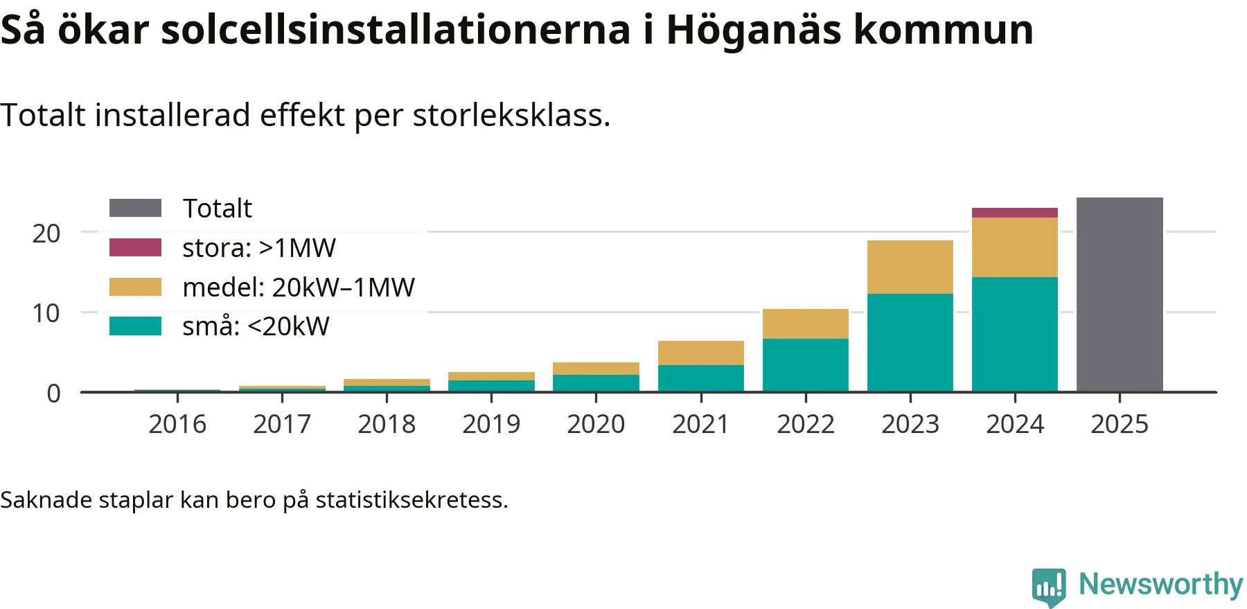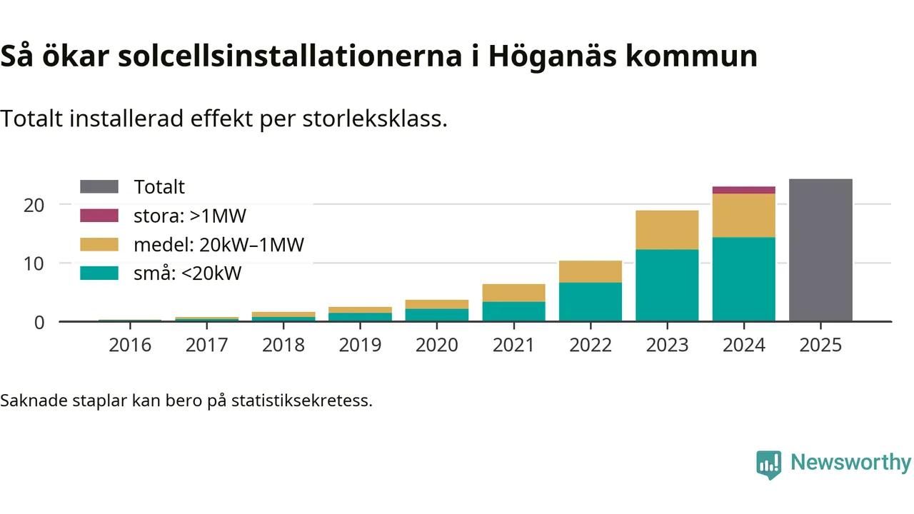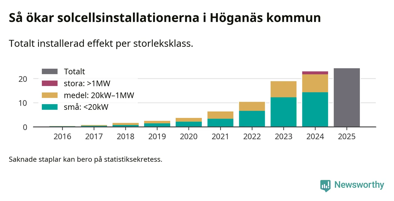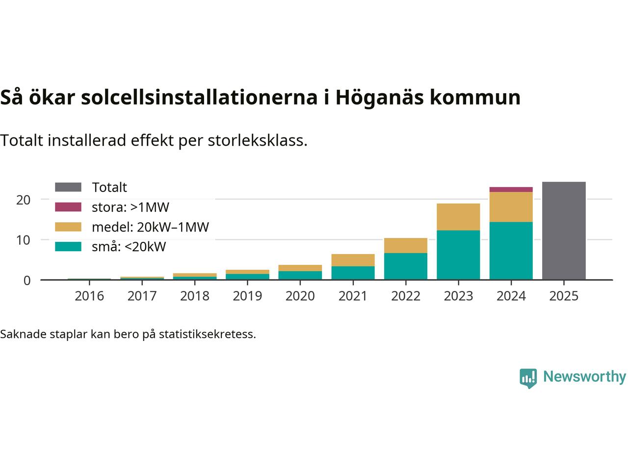 Under 2025 anslöts 1,3 megawatt ny solel till elnätet i Höganäs kommun, en ökning med 6 procent jämfört med året innan.