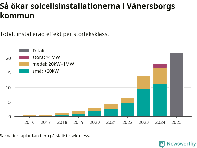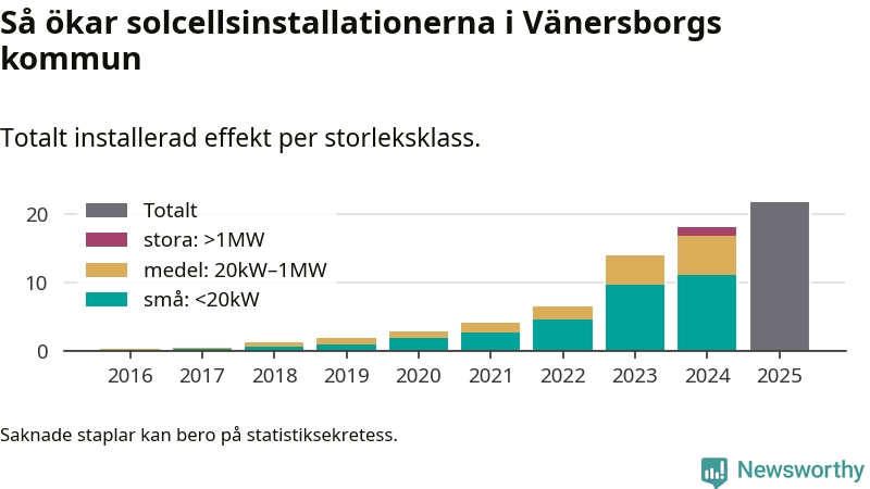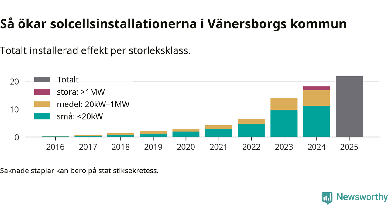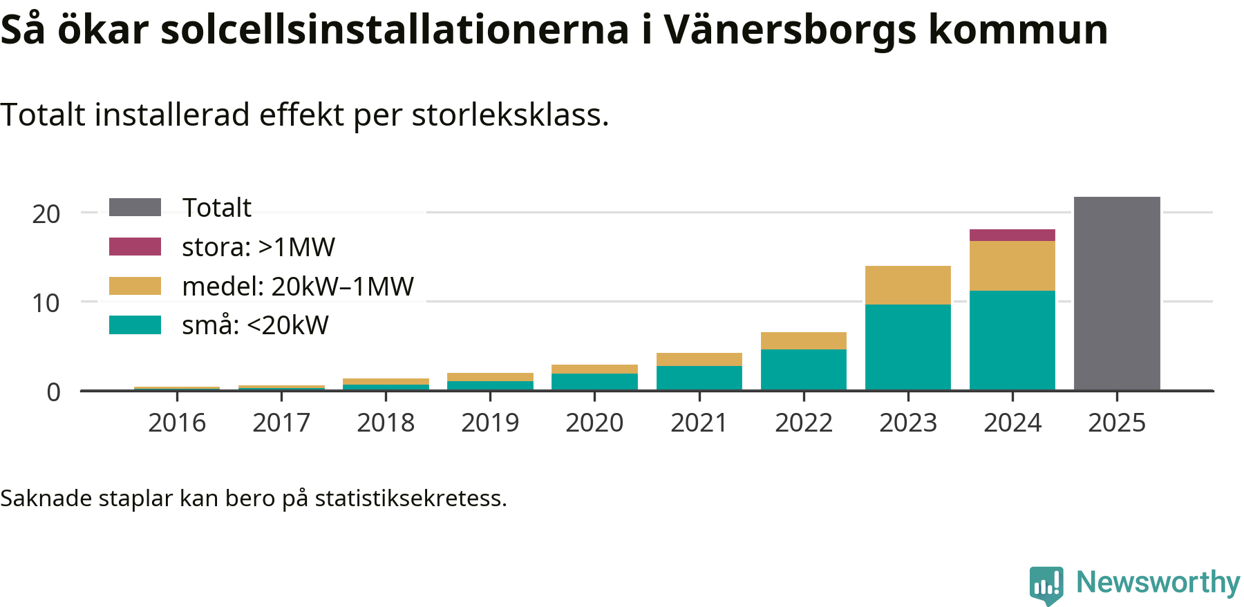 Det är framför allt de stora anläggningarna som driver tillväxten. Småskalig solel dominerar fortfarande produktionen – mer än hälften av effekten finns i anläggningar under 20 kilowatt – men det är bland de stora anläggningarna vi ser den största ökningstakten.