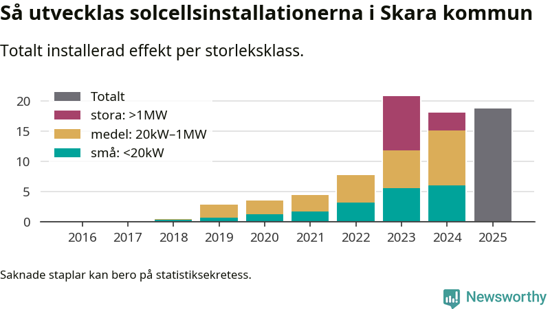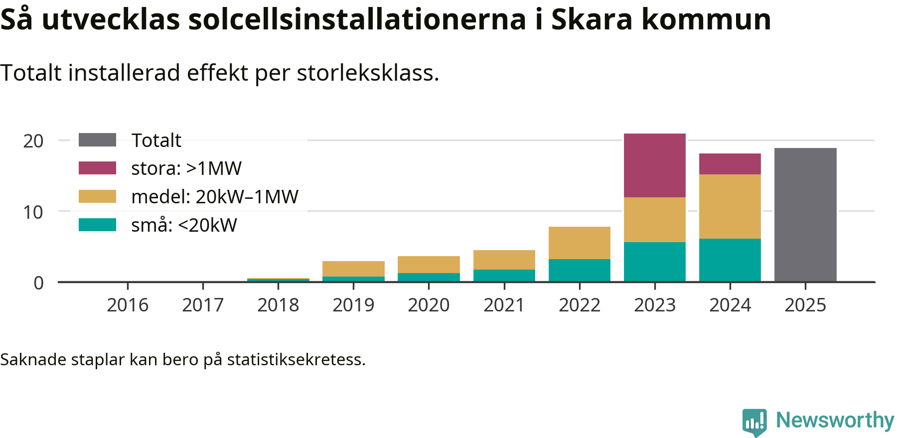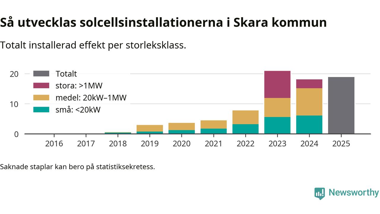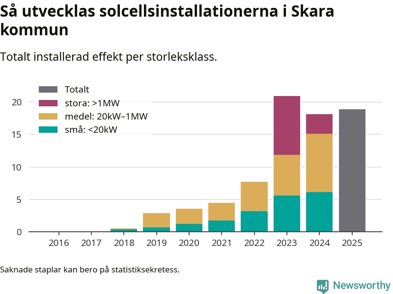Det är framför allt de stora anläggningarna som driver tillväxten. Småskalig solel dominerar fortfarande produktionen – mer än hälften av effekten finns i anläggningar under 20 kilowatt – men det är bland de stora anläggningarna vi ser den största ökningstakten.