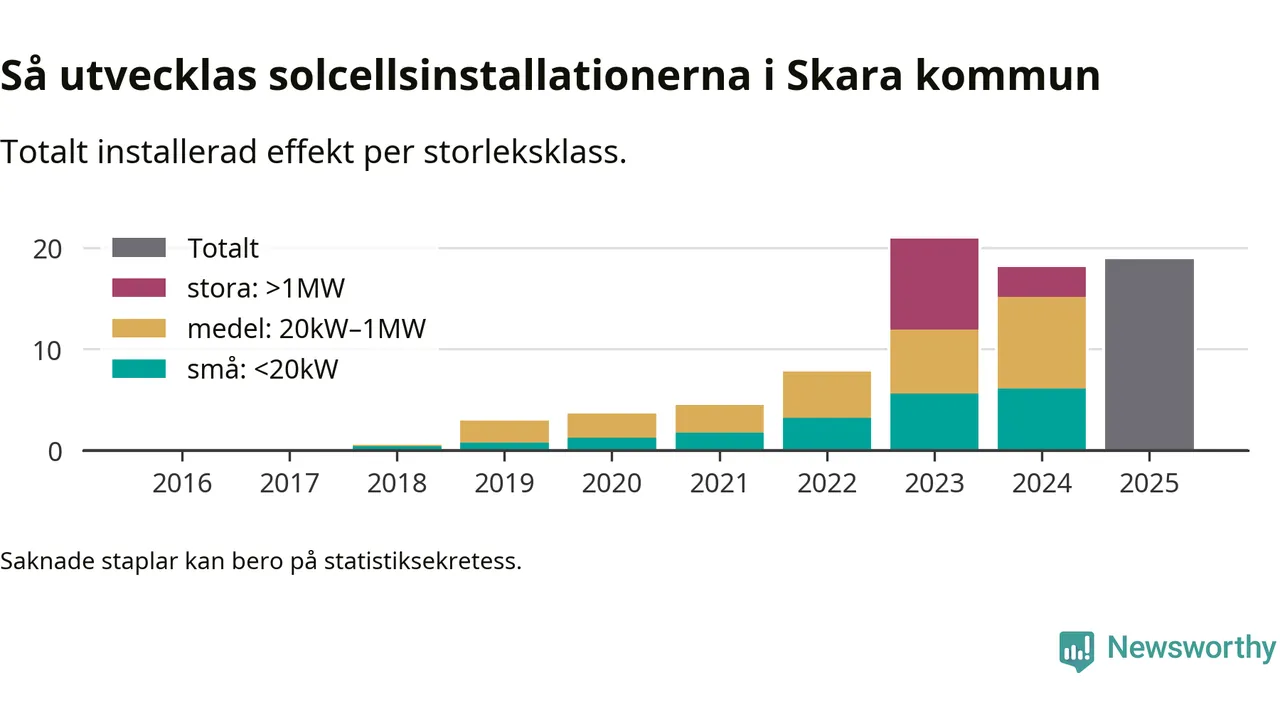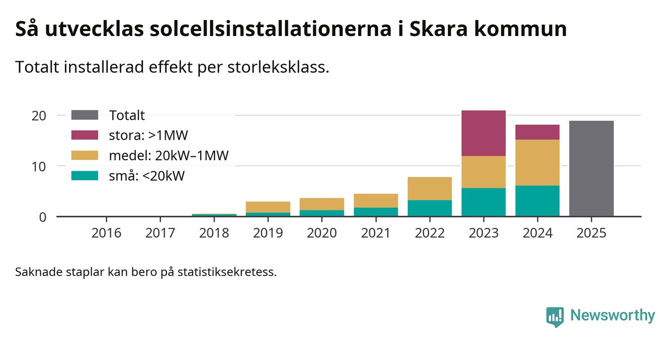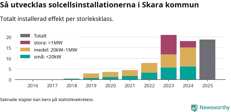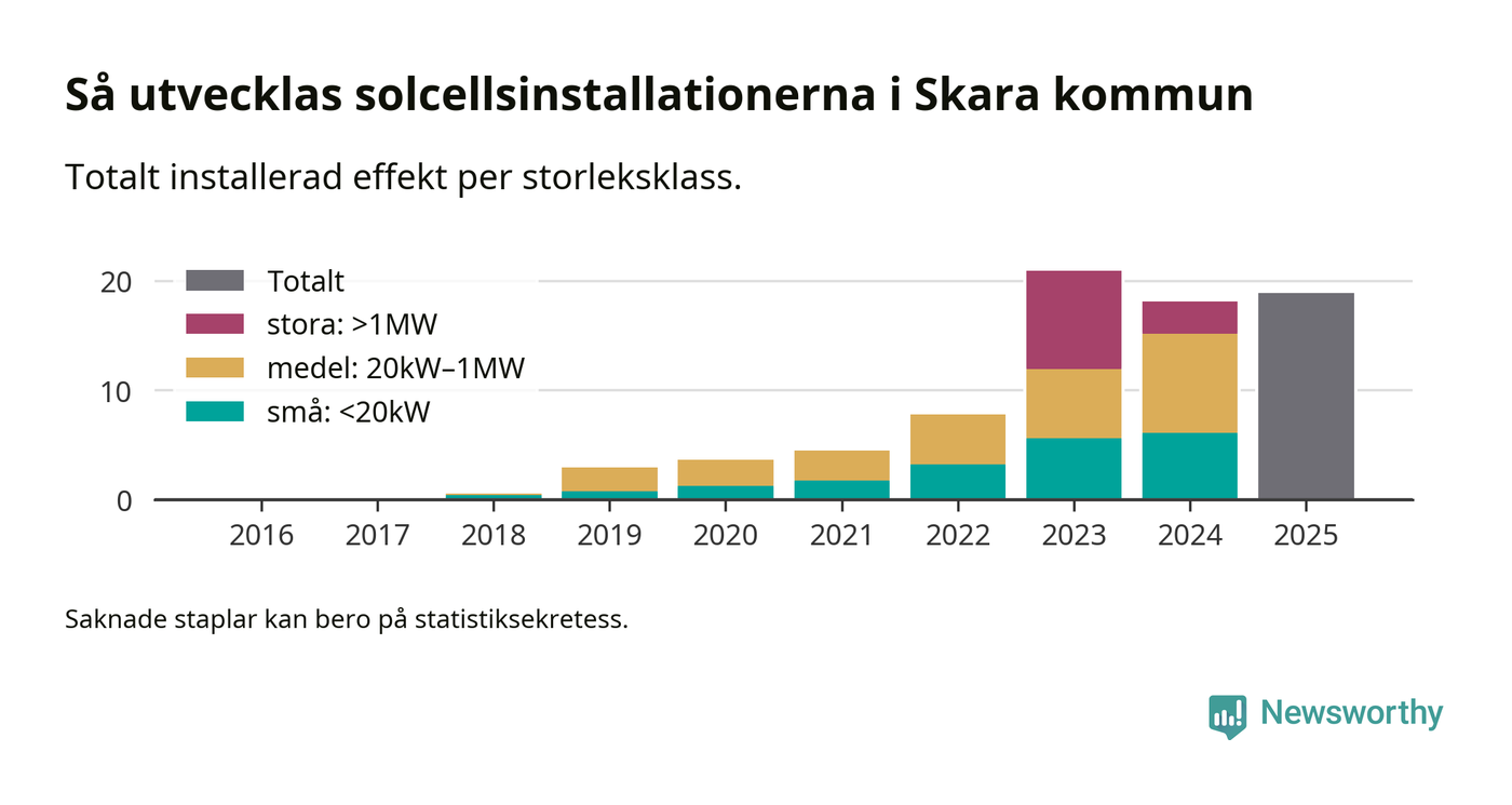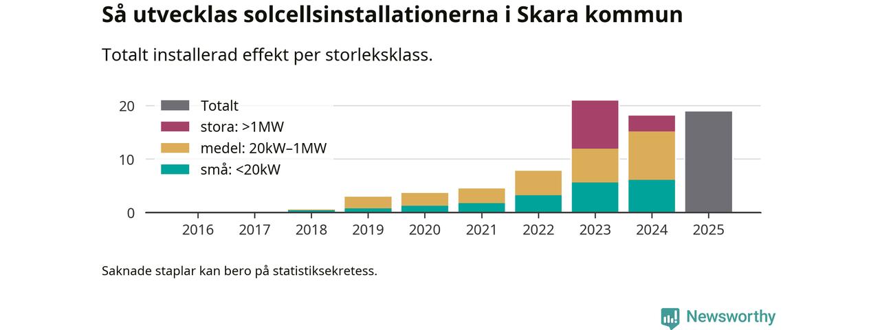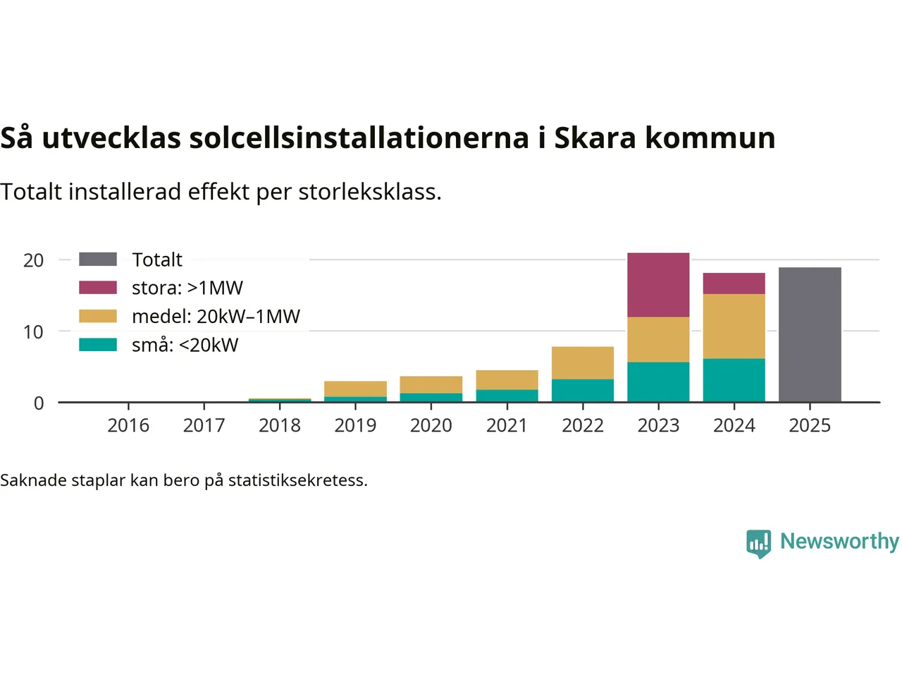 Under 2025 anslöts 0,7 megawatt ny solel till elnätet i Skara kommun, en ökning med 4 procent jämfört med året innan.