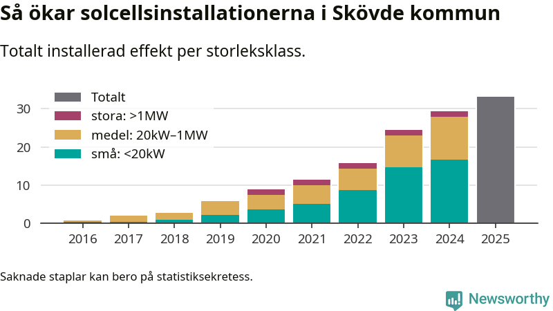 Totalt finns 1 788 nätanslutna anläggningar, om sammanlagt 33,2 megawatt i kommunen. Det motsvarar, i runda tal, en elproduktion på någonstans mellan 17 och 21 procent av vad hushållen i Skövde förbrukar per år.1