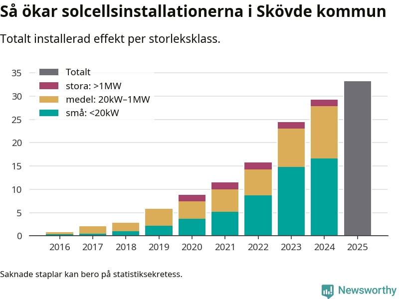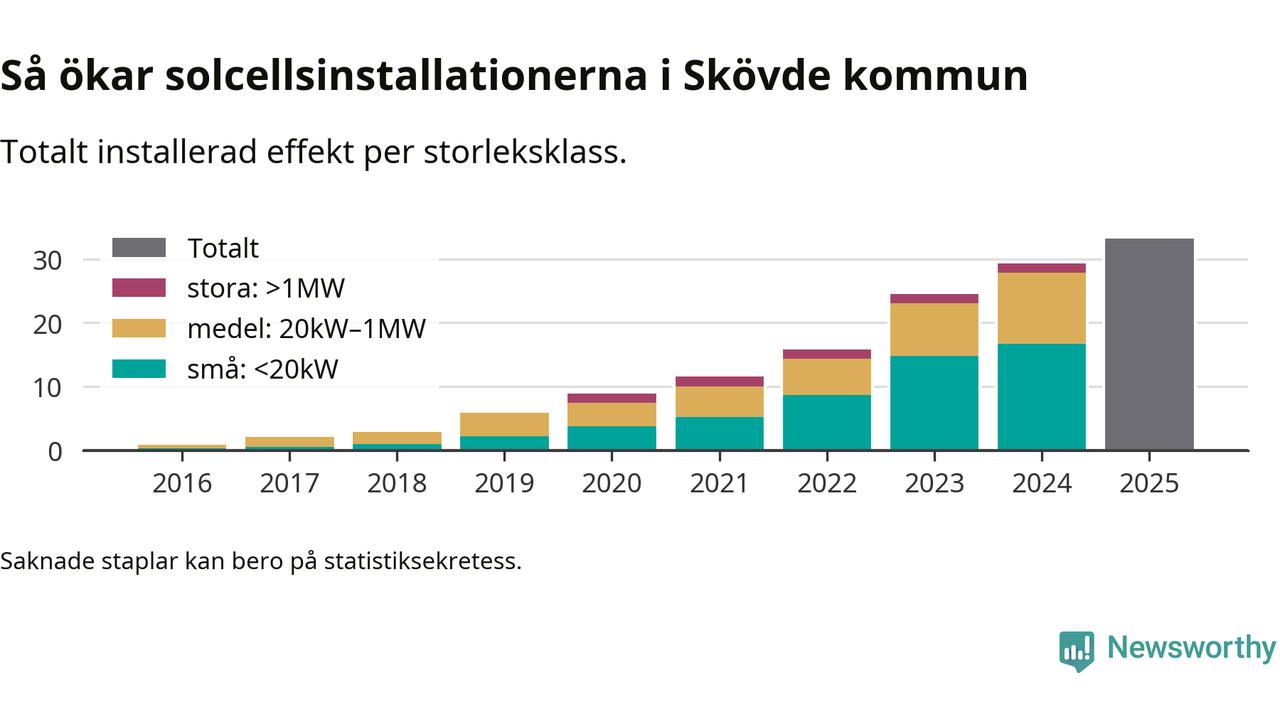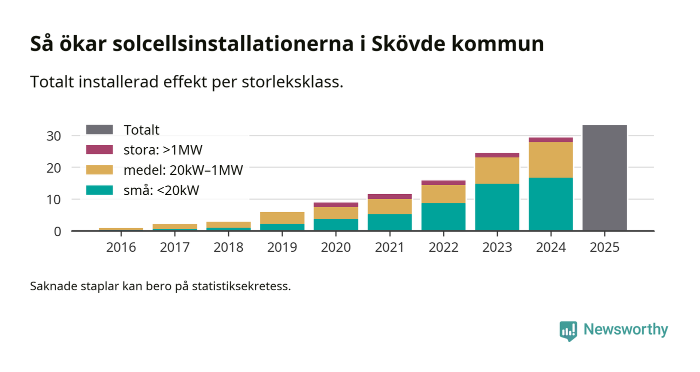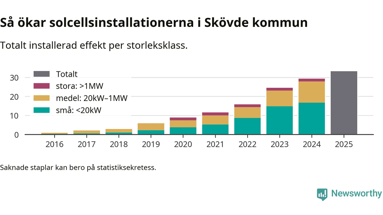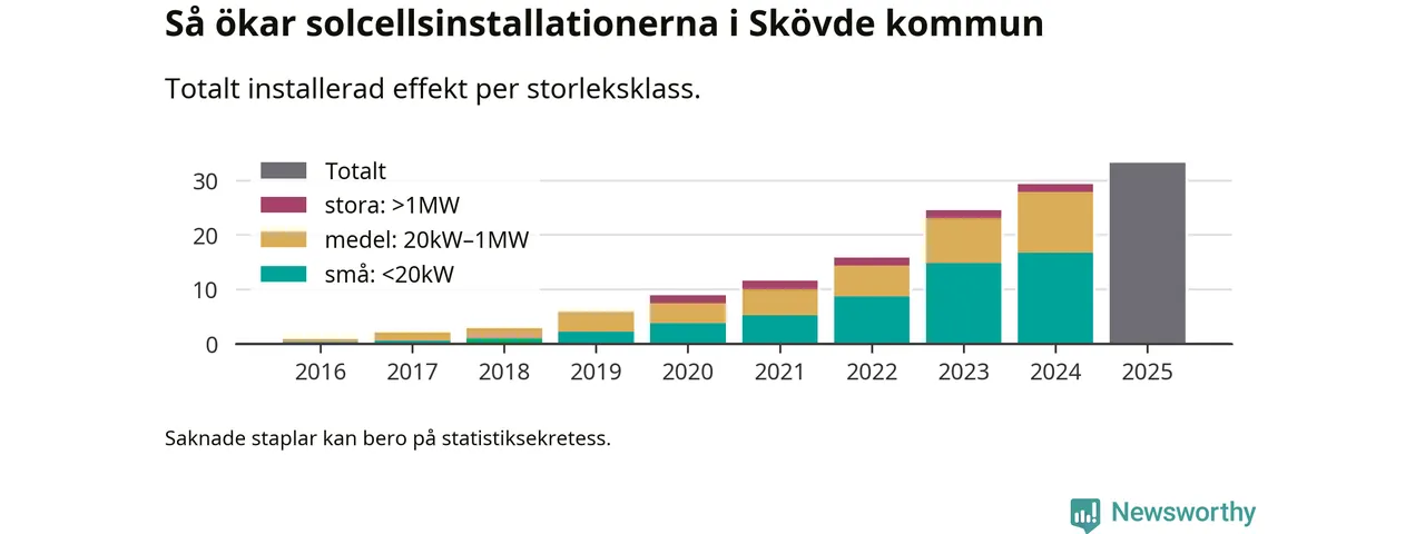 Antalet solcellsinstallationer i Sverige ökar, men i Skövde kommun var utbyggnadstakten under 2025 mindre än i riket i stort. Det visar ny statistik från Energimyndigheten.
