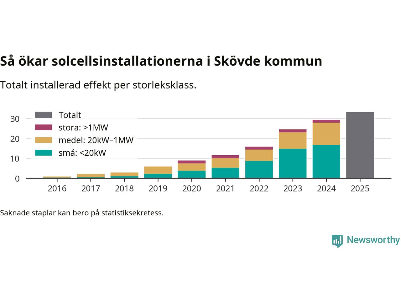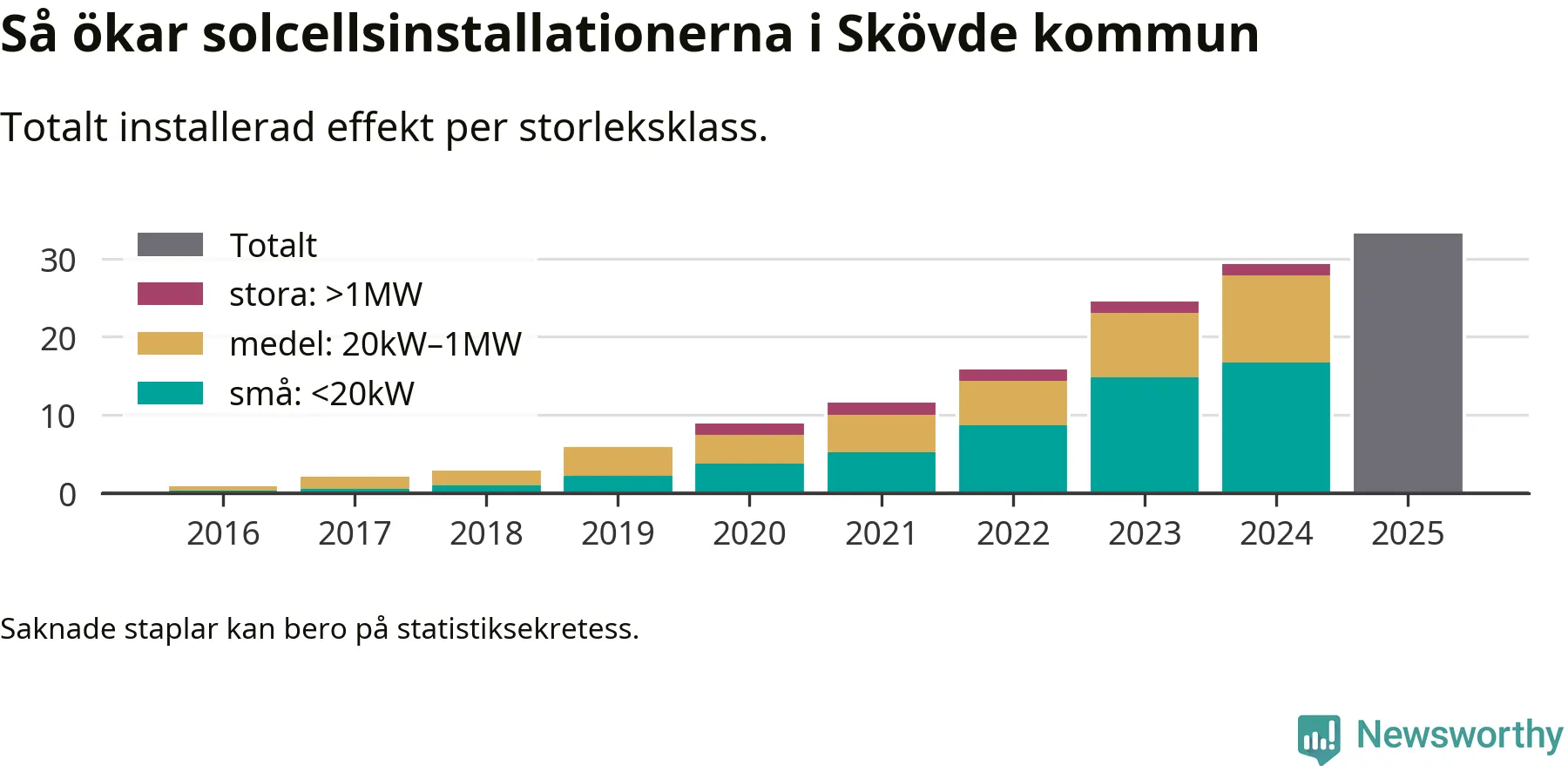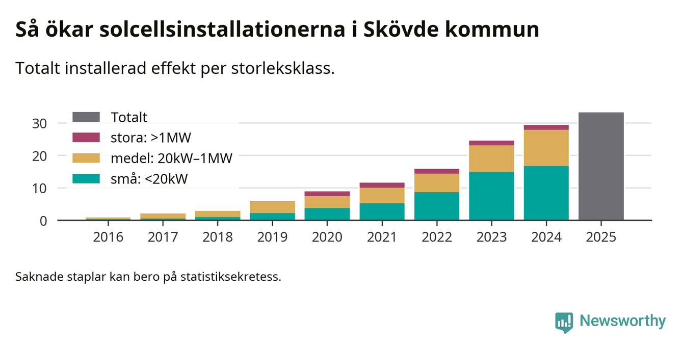 Det är framför allt de stora anläggningarna som driver tillväxten. Småskalig solel dominerar fortfarande produktionen – mer än hälften av effekten finns i anläggningar under 20 kilowatt – men det är bland de stora anläggningarna vi ser den största ökningstakten.