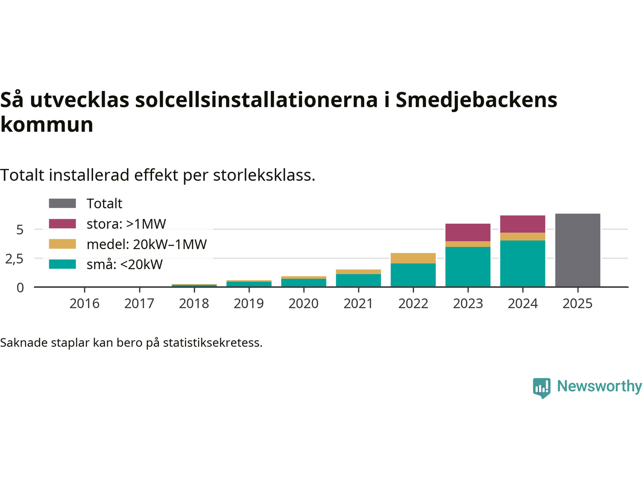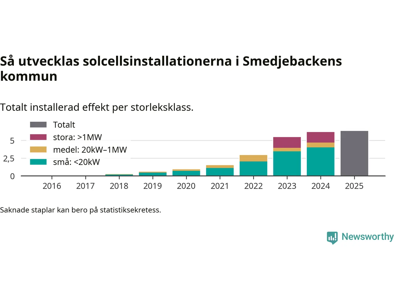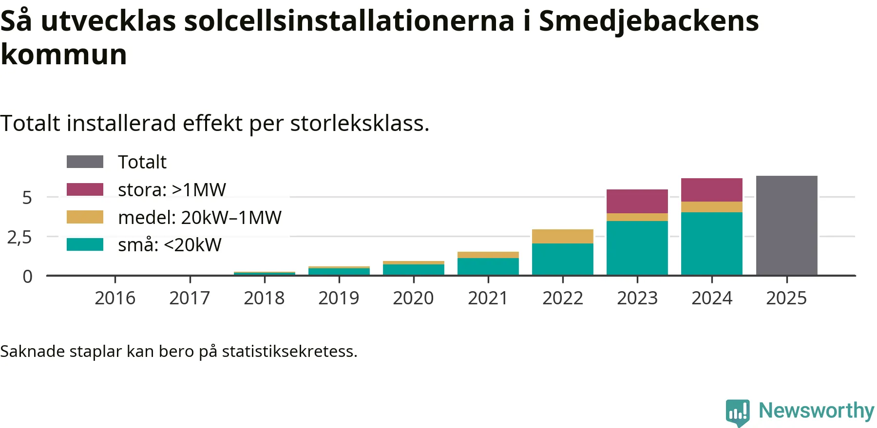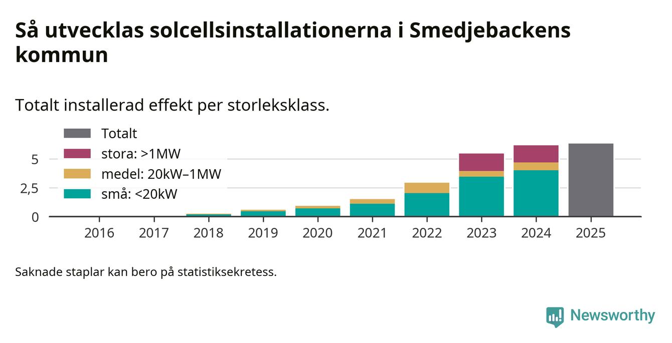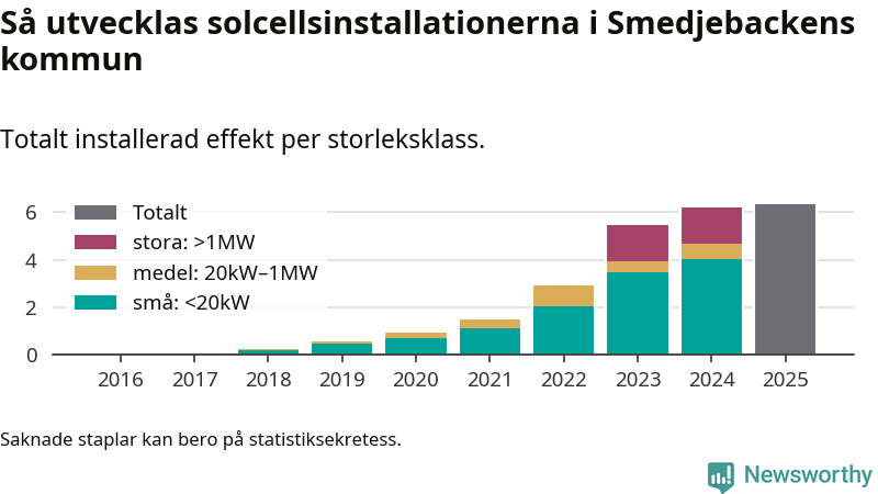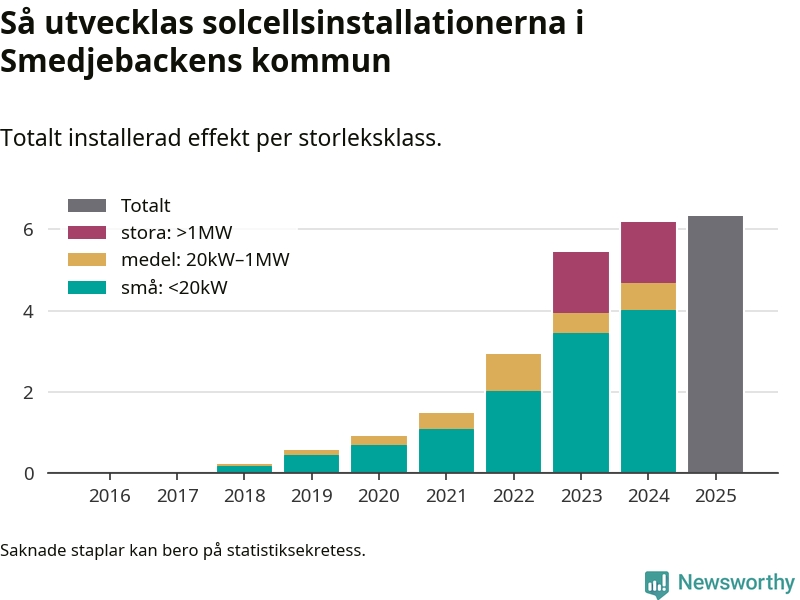 Det är framför allt de stora anläggningarna som driver tillväxten. Småskalig solel dominerar fortfarande produktionen – mer än hälften av effekten finns i anläggningar under 20 kilowatt – men det är bland de stora anläggningarna vi ser den största ökningstakten.