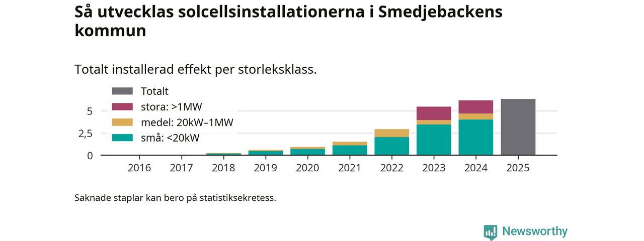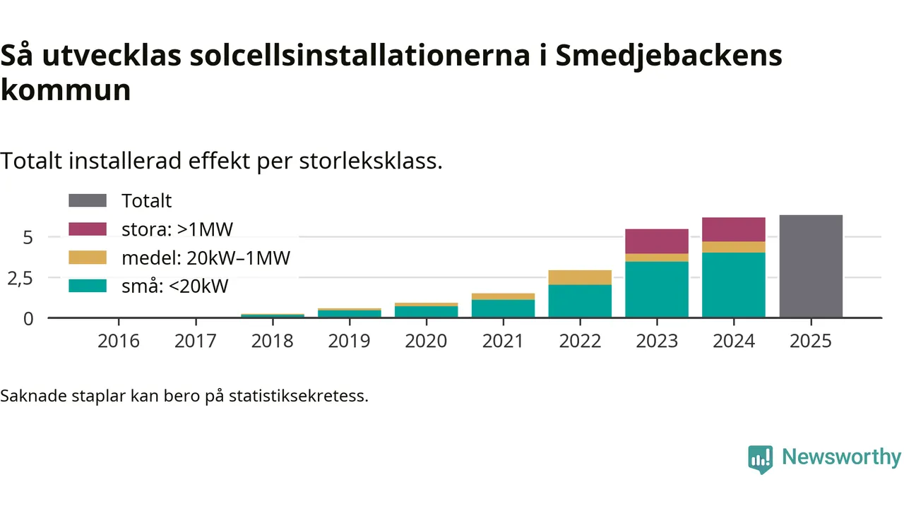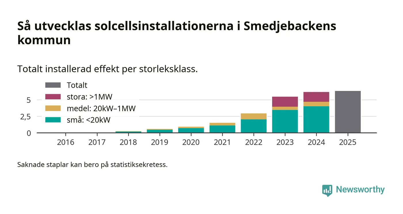 Under 2025 anslöts 160 kilowatt ny solel till elnätet i Smedjebackens kommun, en ökning med 3 procent jämfört med året innan.