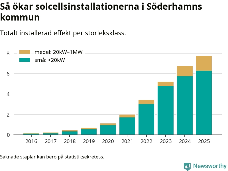 Den största delen av solelen i Söderhamn, 81 procent, kommer från småskaliga anläggningar, totalt 617 stycken. Det påminner om hur det ser ut i riket som helhet. I hela Sverige står anläggningar under 20 kilowatt för mer än hälften av den installerade effekten. Generellt är deras andel störst i kommuner med många villahushåll, medan större anläggningar dominerar i tätbefolkade kommuner med fler flerfamiljsbostäder – och förstås i de småkommuner som har någon av landets stora markanläggningar för solel.