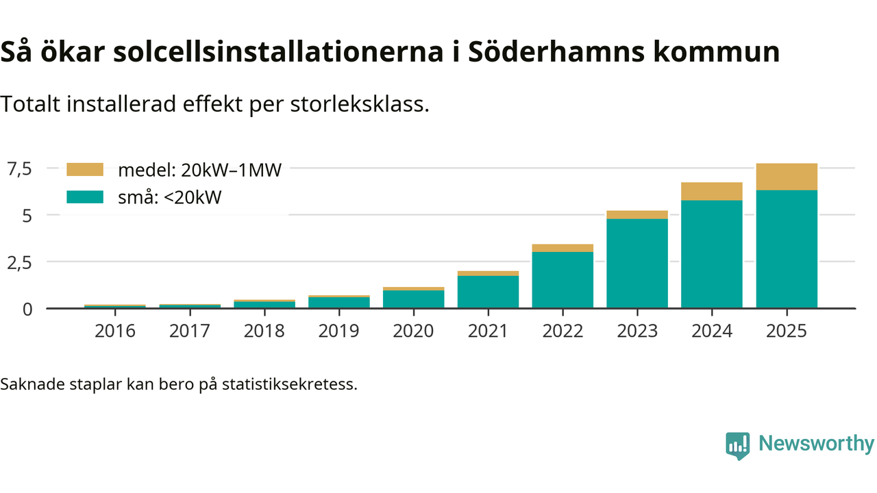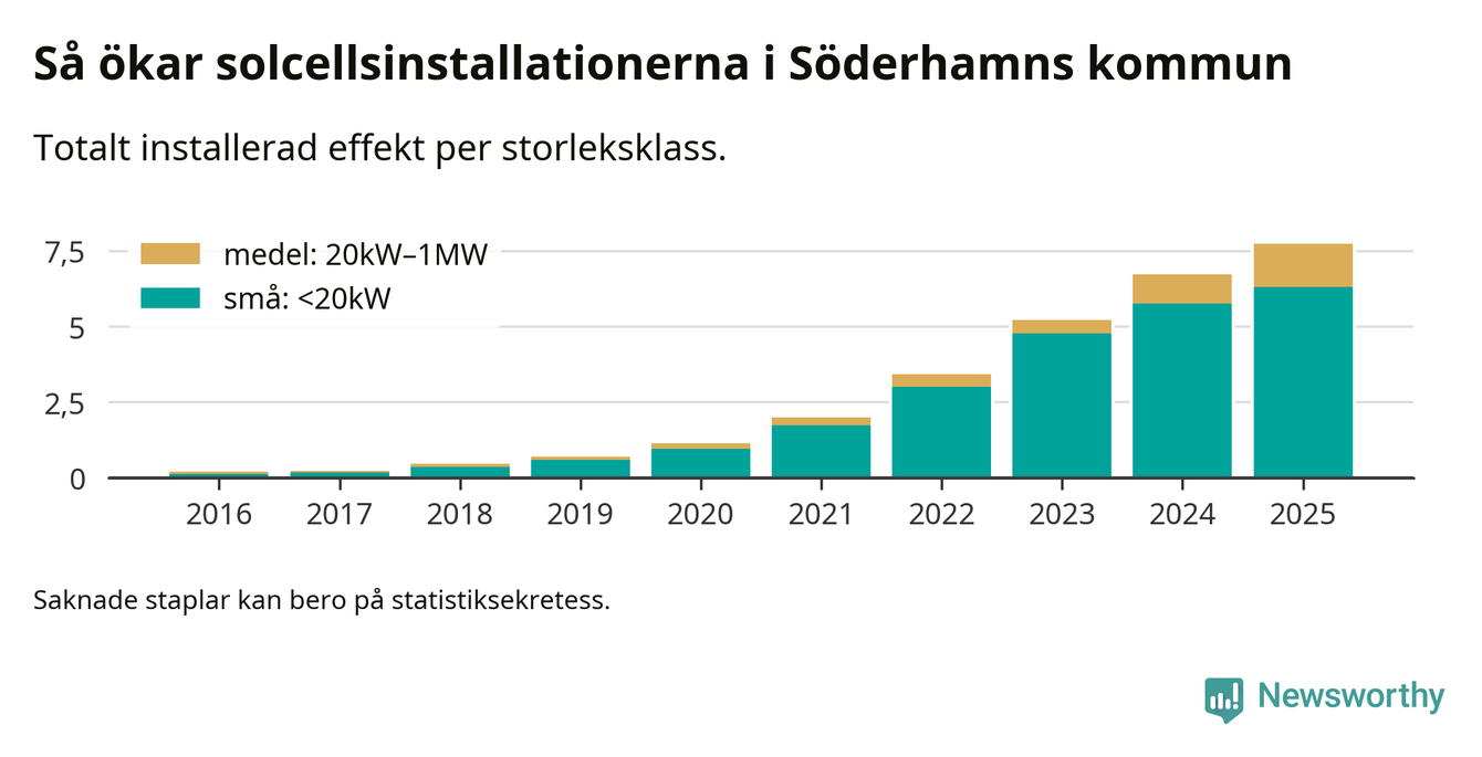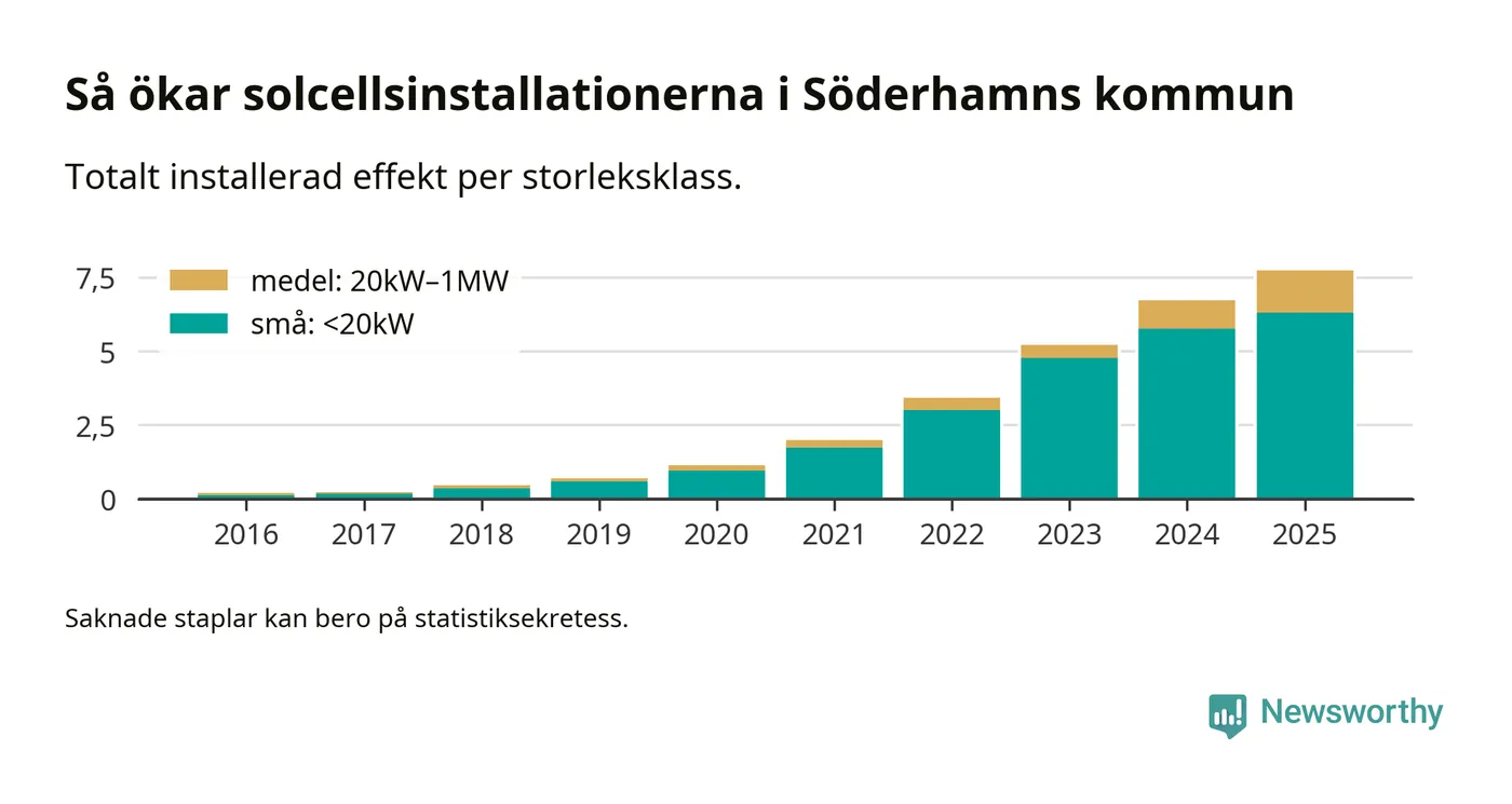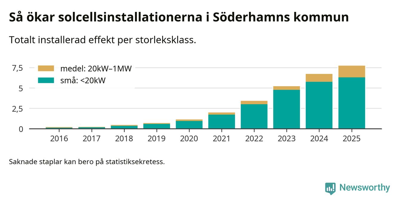 Totalt finns 649 nätanslutna anläggningar, om sammanlagt 7,7 megawatt i kommunen. Det motsvarar, i runda tal, en elproduktion på någonstans mellan fem och sex procent av vad hushållen i Söderhamn förbrukar per år.1