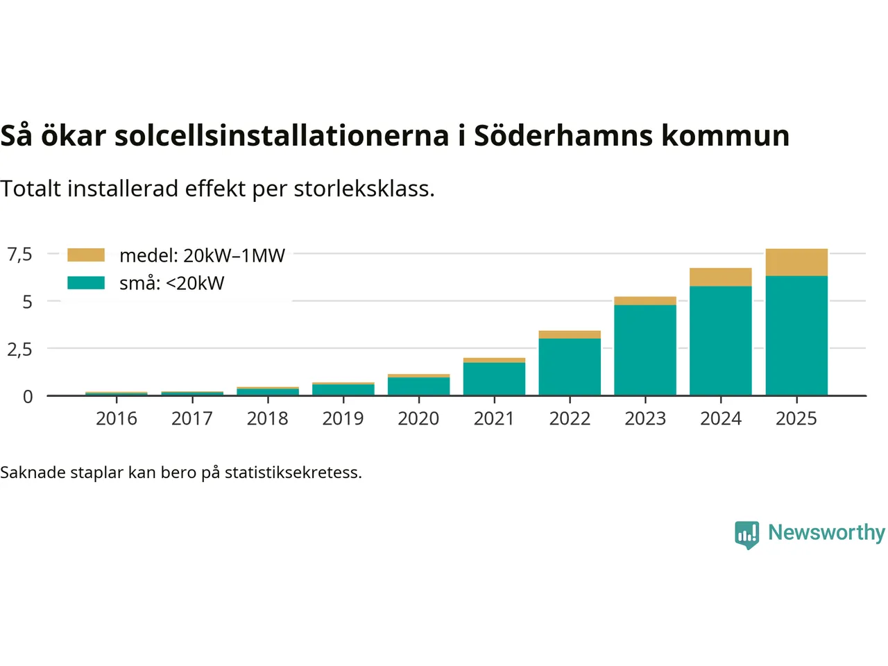 Under 2025 anslöts ett megawatt ny solel till elnätet i Söderhamns kommun, en ökning med 15 procent jämfört med året innan.