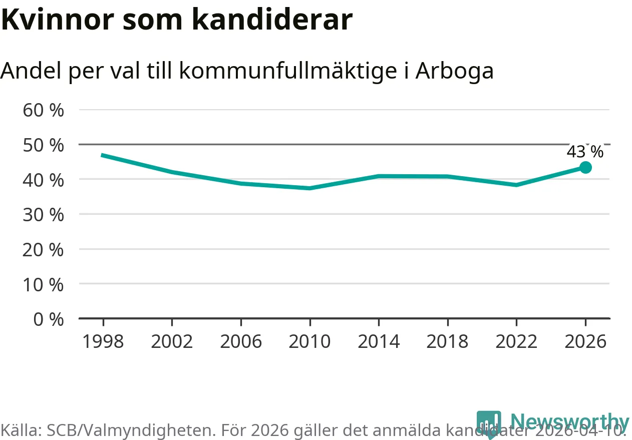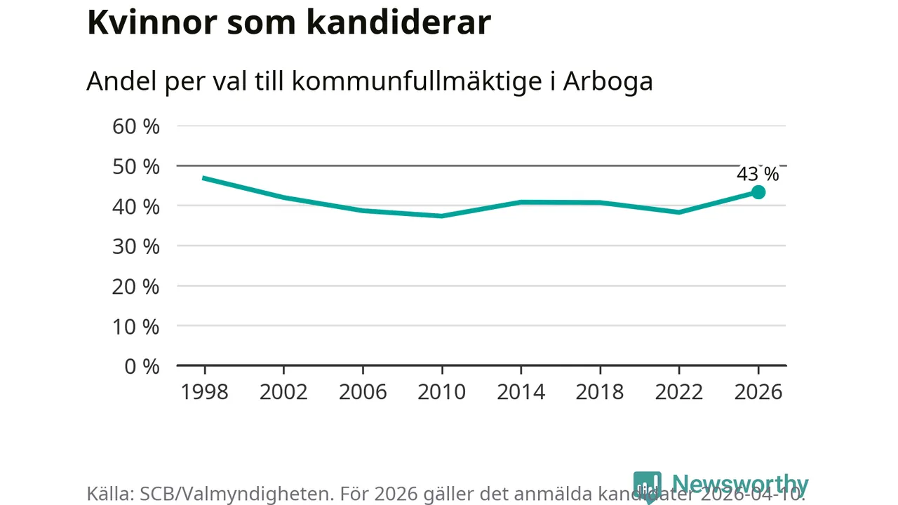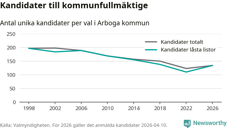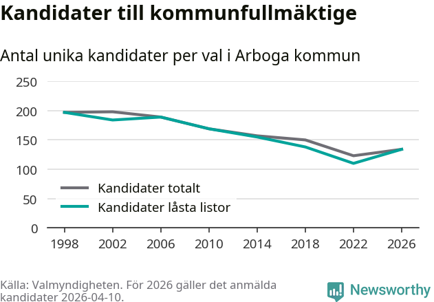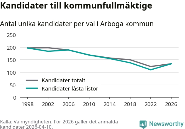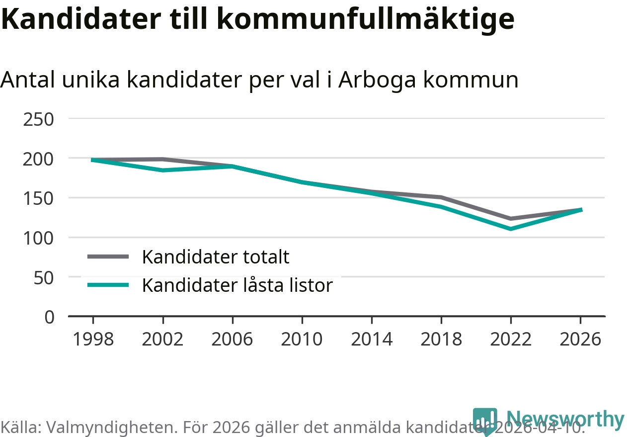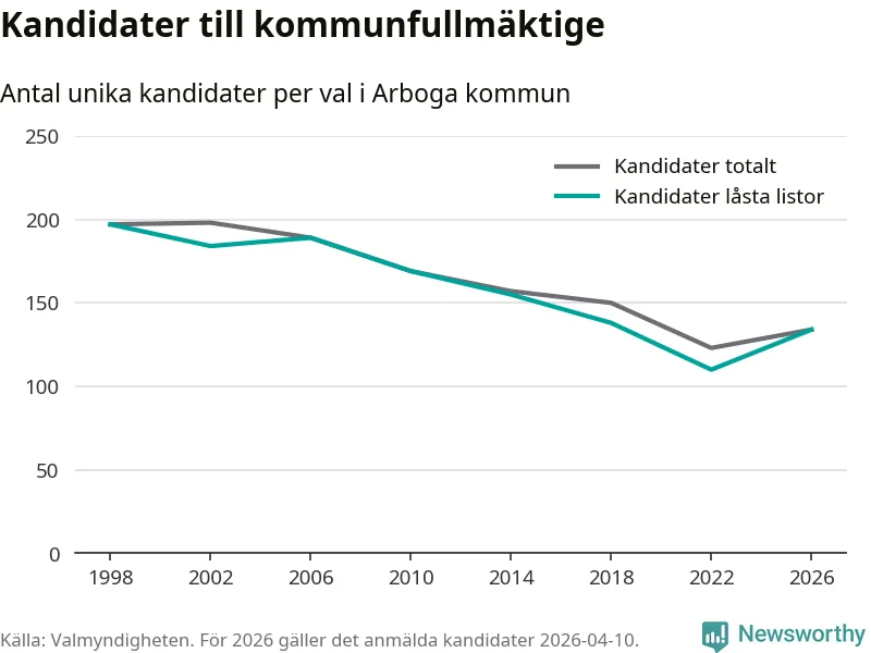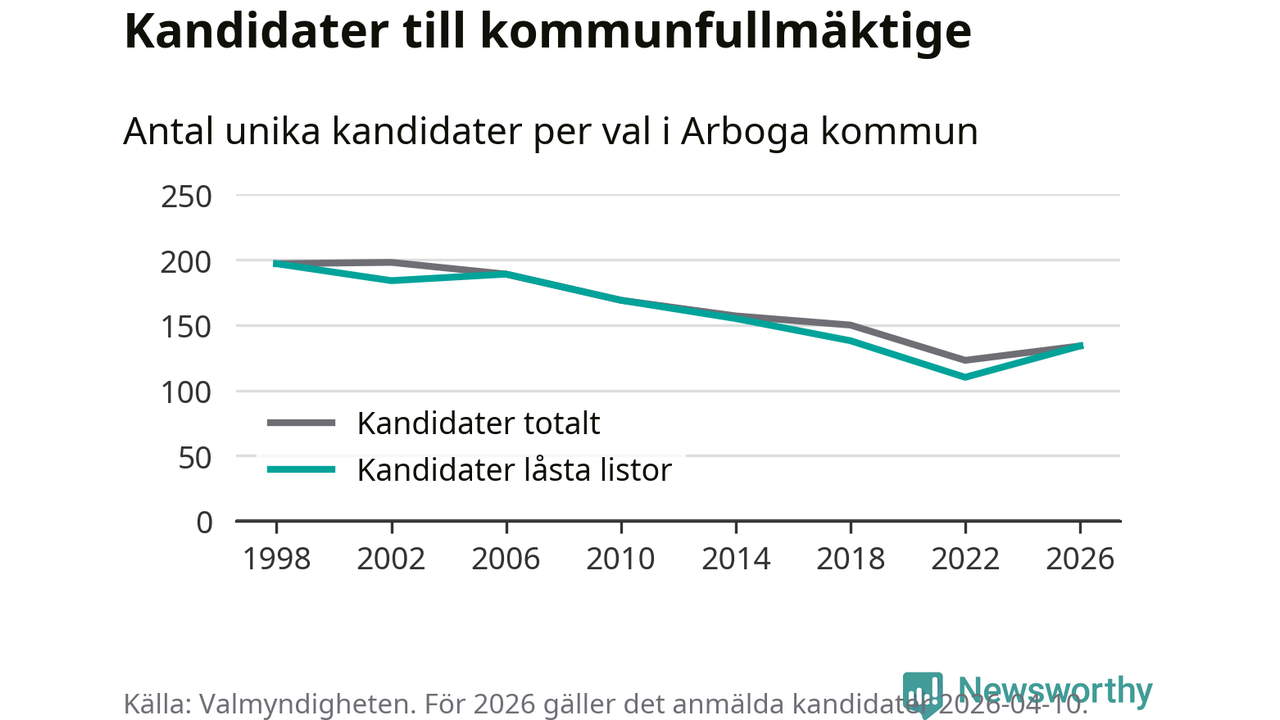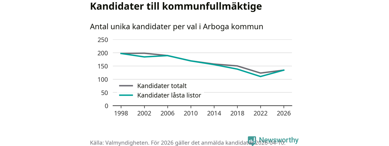 På torsdagen var det deadline för partier med låsta listor att registrera sina kandidater inför höstens val. Till valet till kommunfullmäktige i Arboga är 134 kandidater anmälda på sådana listor, vilket är 24 fler än i valet 2022.