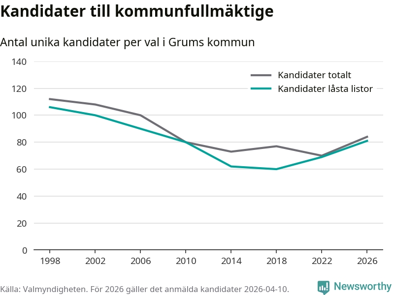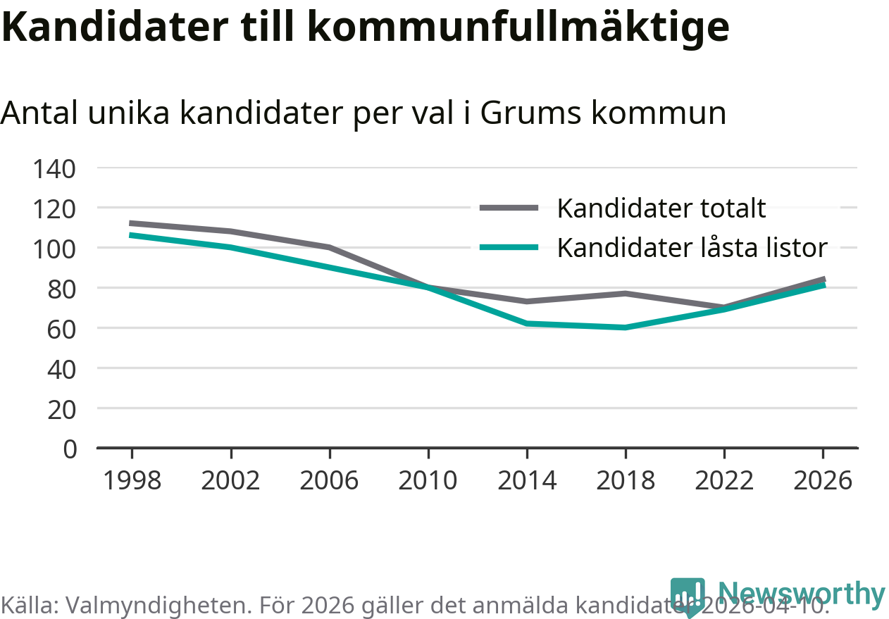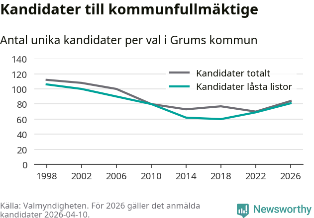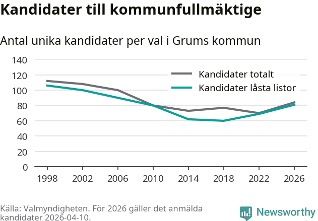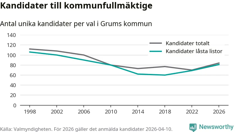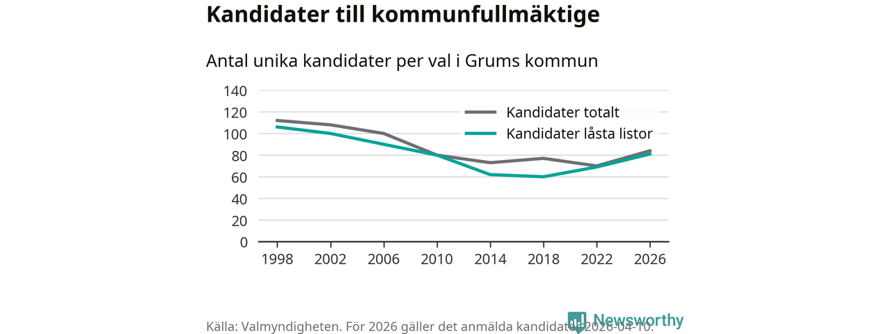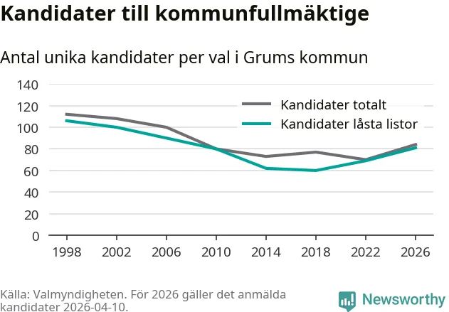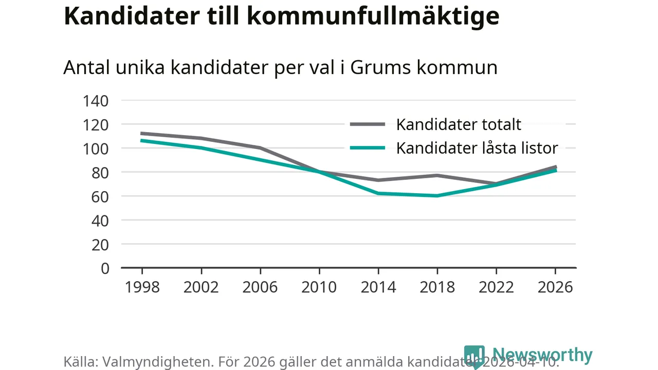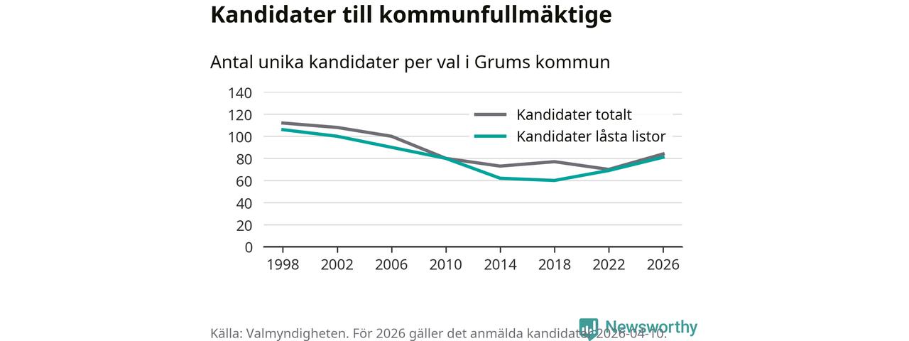 På torsdagen var det deadline för partier med låsta listor att registrera sina kandidater inför höstens val. Till valet till kommunfullmäktige i Grums är 81 kandidater anmälda på sådana listor, vilket är tolv fler än i valet 2022.