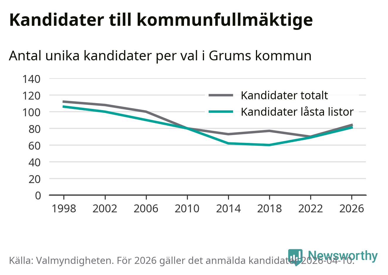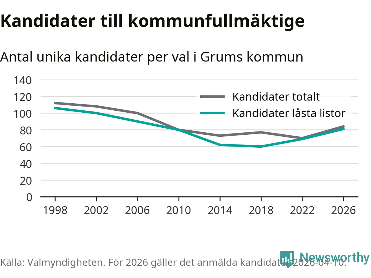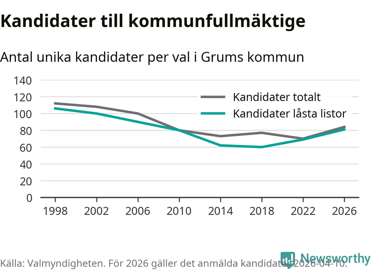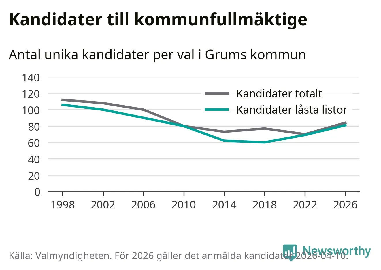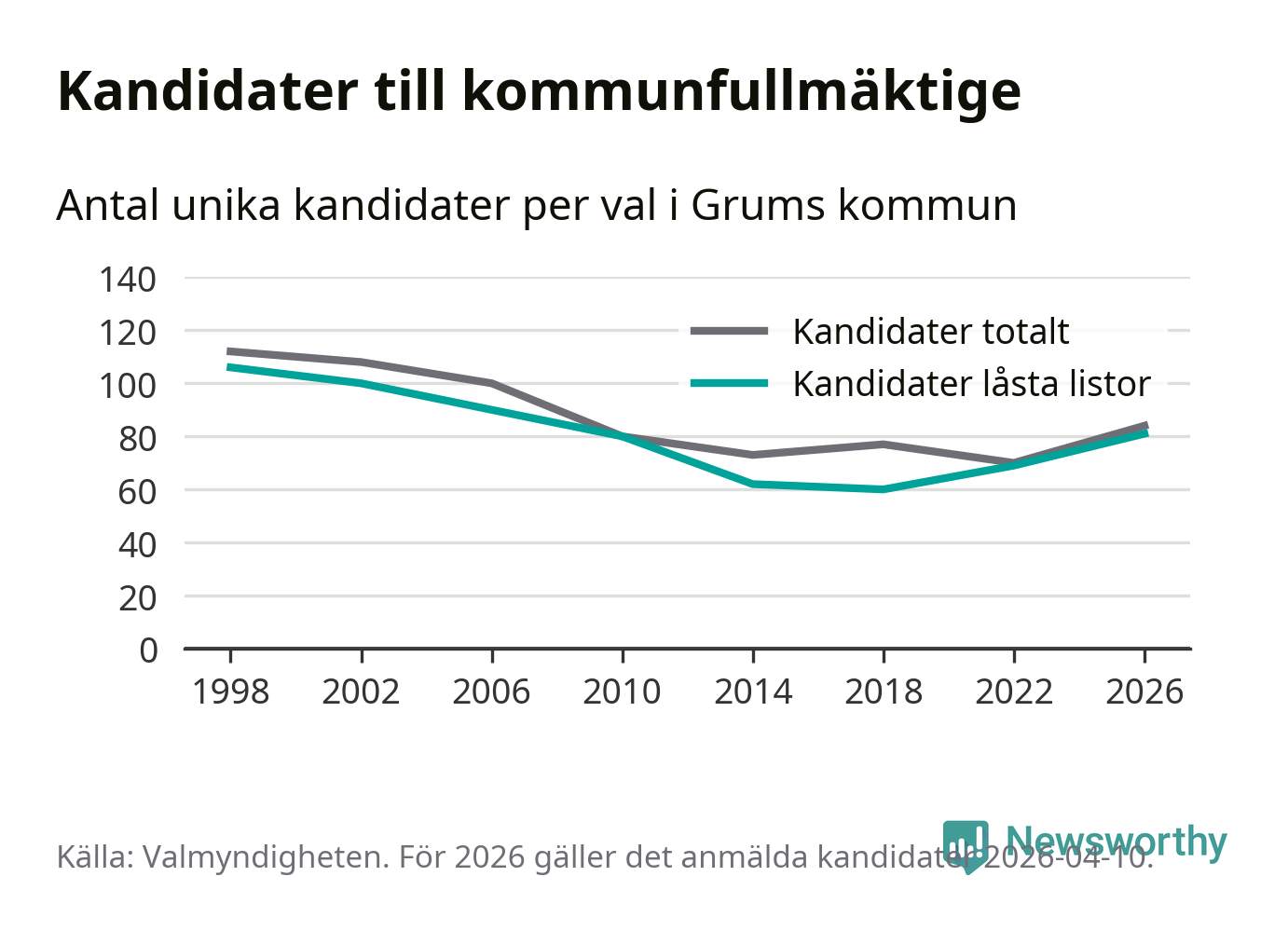 På torsdagen var det deadline för partier med låsta listor att registrera sina kandidater inför höstens val. Till valet till kommunfullmäktige i Grums är 81 kandidater anmälda på sådana listor, vilket är tolv fler än i valet 2022.