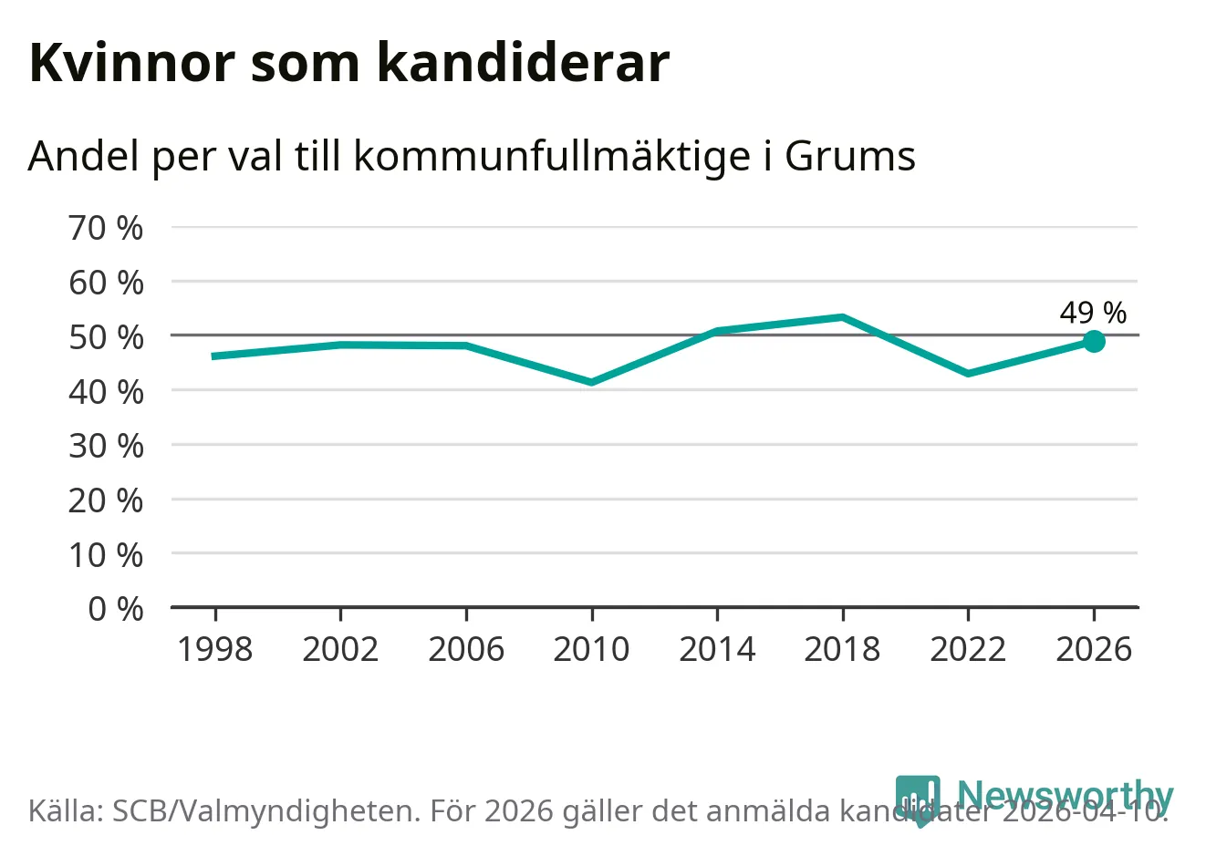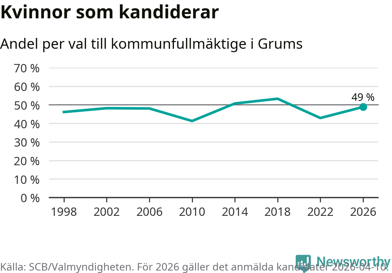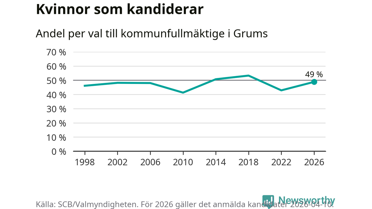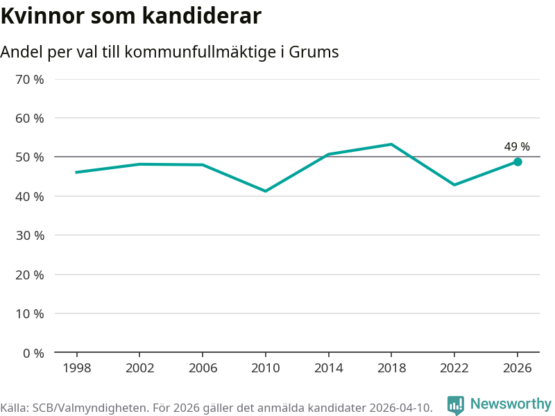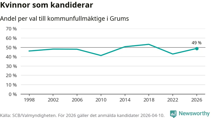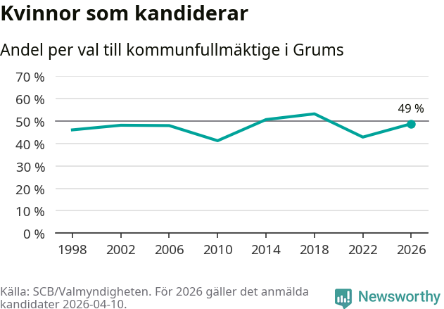 Kvinnorna utgör 49 procent av de hittills anmälda kandidaterna. Vid valet 2018 var 53 procent kvinnor, valet 2010 var motsvarande siffra 41 procent. Grums är en av 264 kommuner i landet där männen utgör en majoritet av kandidaterna på listorna.