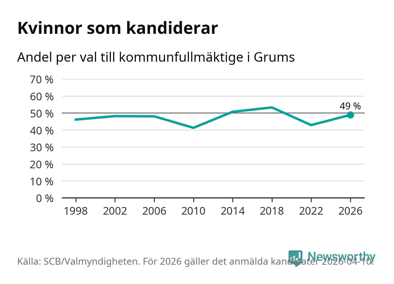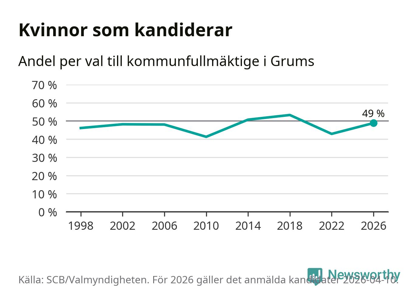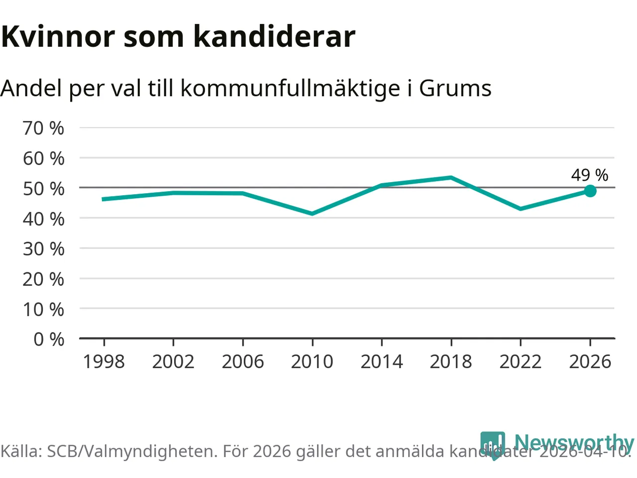 Kvinnorna utgör 49 procent av de hittills anmälda kandidaterna. Vid valet 2018 var 53 procent kvinnor, valet 2010 var motsvarande siffra 41 procent. Grums är en av 264 kommuner i landet där männen utgör en majoritet av kandidaterna på listorna.