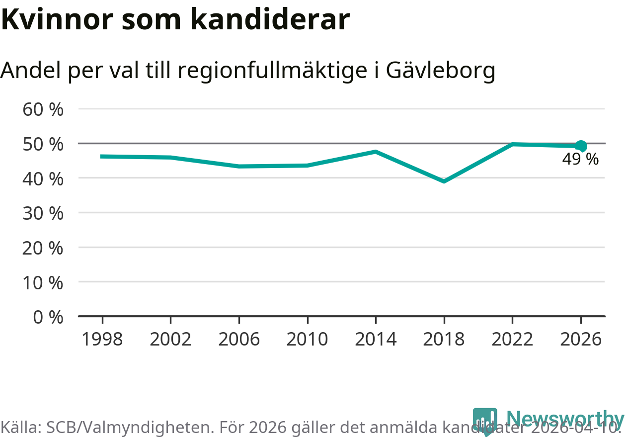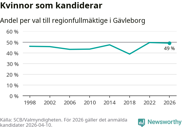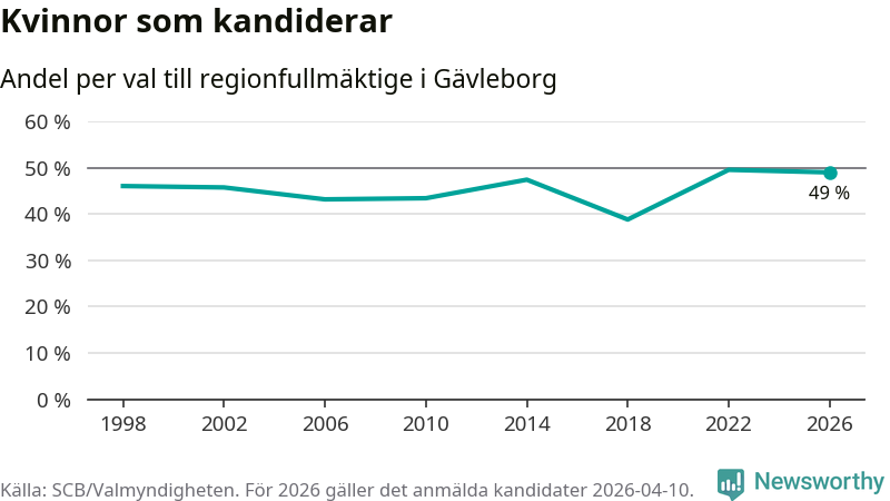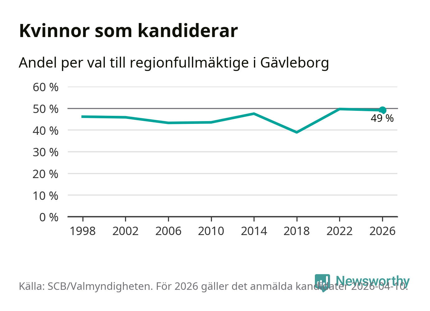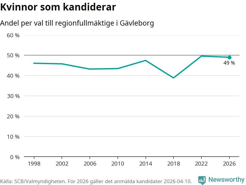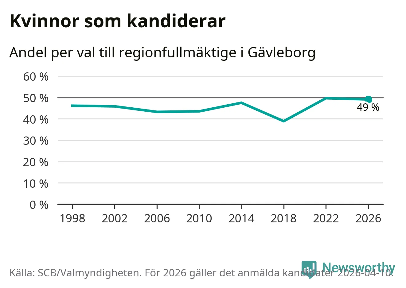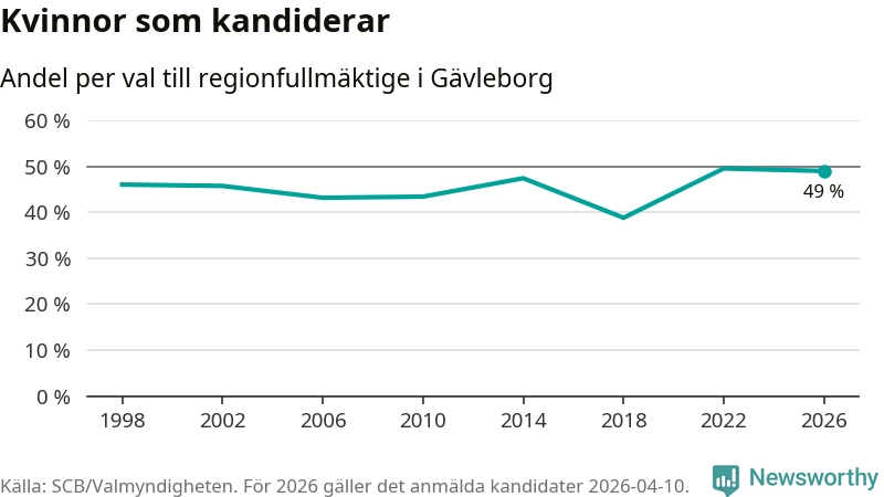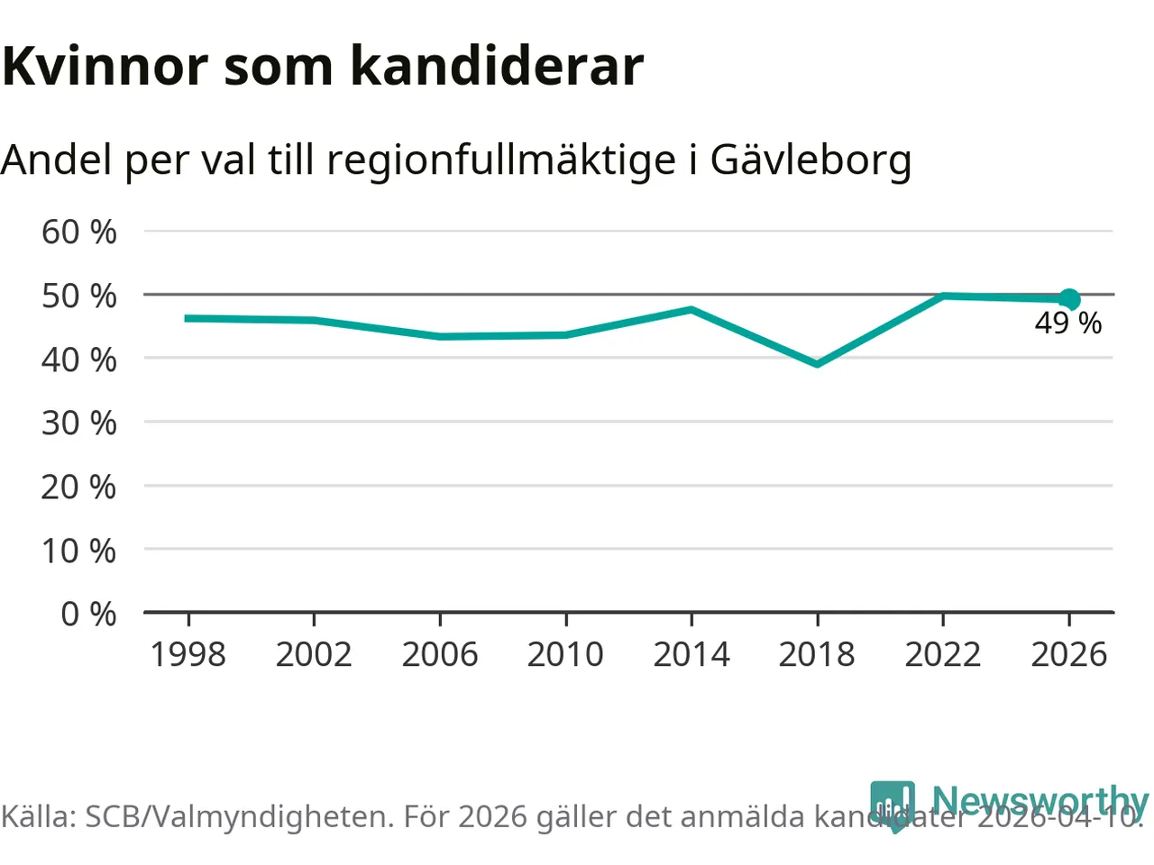 Kvinnorna utgör 49 procent av de hittills anmälda kandidaterna. Vid valet 2022 var 50 procent kvinnor, valet 2018 var motsvarande siffra 39 procent. Gävleborg är en av 20 regioner i landet där männen utgör en majoritet av kandidaterna på listorna.
