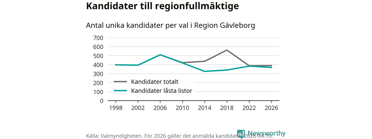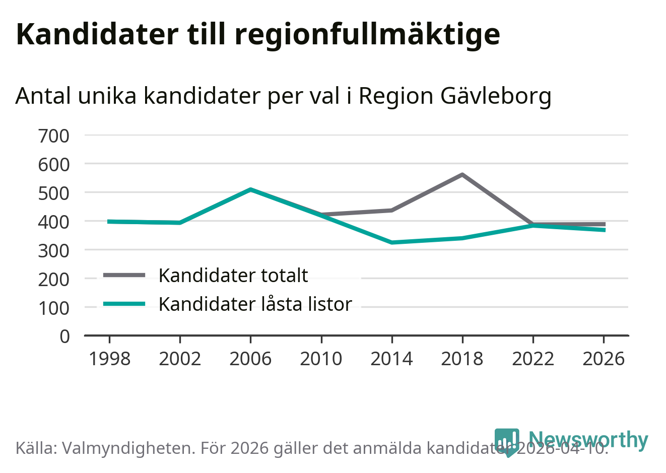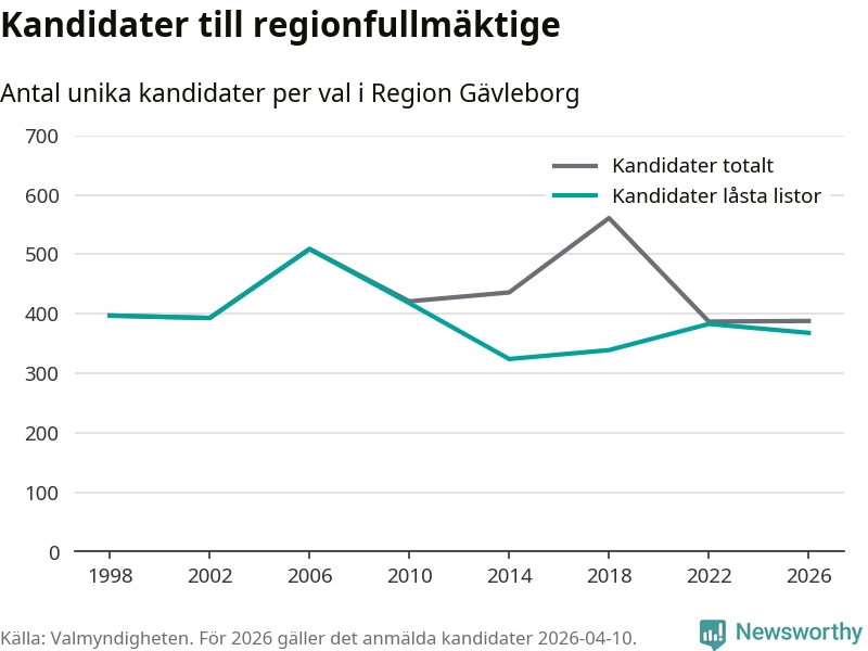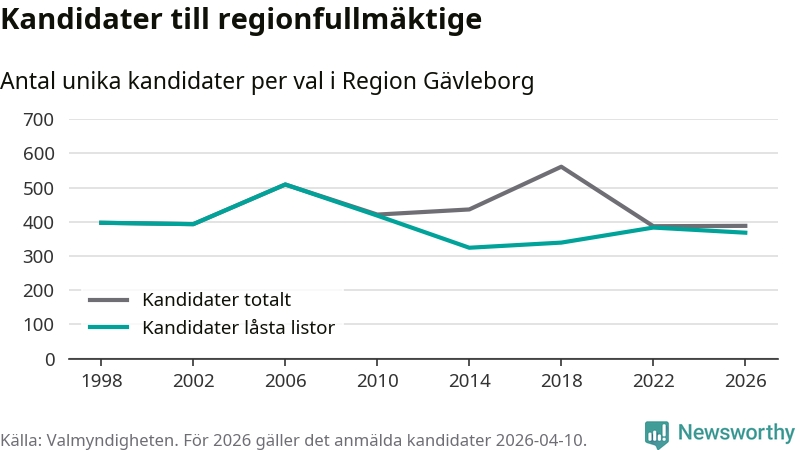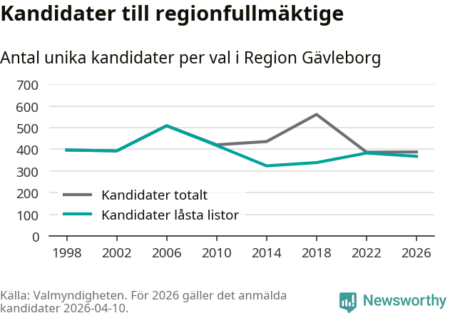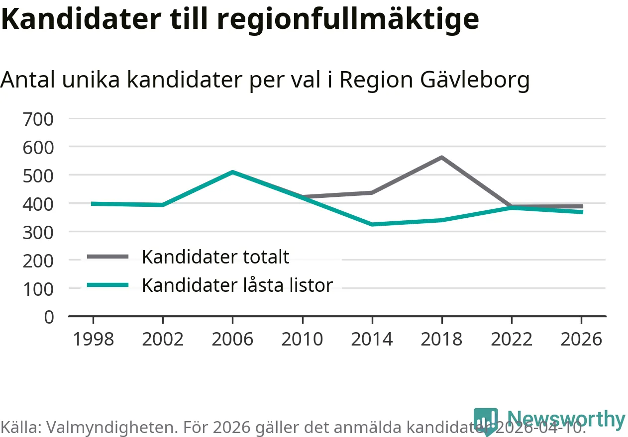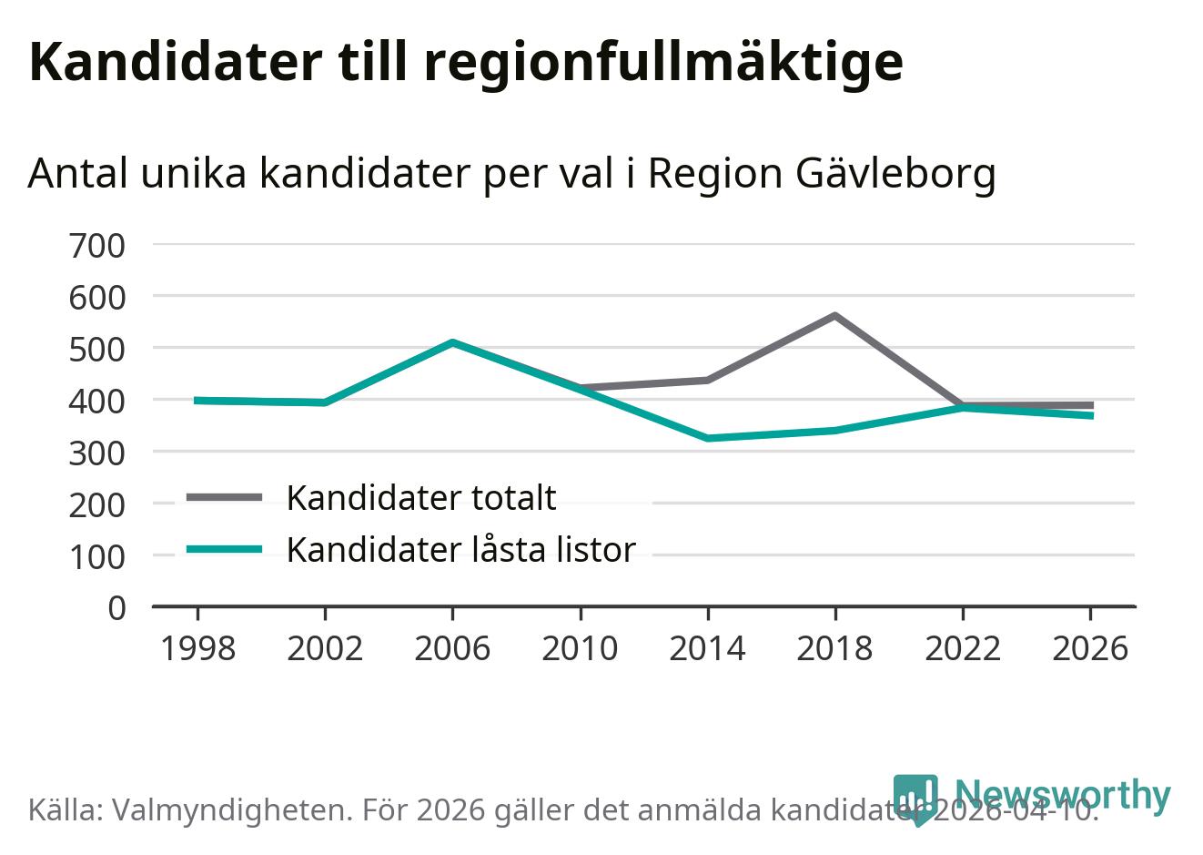 Att listan är låst innebär att partiet redan har anmält sina kandidater och bestämt ordningen på listan och att väljare inte kan lägga till egna kandidater. På öppna listor kan kandidater läggas till fram till dagarna före valet och vem som helst kan anmäla sig som kandidat. De senaste valen har drygt nio av tio kandidater anmälts på låsta listor. I valet till regionfullmäktige i Gävleborg 2022 fanns 383 av 387 kandidater på låsta listor. Hittills i år finns 20 kandidater på öppna listor. Totalt rör det sig alltså om 388 kandidater till höstens val.