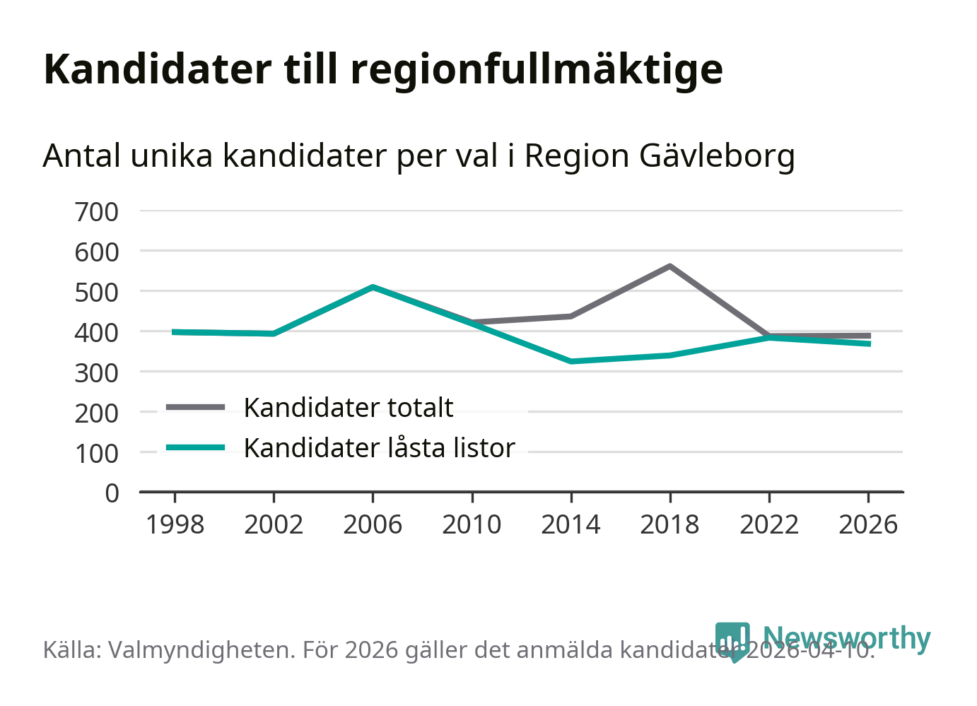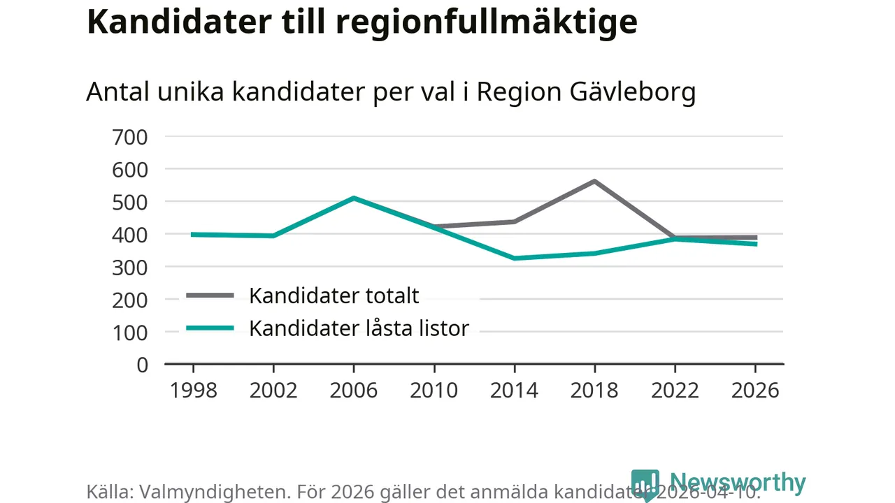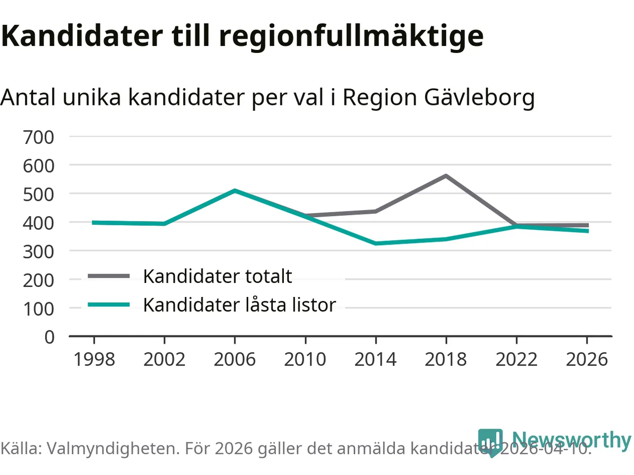 På torsdagen var det deadline för partier med låsta listor att registrera sina kandidater inför höstens val. Till valet till regionfullmäktige i Region Gävleborg är 368 kandidater anmälda på sådana listor, vilket är 15 färre än i valet 2022.