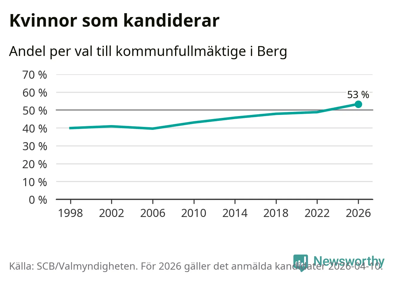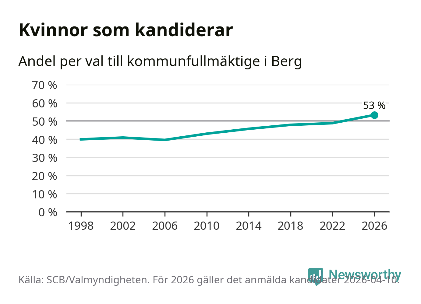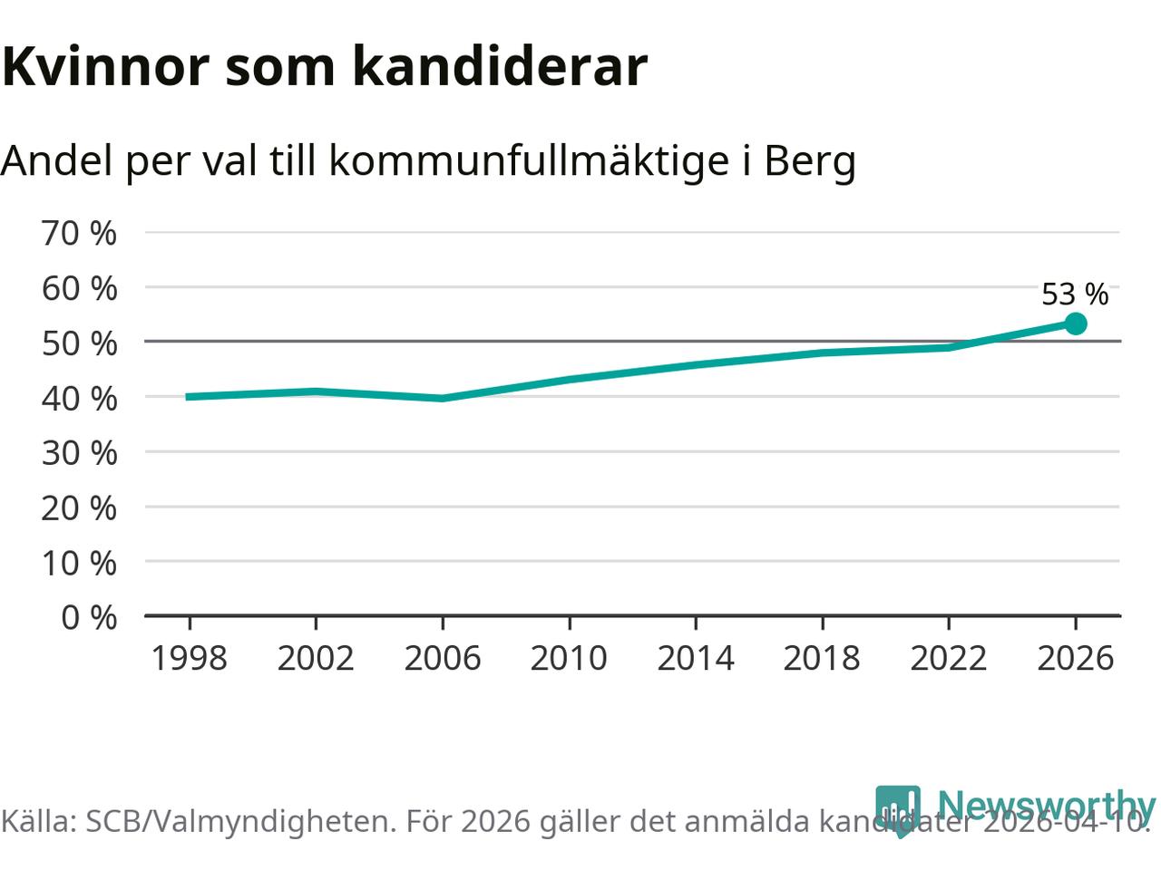 Kvinnorna utgör 53 procent av de hittills anmälda kandidaterna, vilket är den högsta andelen på listorna till kommunfullmäktige i Berg sedan åtminstone valet 1998. Andelen kvinnor har ökat i Berg under de senaste fyra valen och ökningen ser alltså ut att fortsätta i år. Berg är en av 26 kommuner i landet där kvinnorna utgör hälften eller mer av kandidaterna på listorna.