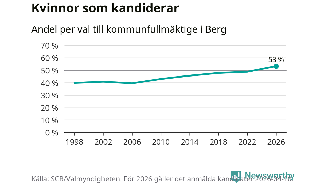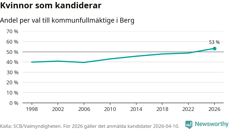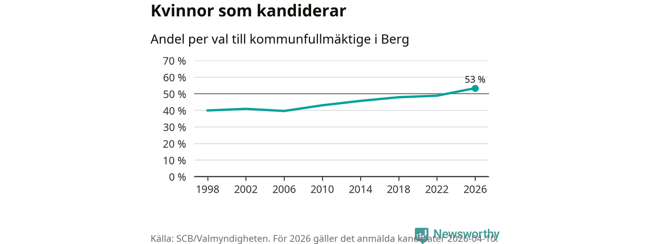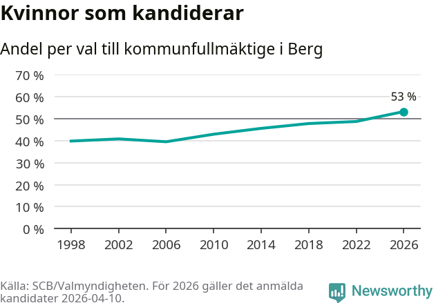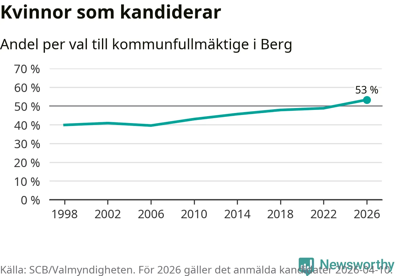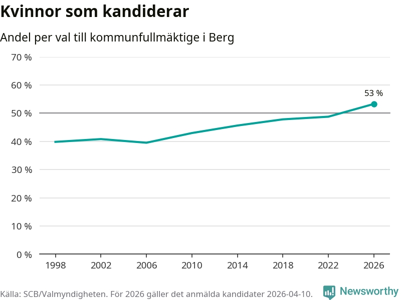 Kvinnorna utgör 53 procent av de hittills anmälda kandidaterna, vilket är den högsta andelen på listorna till kommunfullmäktige i Berg sedan åtminstone valet 1998. Andelen kvinnor har ökat i Berg under de senaste fyra valen och ökningen ser alltså ut att fortsätta i år. Berg är en av 26 kommuner i landet där kvinnorna utgör hälften eller mer av kandidaterna på listorna.