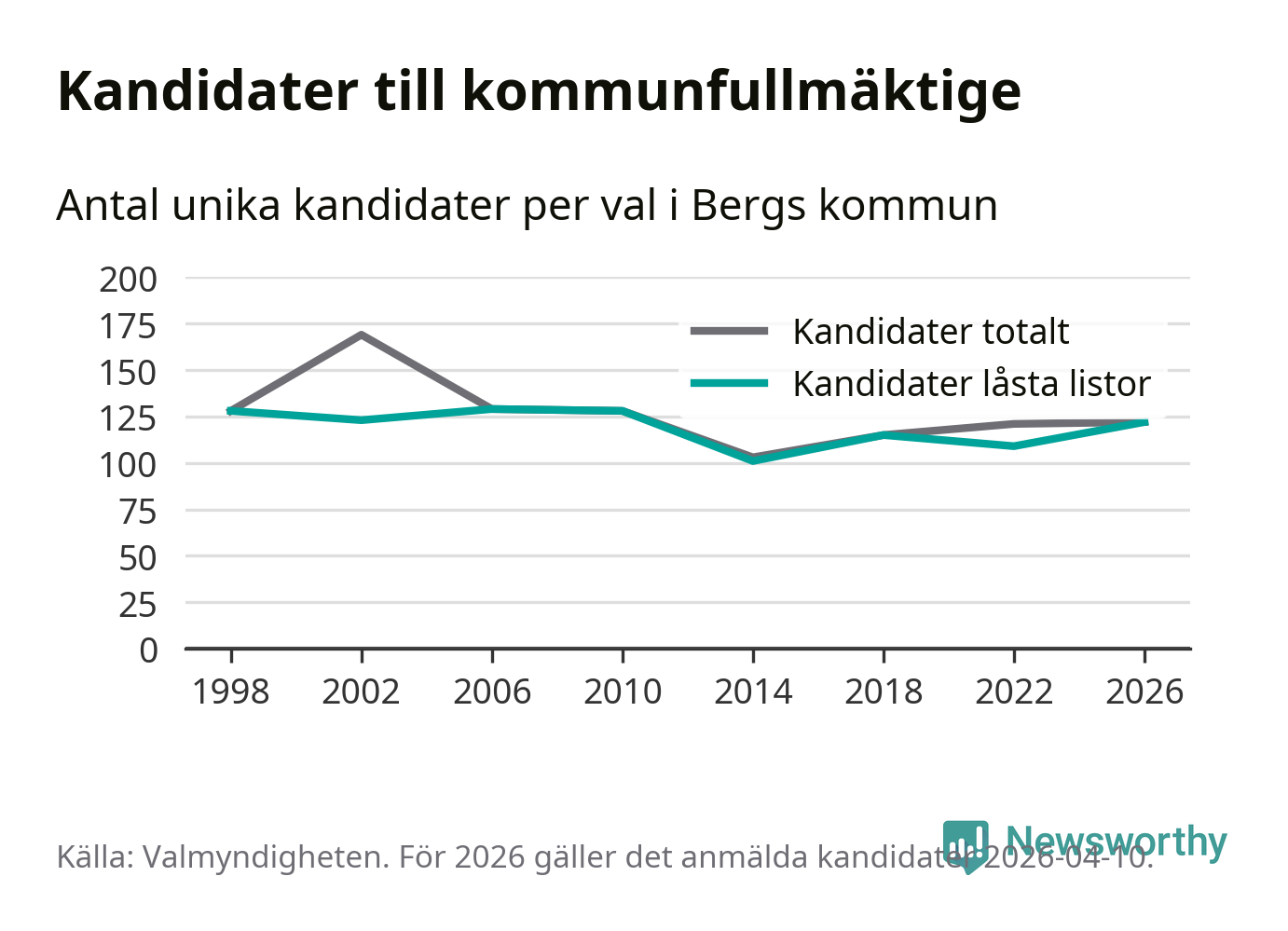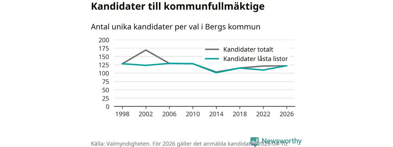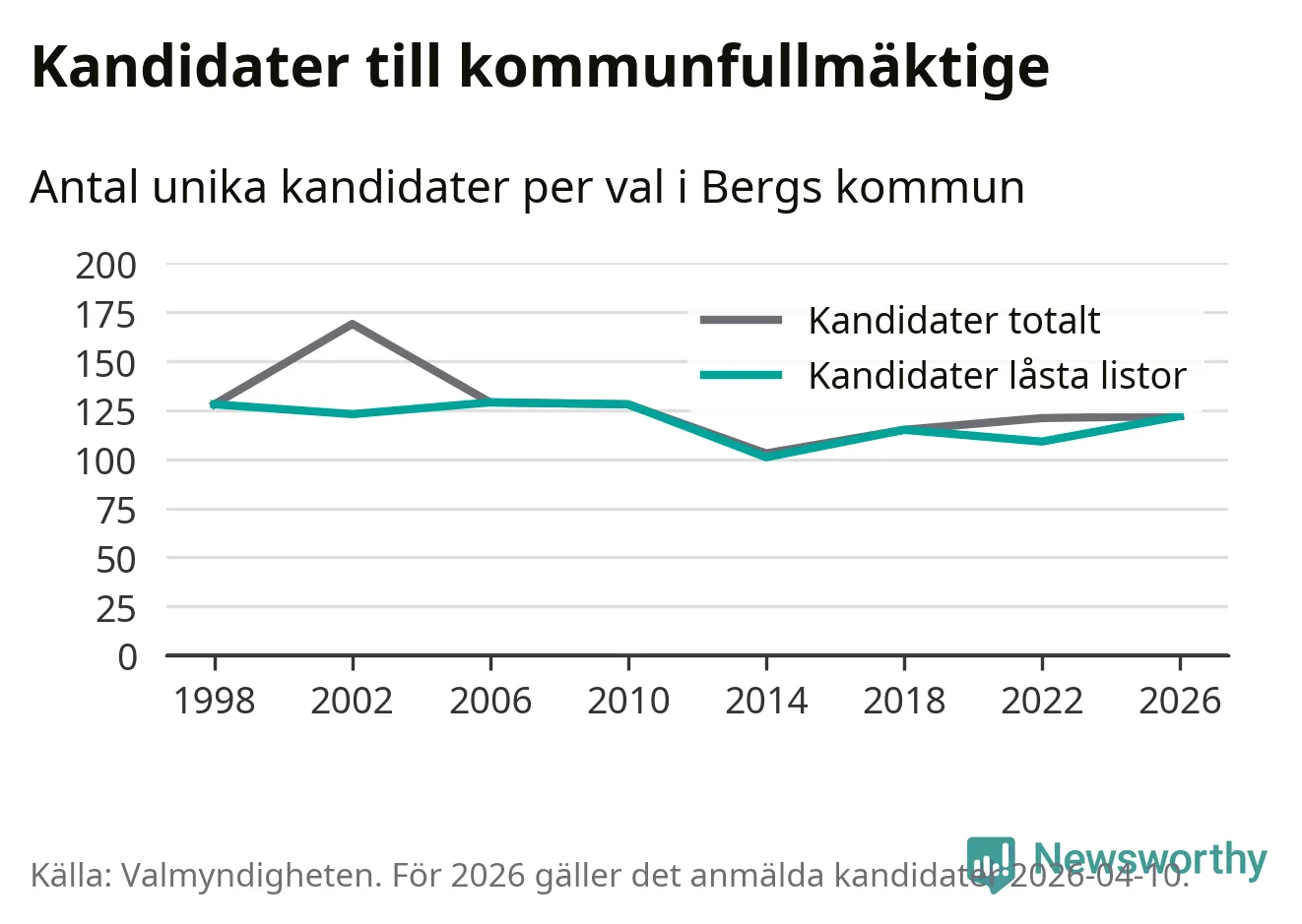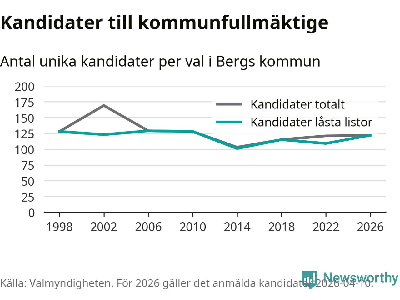 På torsdagen var det deadline för partier med låsta listor att registrera sina kandidater inför höstens val. Till valet till kommunfullmäktige i Berg är 122 kandidater anmälda på sådana listor, vilket är 13 fler än i valet 2022.