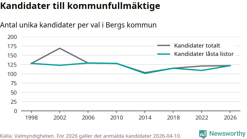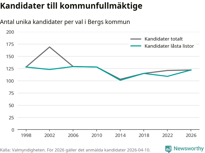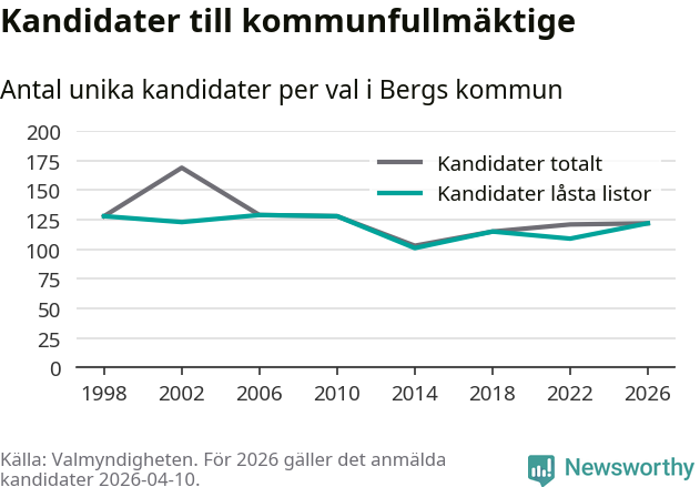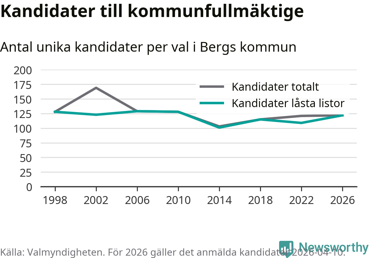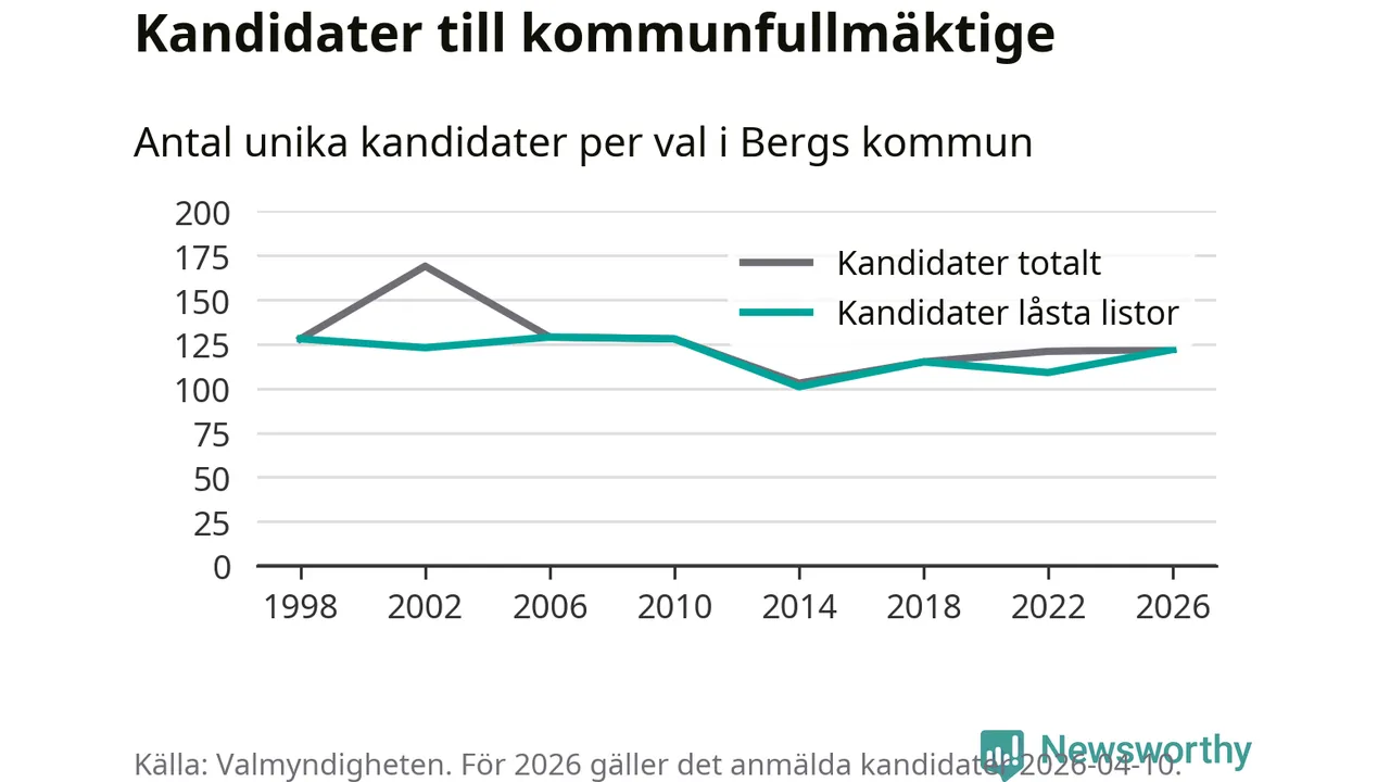 På torsdagen var det deadline för partier med låsta listor att registrera sina kandidater inför höstens val. Till valet till kommunfullmäktige i Berg är 122 kandidater anmälda på sådana listor, vilket är 13 fler än i valet 2022.