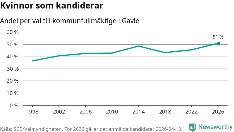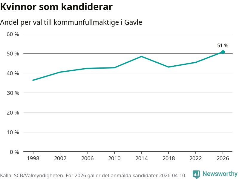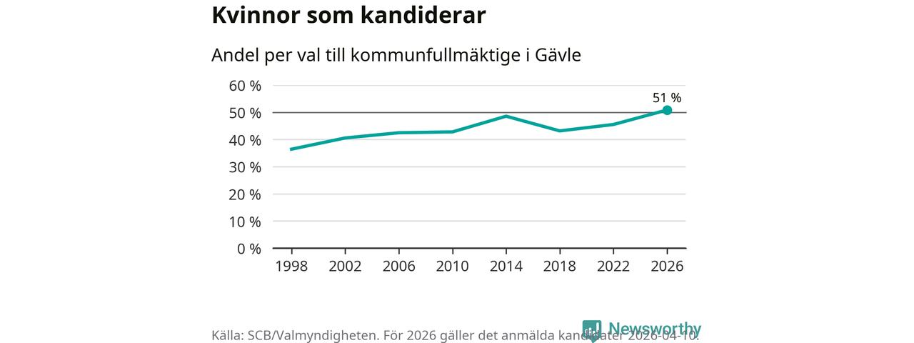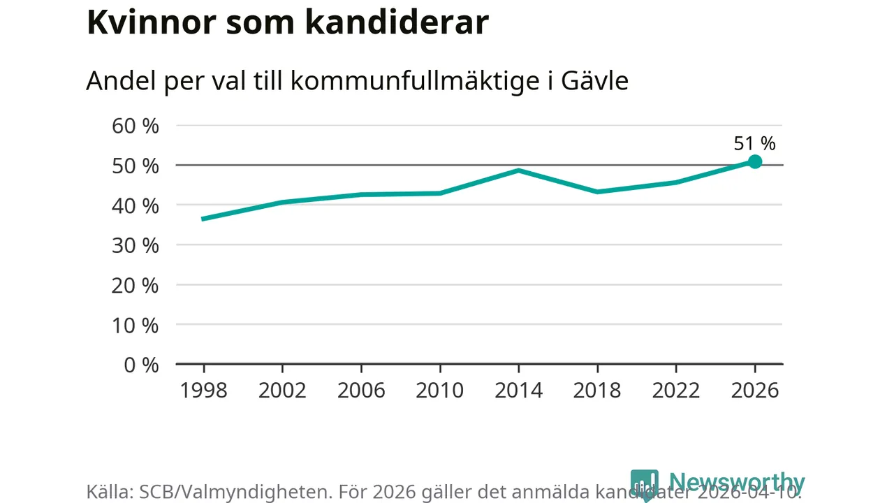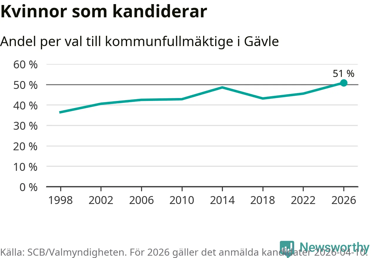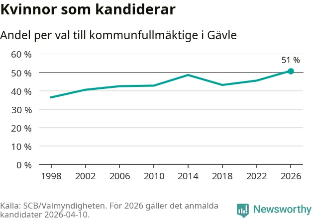 Kvinnorna utgör 51 procent av de hittills anmälda kandidaterna, vilket är den högsta andelen på listorna till kommunfullmäktige i Gävle sedan åtminstone valet 1998. Gävle är en av 26 kommuner i landet där kvinnorna utgör hälften eller mer av kandidaterna på listorna.