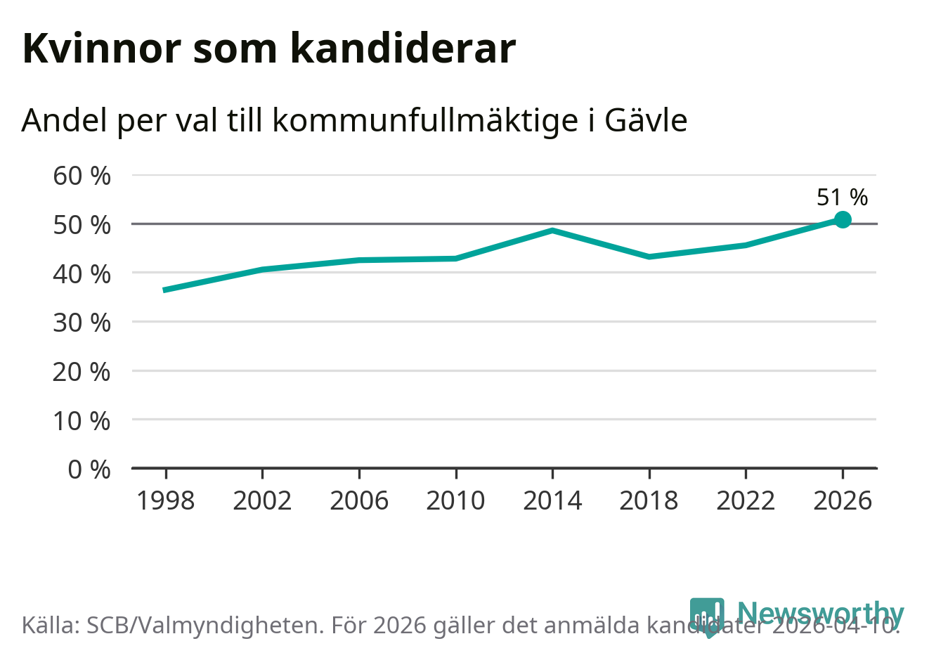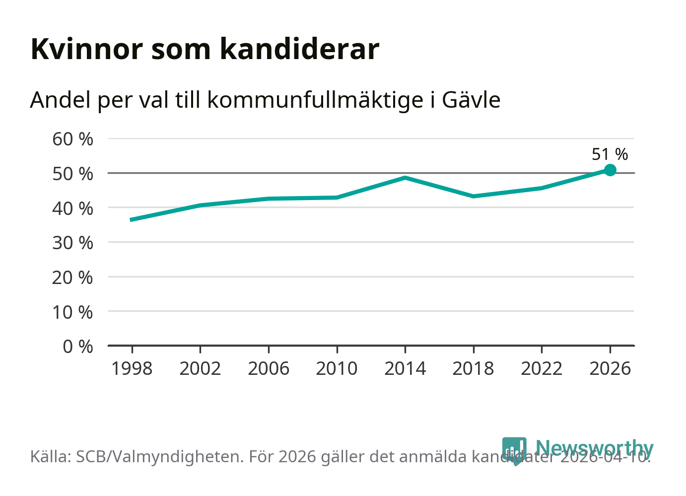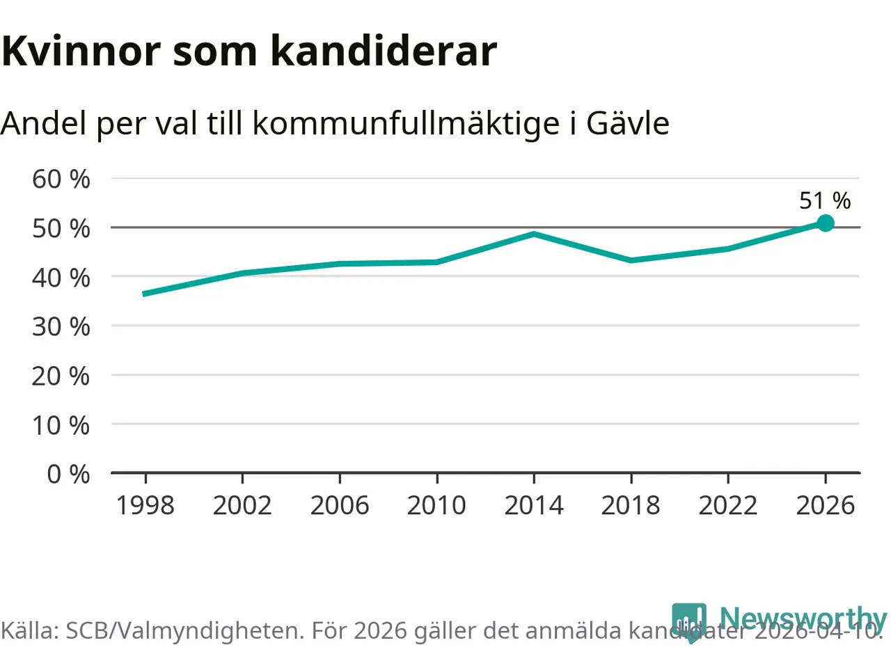 Kvinnorna utgör 51 procent av de hittills anmälda kandidaterna, vilket är den högsta andelen på listorna till kommunfullmäktige i Gävle sedan åtminstone valet 1998. Gävle är en av 26 kommuner i landet där kvinnorna utgör hälften eller mer av kandidaterna på listorna.