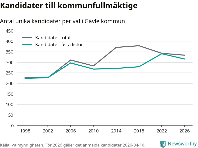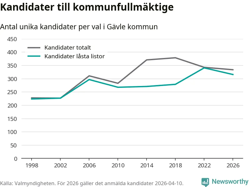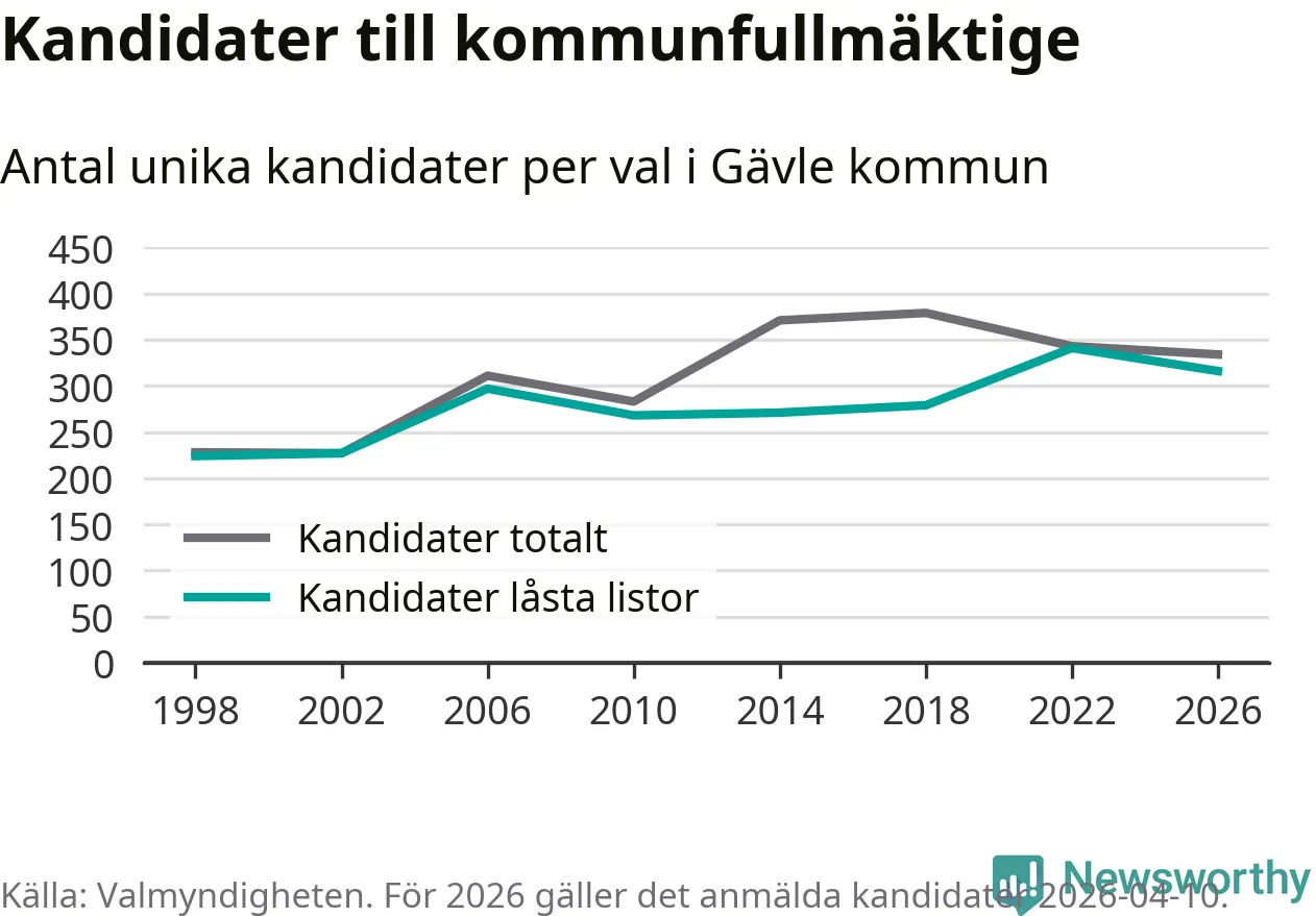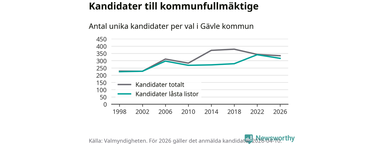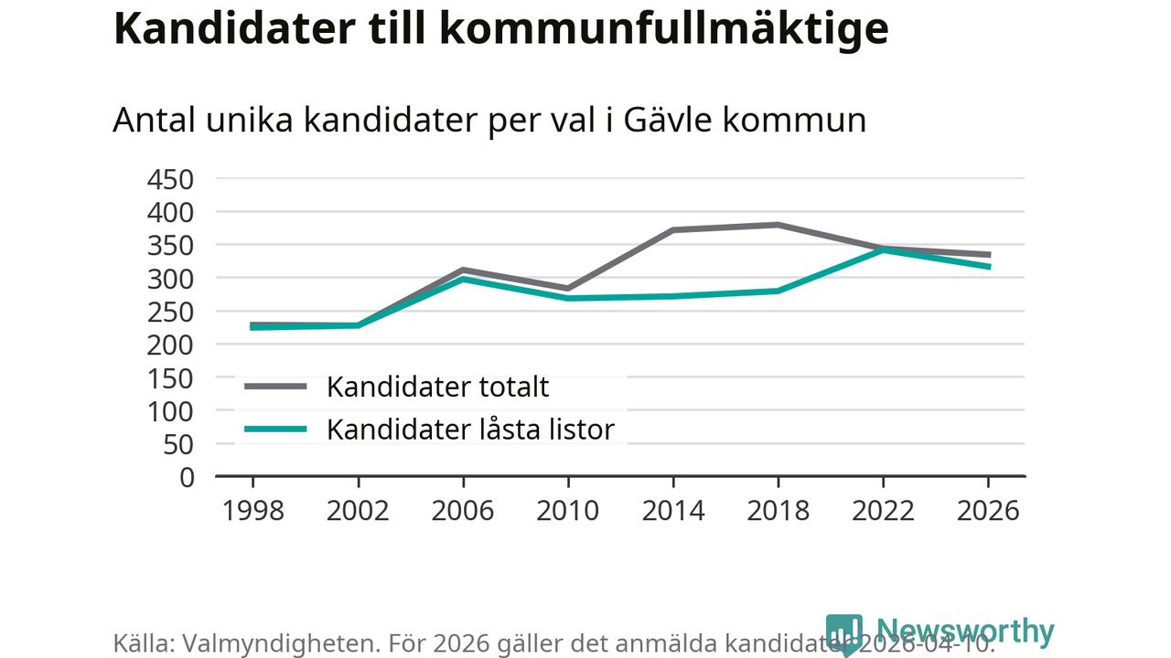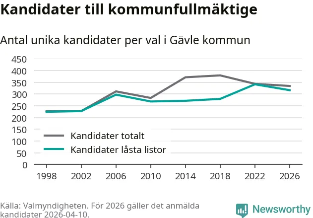 På torsdagen var det deadline för partier med låsta listor att registrera sina kandidater inför höstens val. Till valet till kommunfullmäktige i Gävle är 316 kandidater anmälda på sådana listor, vilket är 25 färre än i valet 2022.