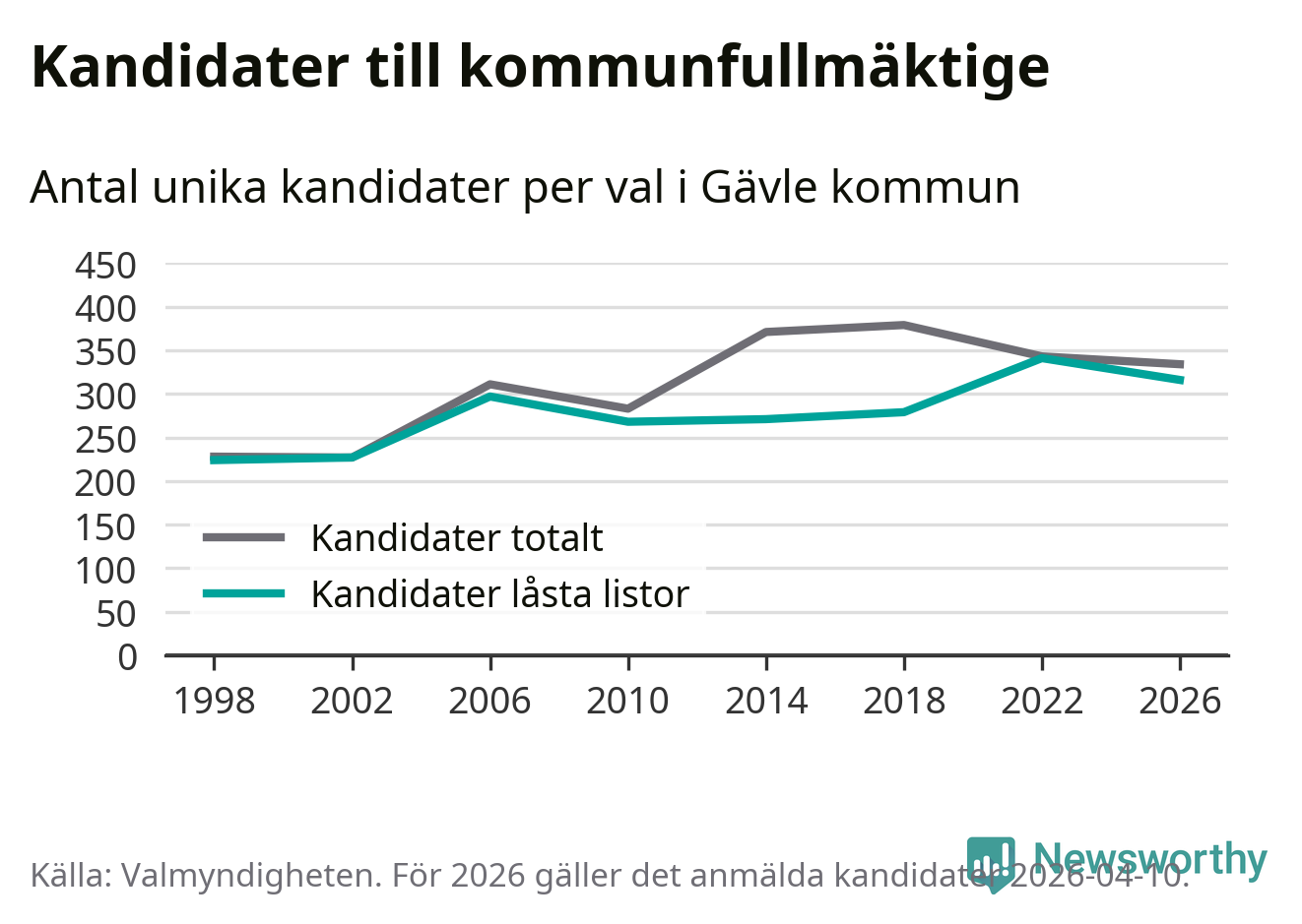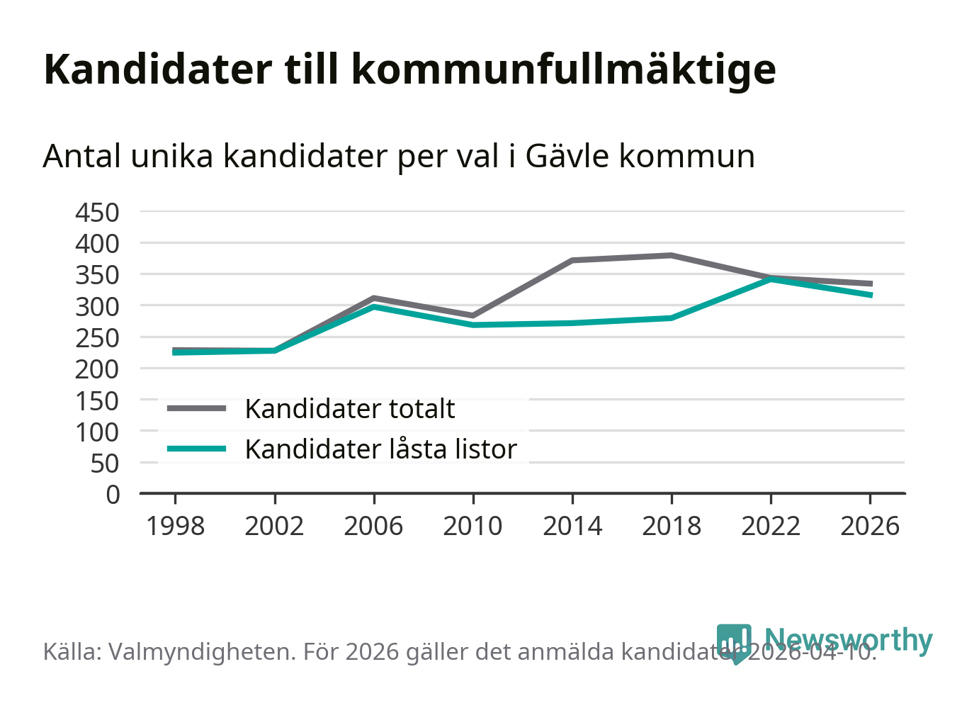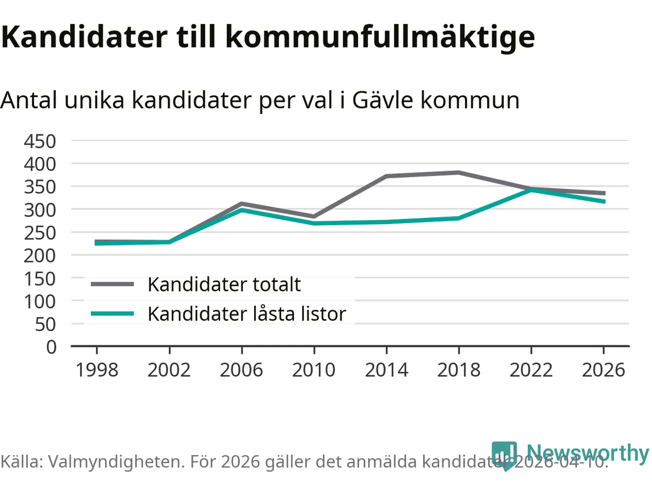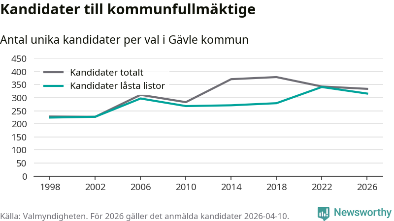 På torsdagen var det deadline för partier med låsta listor att registrera sina kandidater inför höstens val. Till valet till kommunfullmäktige i Gävle är 316 kandidater anmälda på sådana listor, vilket är 25 färre än i valet 2022.
