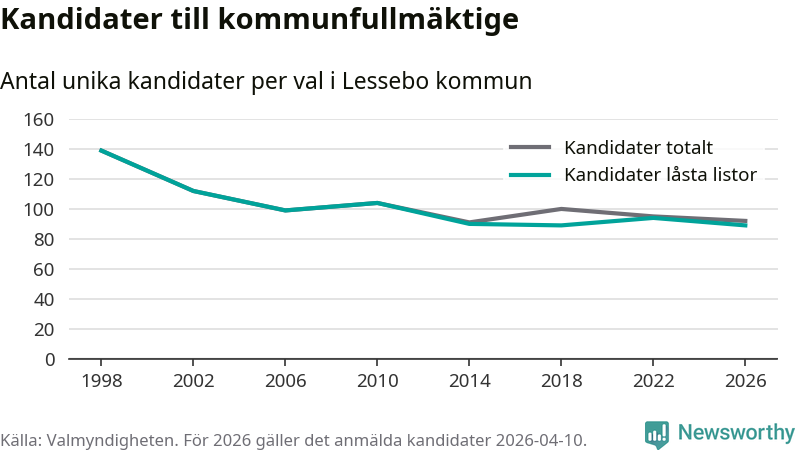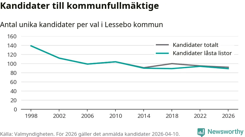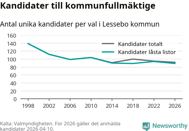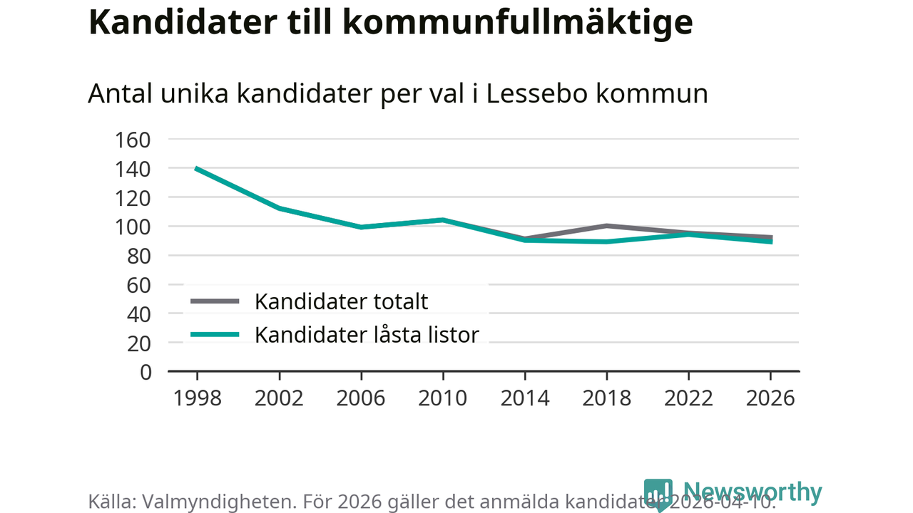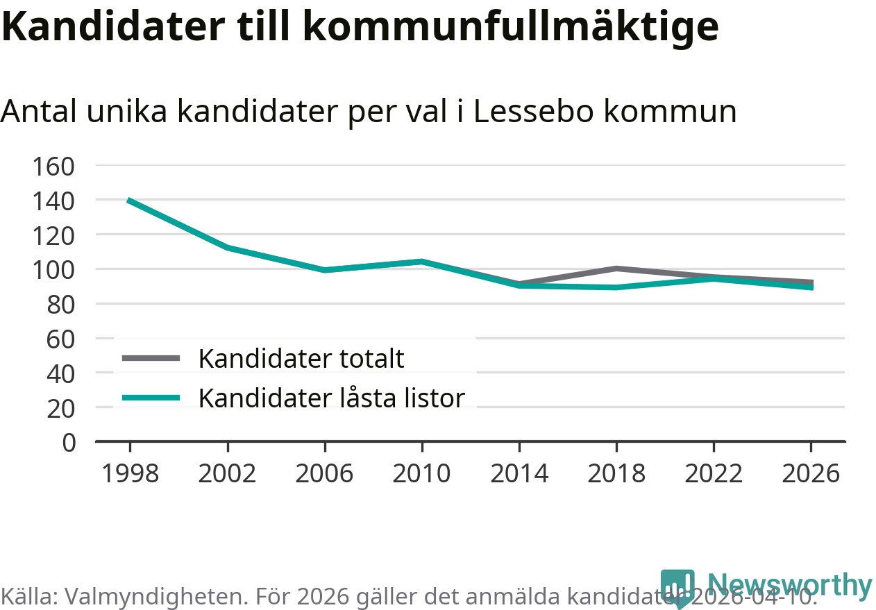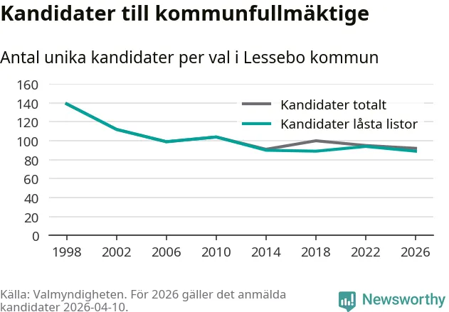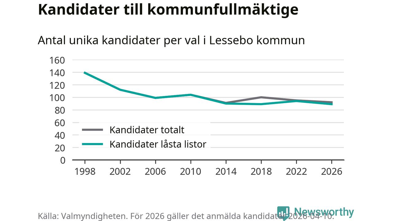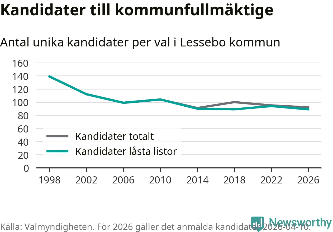 På torsdagen var det deadline för partier med låsta listor att registrera sina kandidater inför höstens val. Till valet till kommunfullmäktige i Lessebo är 89 kandidater anmälda på sådana listor, vilket är fem färre än i valet 2022. Det är den lägsta siffran sedan åtminstone valet 1998, vilket är så långt tillbaka som vi har statistik för.