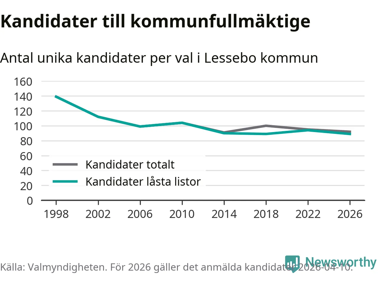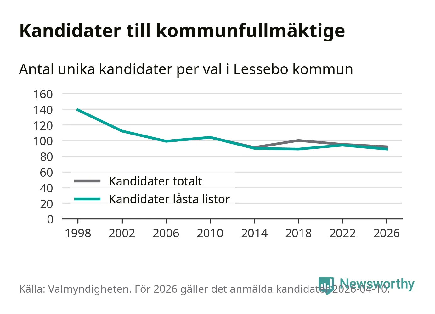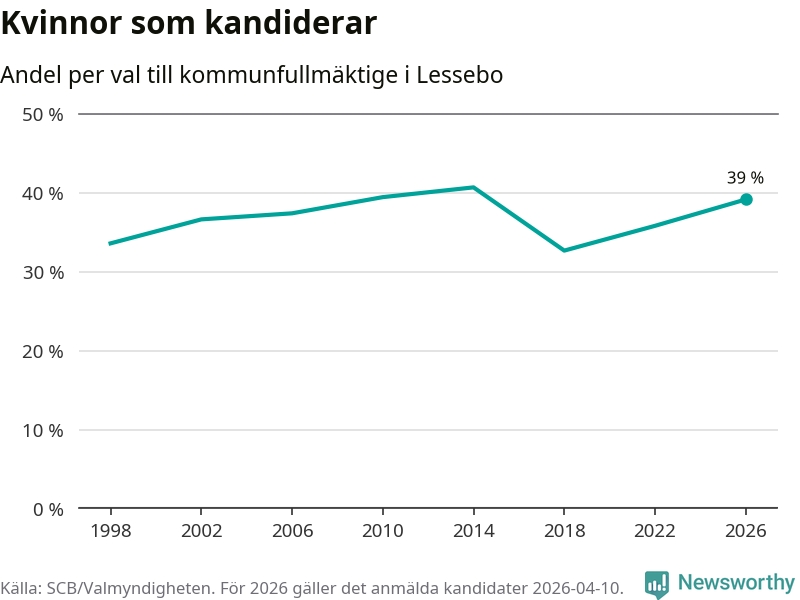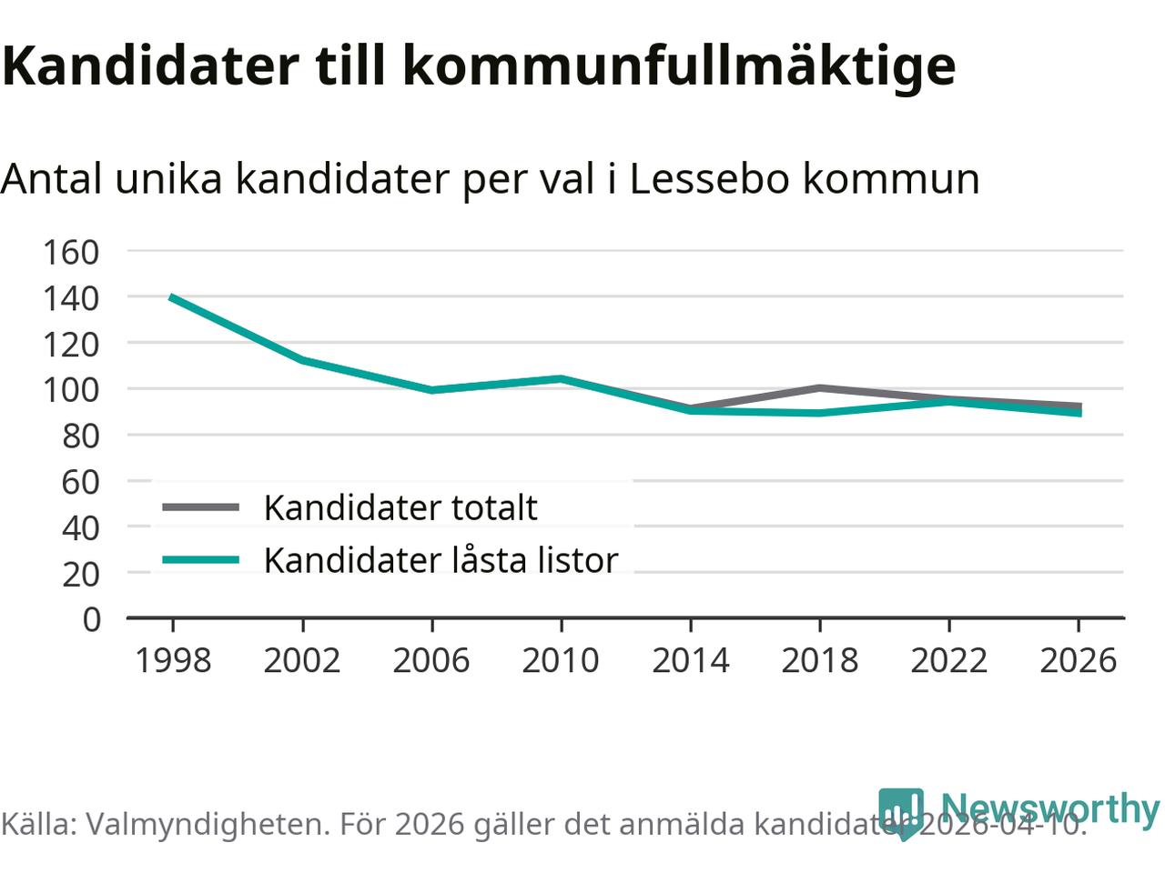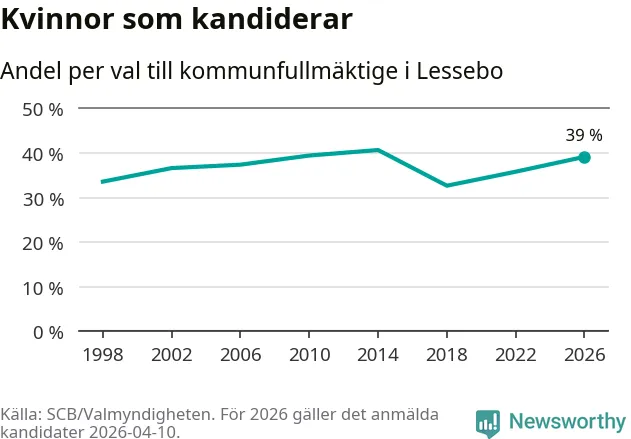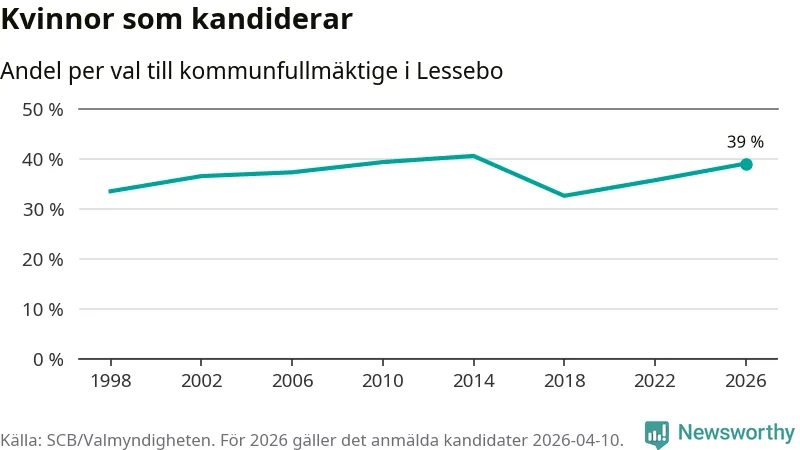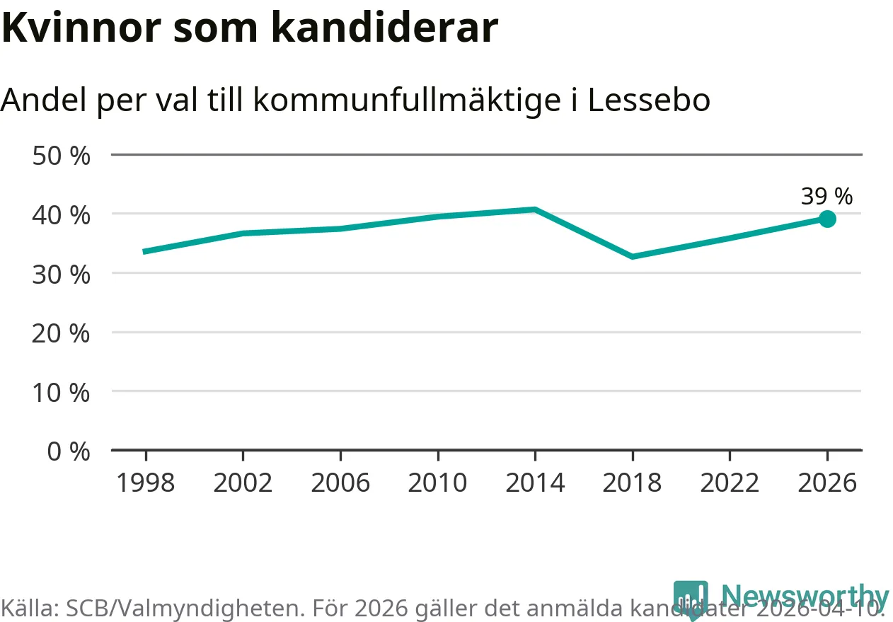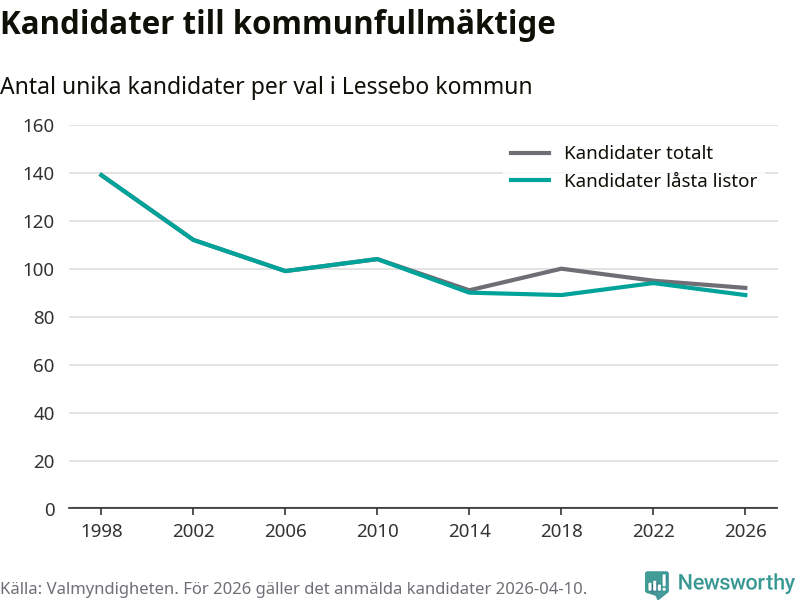 På torsdagen var det deadline för partier med låsta listor att registrera sina kandidater inför höstens val. Till valet till kommunfullmäktige i Lessebo är 89 kandidater anmälda på sådana listor, vilket är fem färre än i valet 2022. Det är den lägsta siffran sedan åtminstone valet 1998, vilket är så långt tillbaka som vi har statistik för.