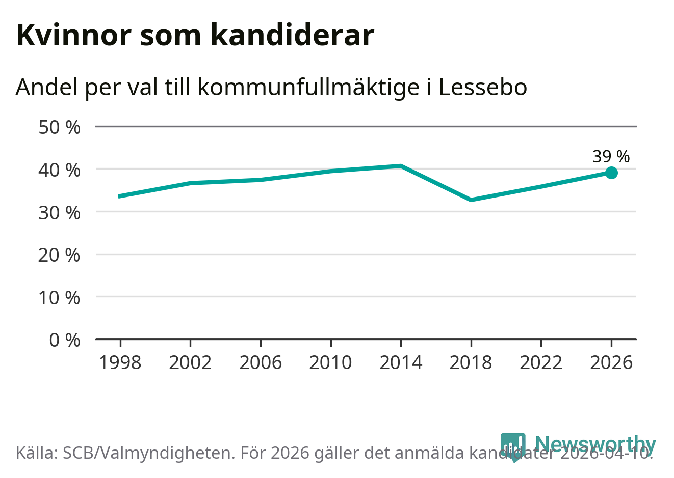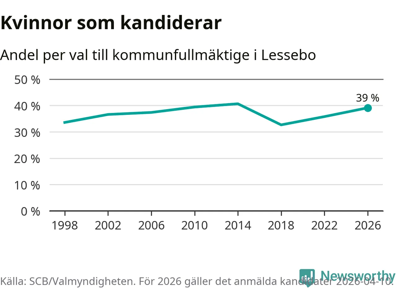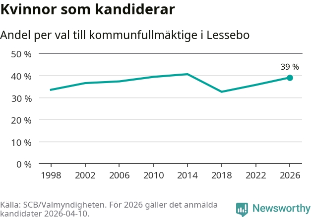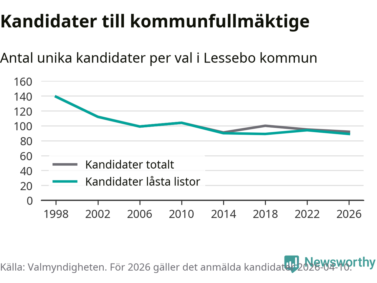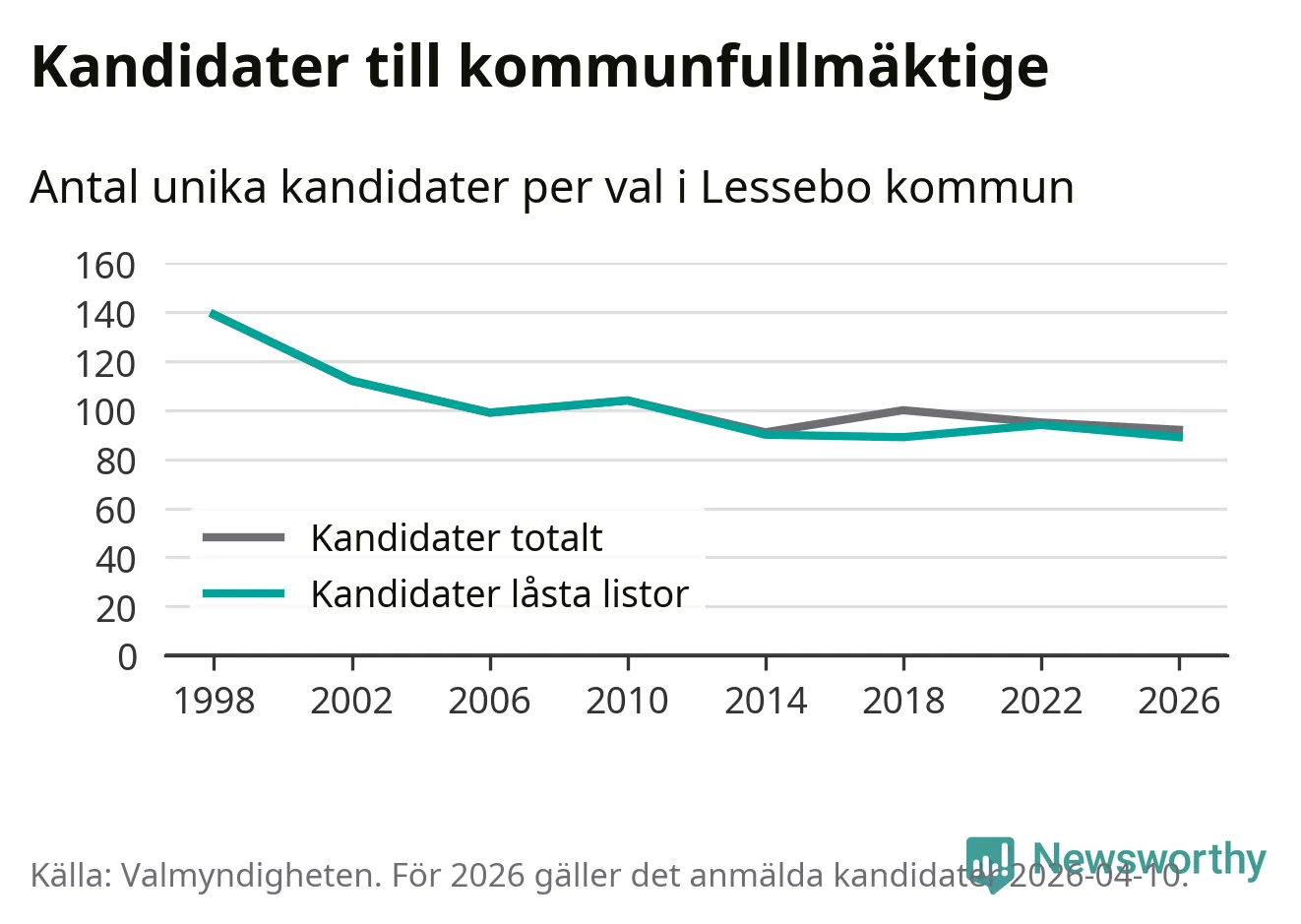 På torsdagen var det deadline för partier med låsta listor att registrera sina kandidater inför höstens val. Till valet till kommunfullmäktige i Lessebo är 89 kandidater anmälda på sådana listor, vilket är fem färre än i valet 2022. Det är den lägsta siffran sedan åtminstone valet 1998, vilket är så långt tillbaka som vi har statistik för.