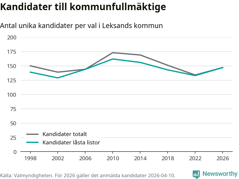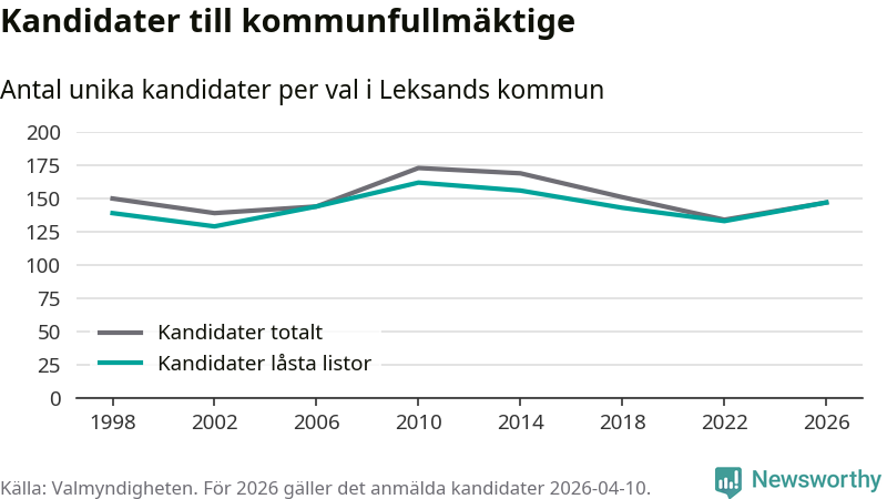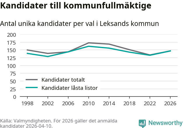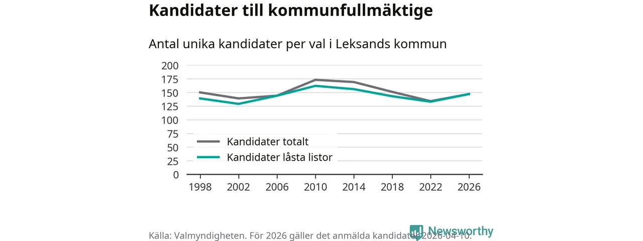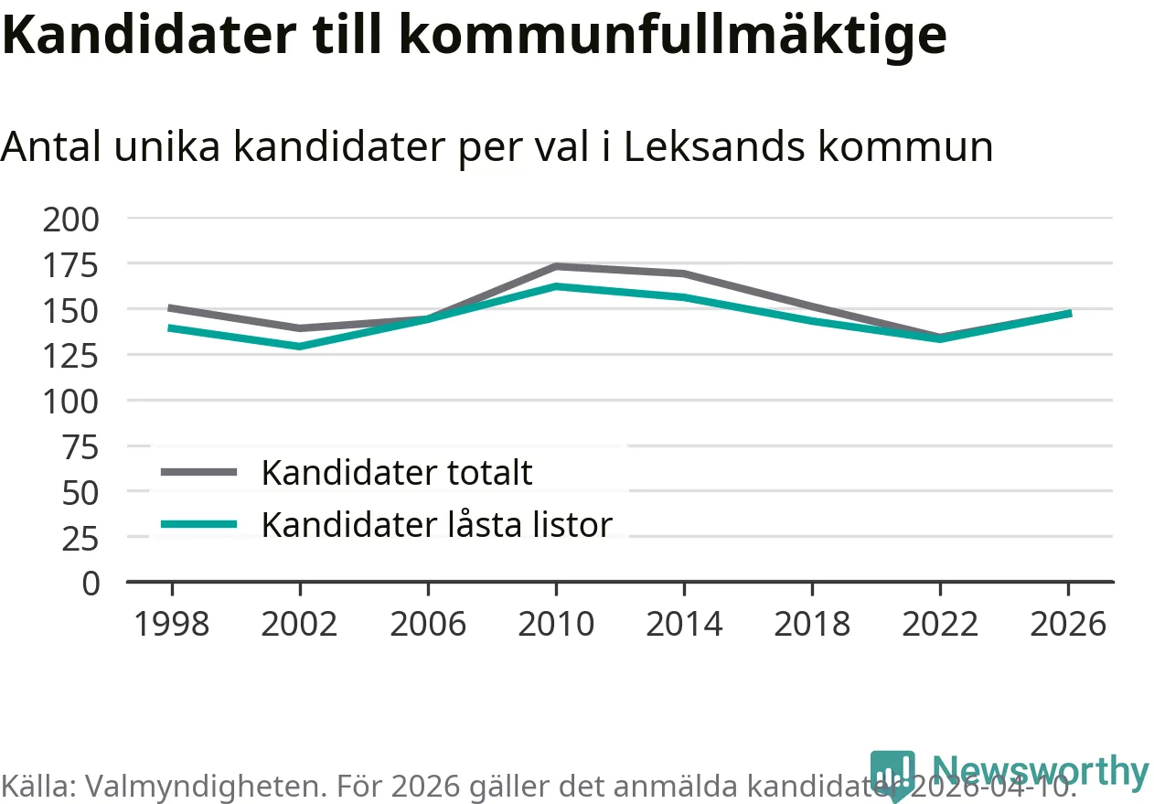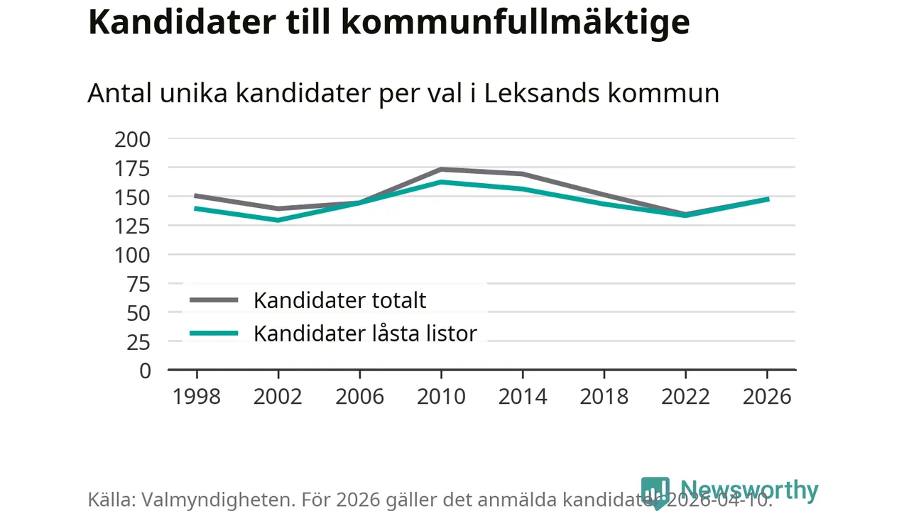 På torsdagen var det deadline för partier med låsta listor att registrera sina kandidater inför höstens val. Till valet till kommunfullmäktige i Leksand är 147 kandidater anmälda på sådana listor, vilket är 14 fler än i valet 2022.