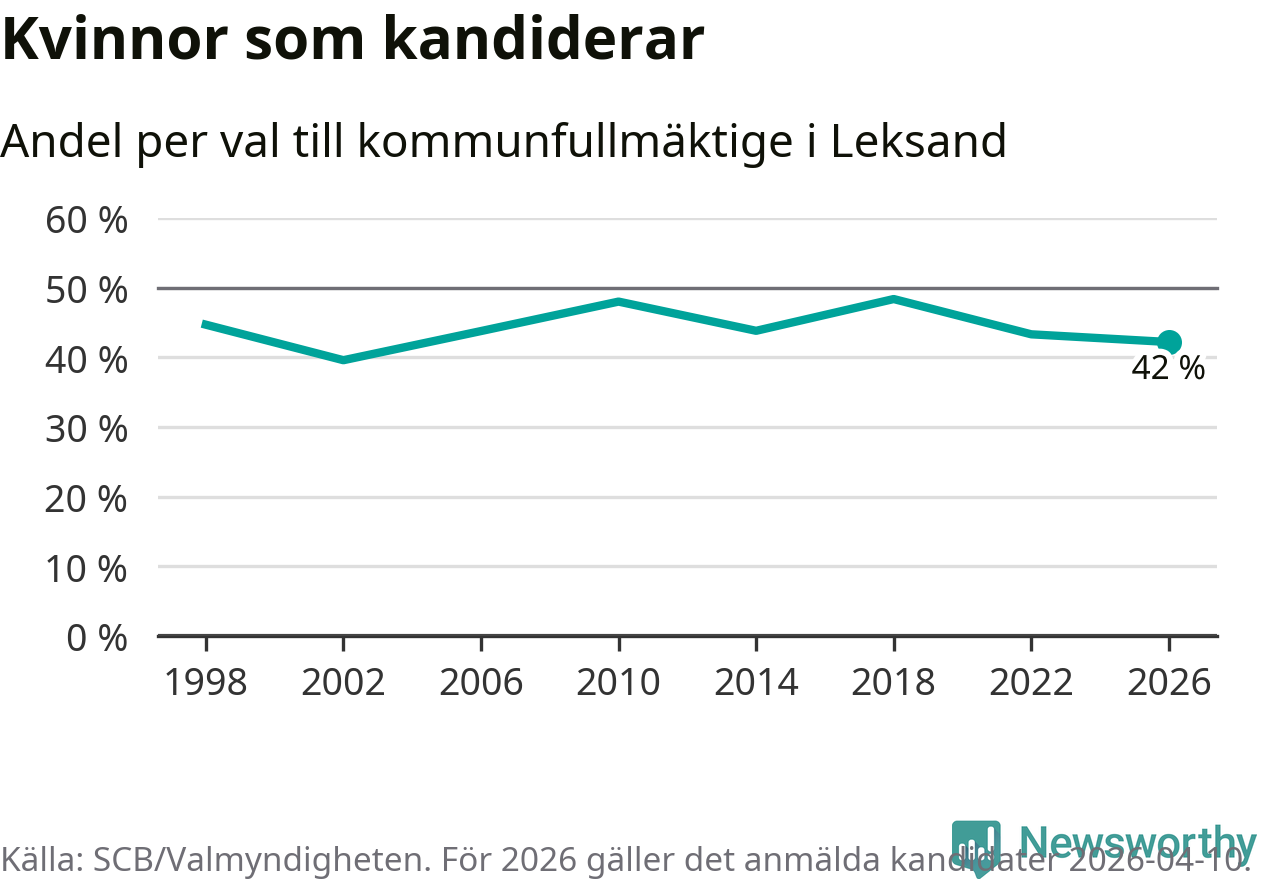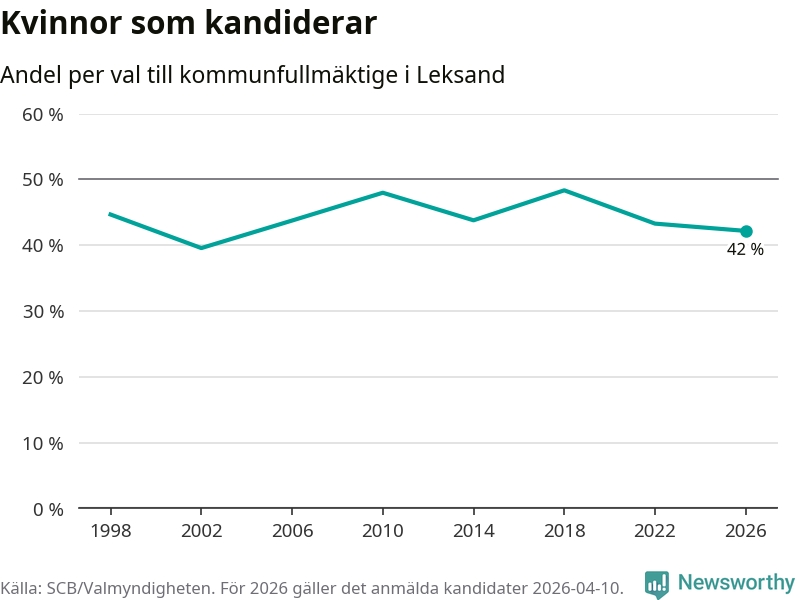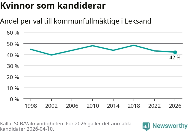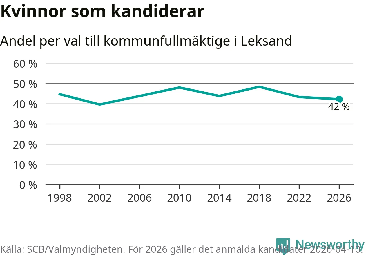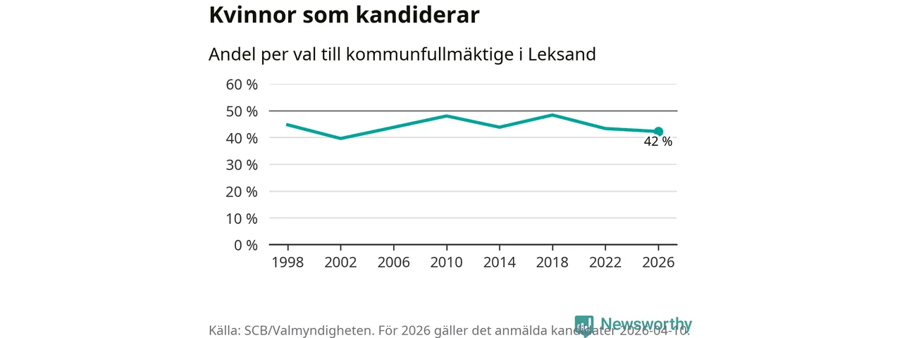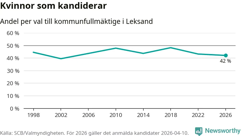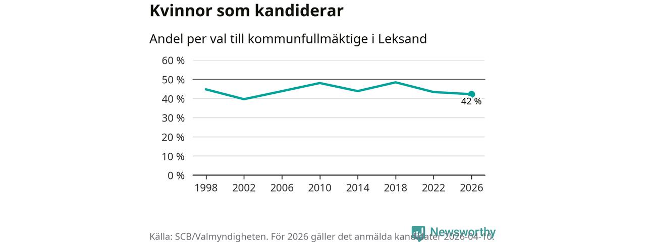 Kvinnorna utgör 42 procent av de hittills anmälda kandidaterna, vilket är den lägsta andelen på listorna till kommunfullmäktige i Leksand sedan valet 2002. Vid valet 2018 var 48 procent kvinnor, valet 2002 var motsvarande siffra 40 procent. Leksand är en av 264 kommuner i landet där männen utgör en majoritet av kandidaterna på listorna.