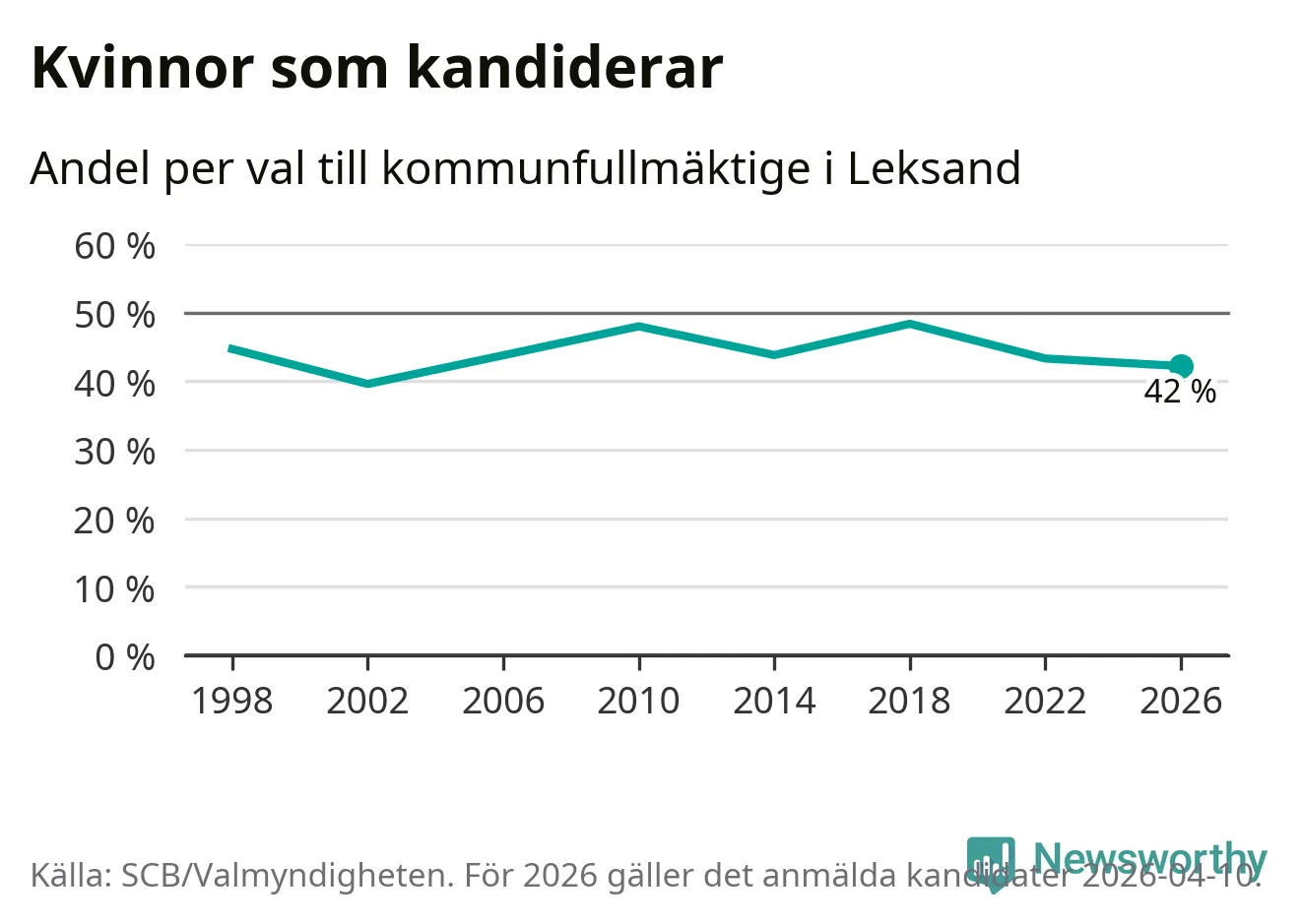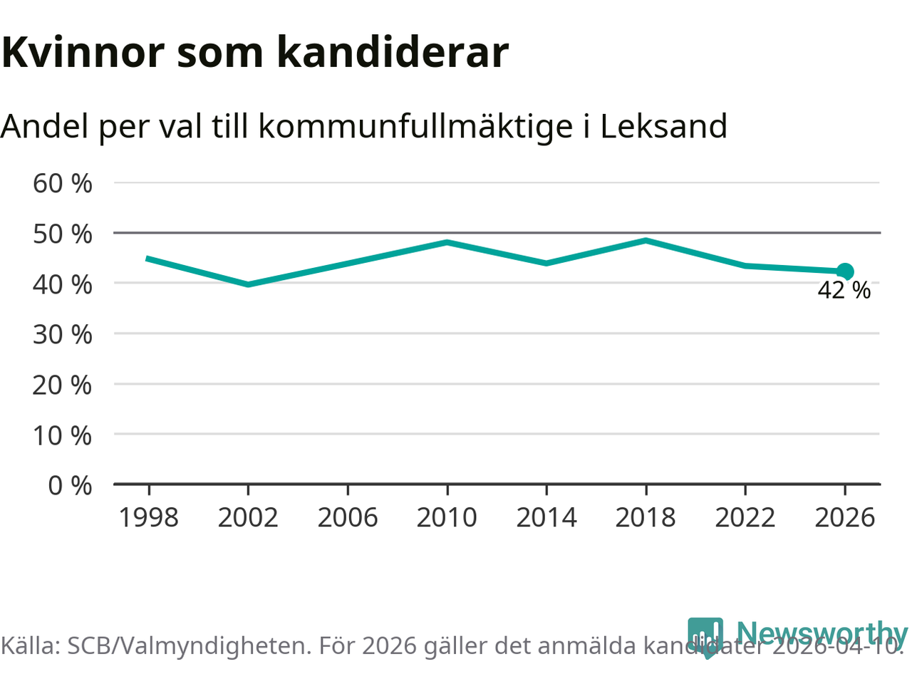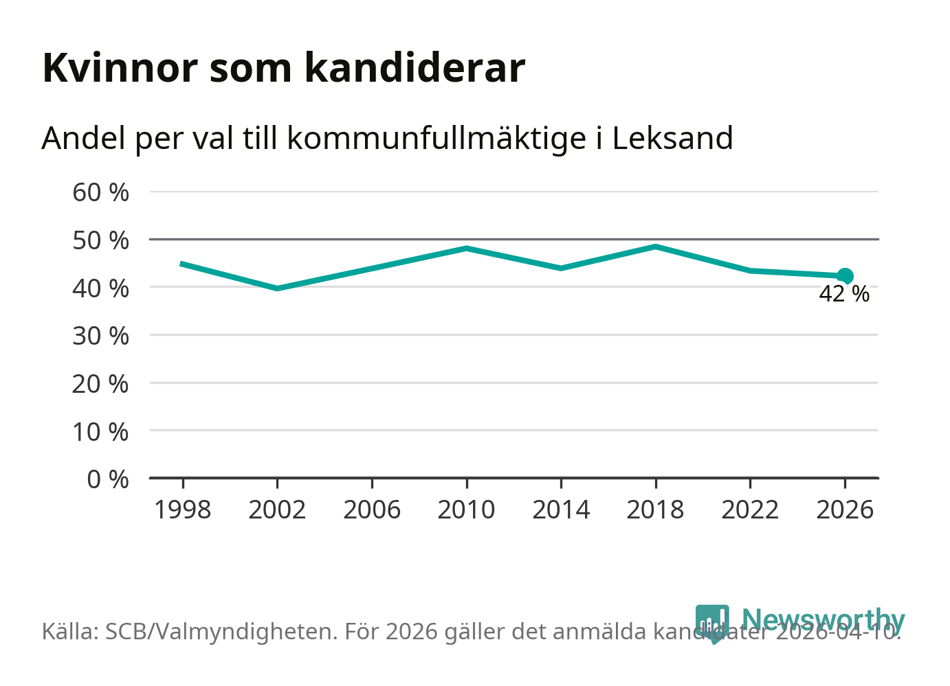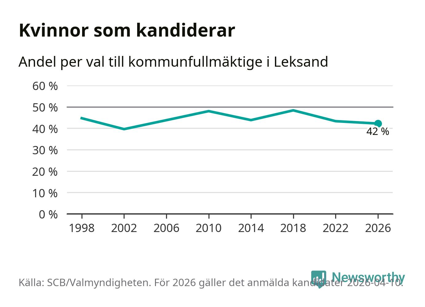 Kvinnorna utgör 42 procent av de hittills anmälda kandidaterna, vilket är den lägsta andelen på listorna till kommunfullmäktige i Leksand sedan valet 2002. Vid valet 2018 var 48 procent kvinnor, valet 2002 var motsvarande siffra 40 procent. Leksand är en av 264 kommuner i landet där männen utgör en majoritet av kandidaterna på listorna.