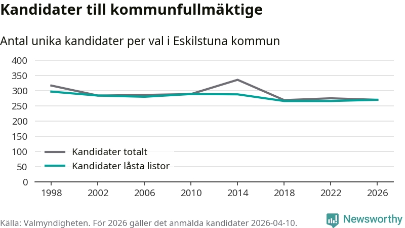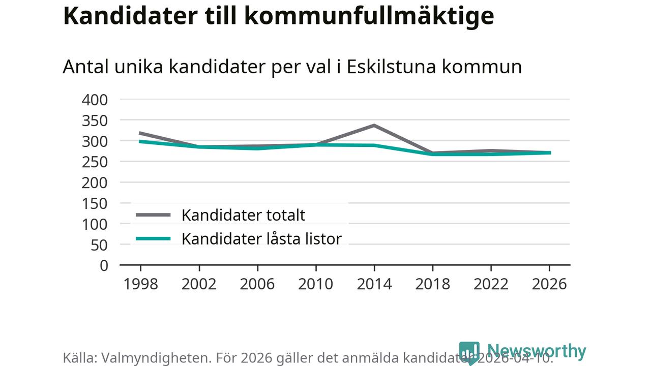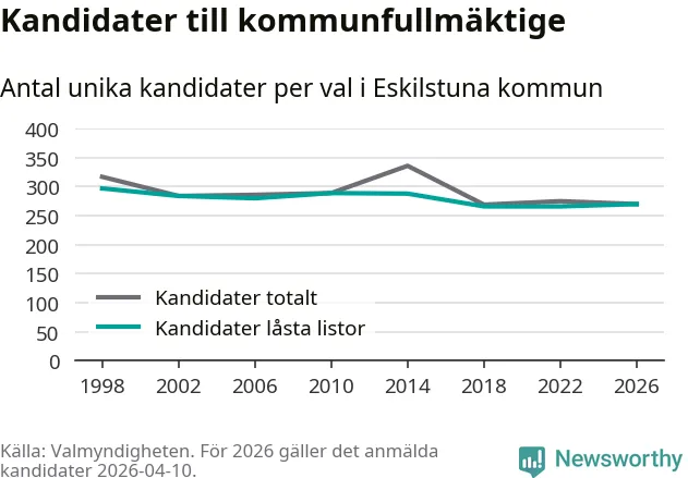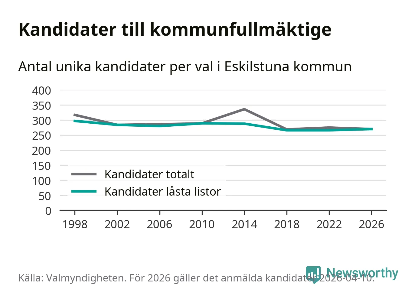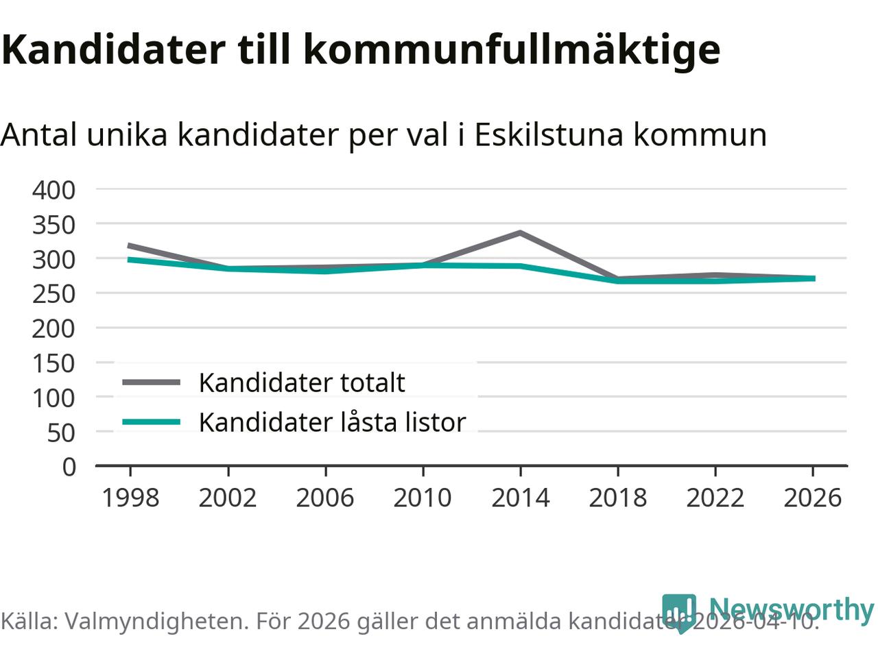 På torsdagen var det deadline för partier med låsta listor att registrera sina kandidater inför höstens val. Till valet till kommunfullmäktige i Eskilstuna är 270 kandidater anmälda på sådana listor, vilket är fyra fler än i valet 2022.