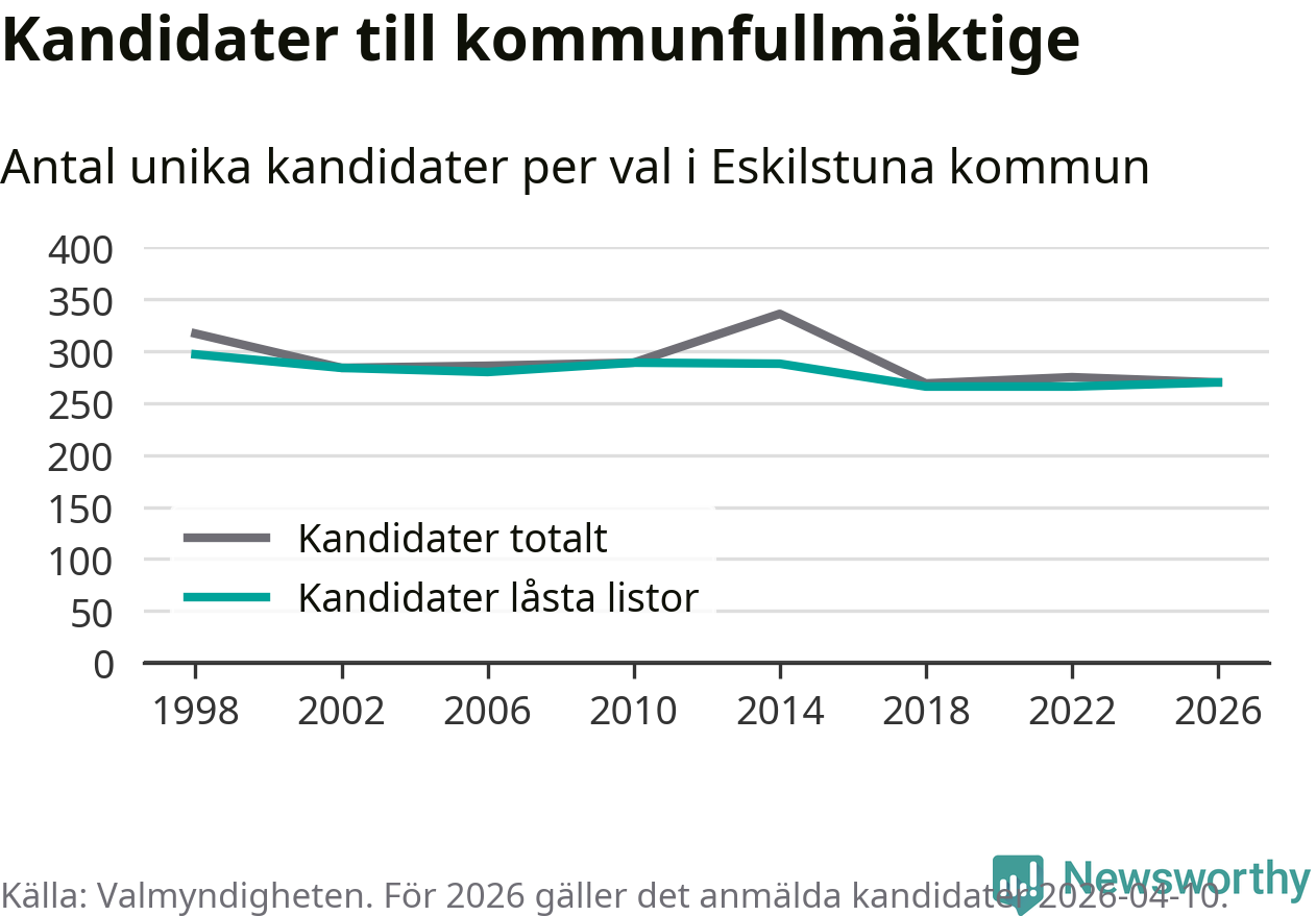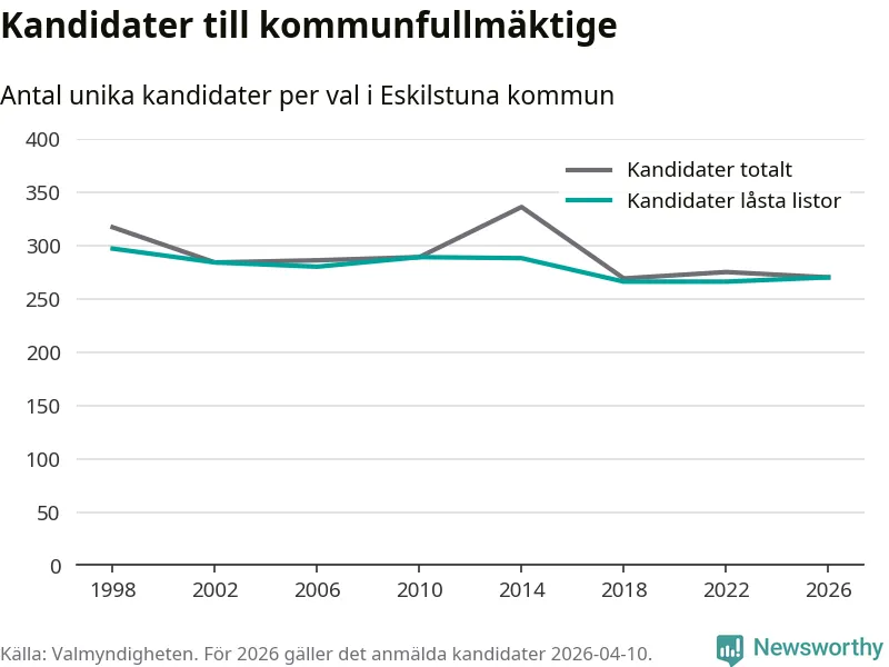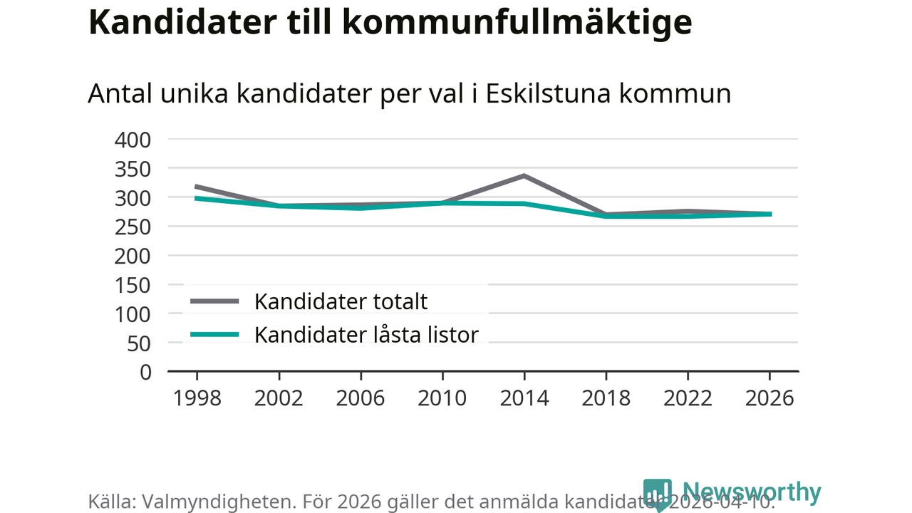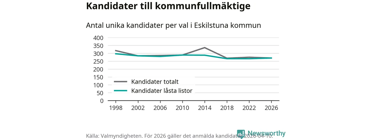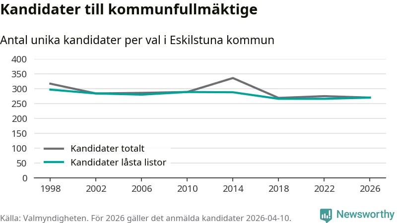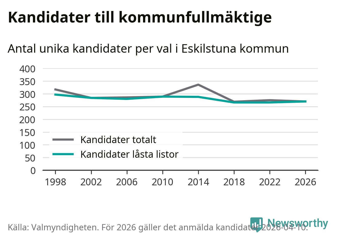 På torsdagen var det deadline för partier med låsta listor att registrera sina kandidater inför höstens val. Till valet till kommunfullmäktige i Eskilstuna är 270 kandidater anmälda på sådana listor, vilket är fyra fler än i valet 2022.
