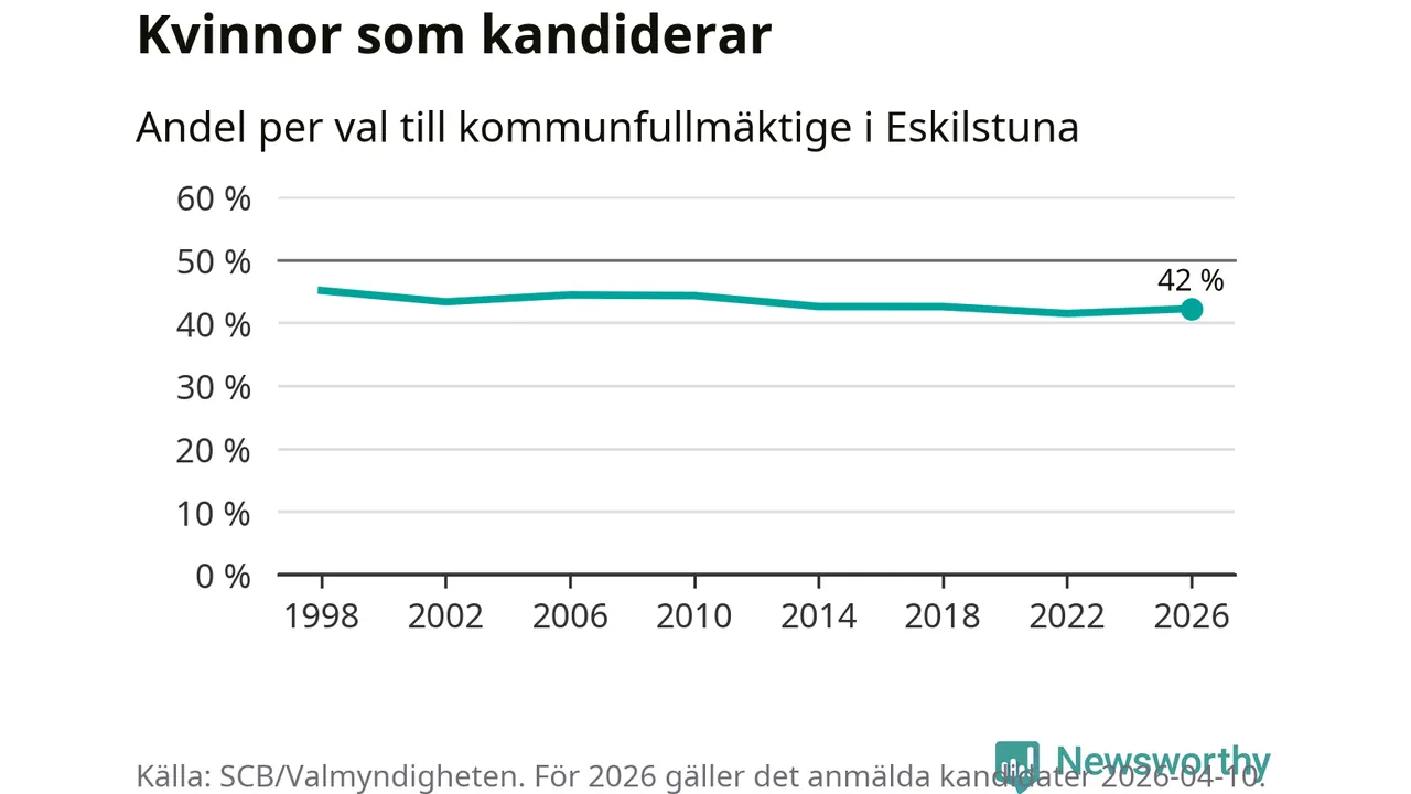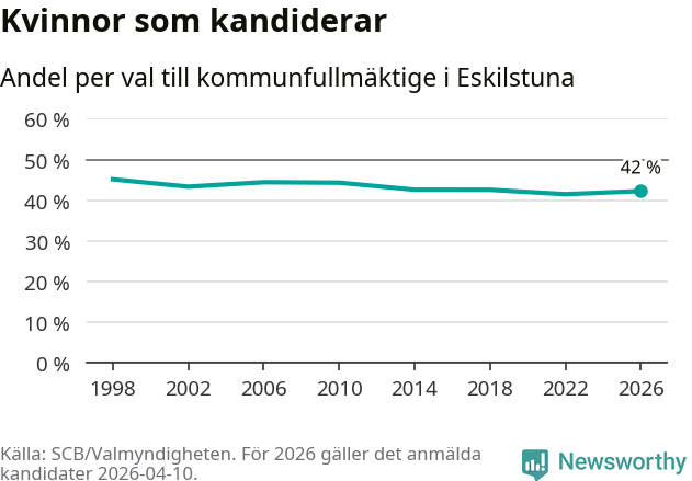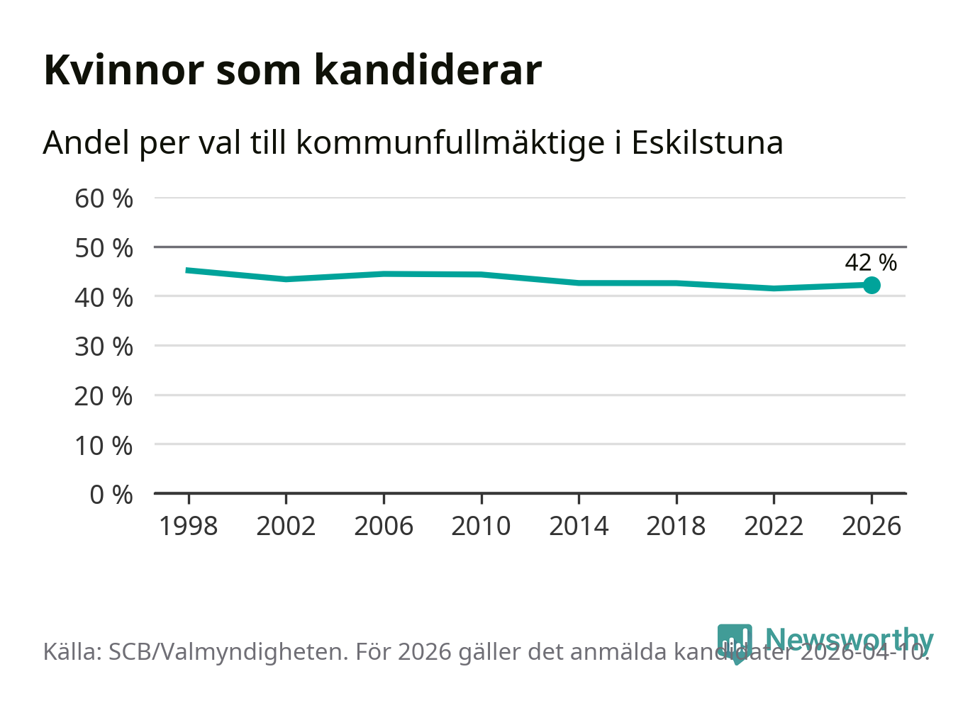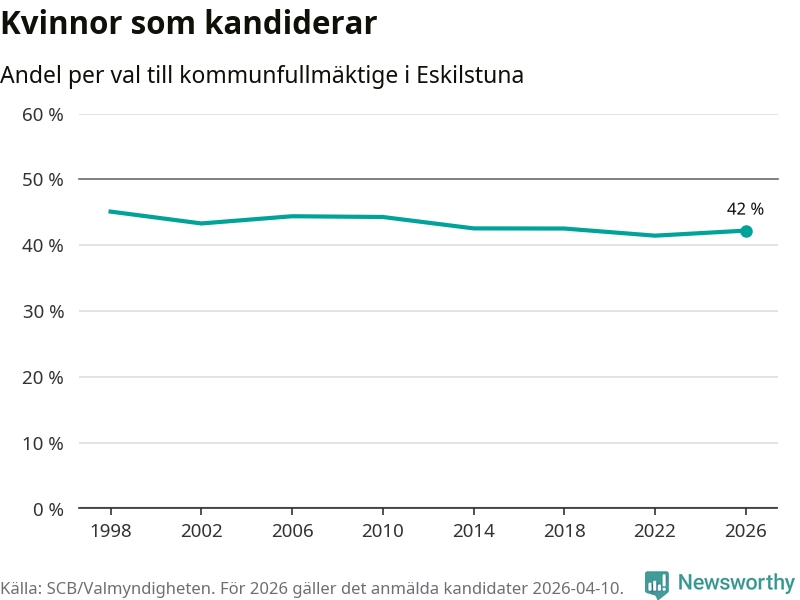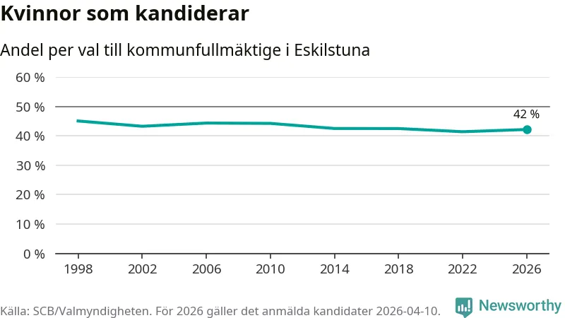 Kvinnorna utgör 42 procent av de hittills anmälda kandidaterna. Vid valet 1998 var 45 procent kvinnor, valet 2022 var motsvarande siffra 41 procent. Eskilstuna är en av 264 kommuner i landet där männen utgör en majoritet av kandidaterna på listorna.