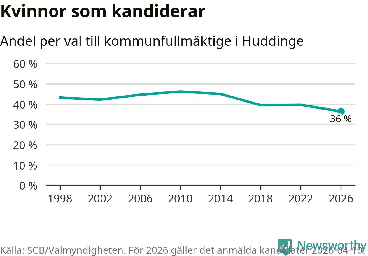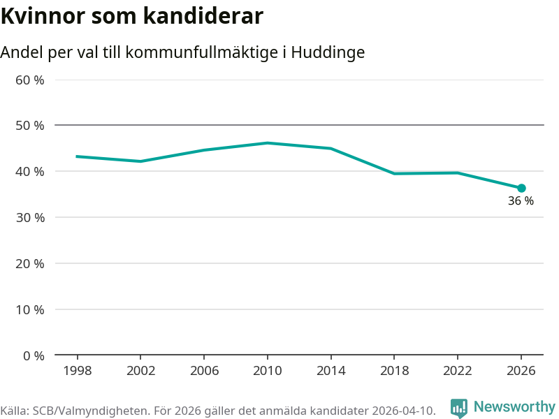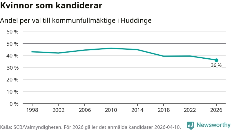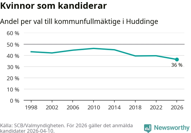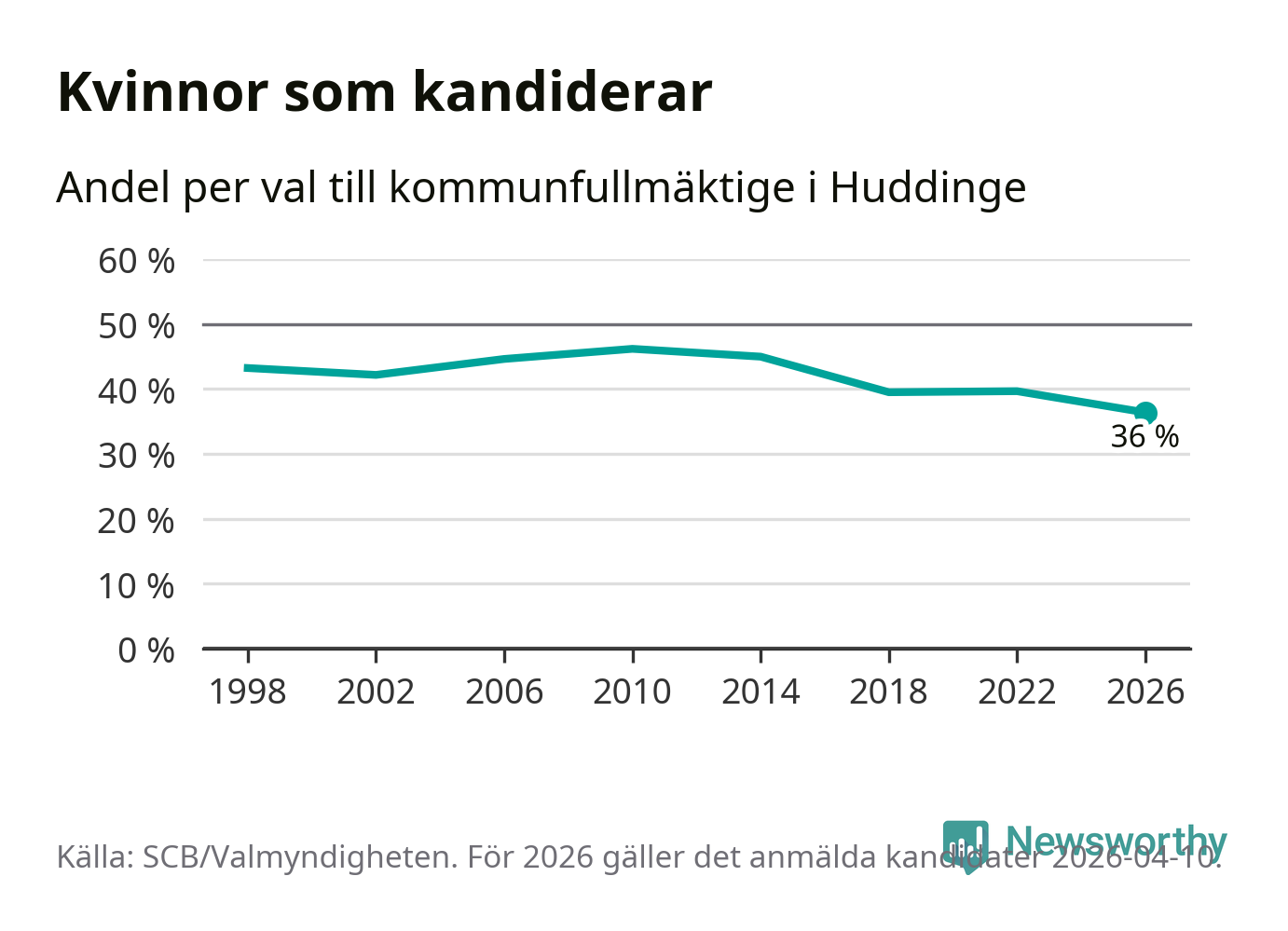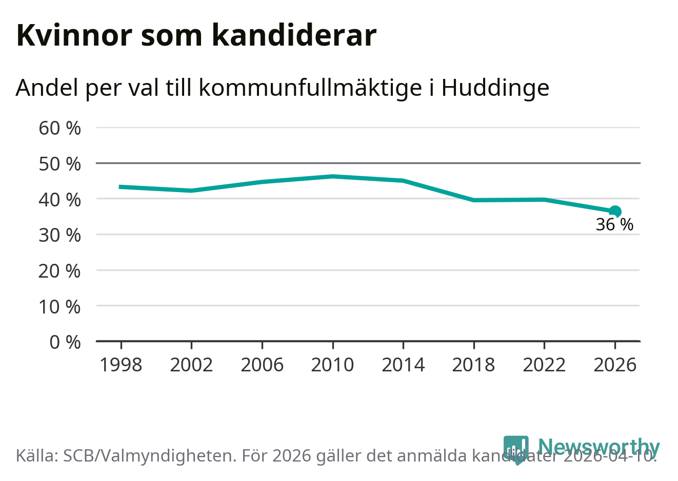 Kvinnorna utgör 36 procent av de hittills anmälda kandidaterna, vilket är den lägsta andelen på listorna till kommunfullmäktige i Huddinge sedan åtminstone valet 1998. Huddinge är en av 264 kommuner i landet där männen utgör en majoritet av kandidaterna på listorna.