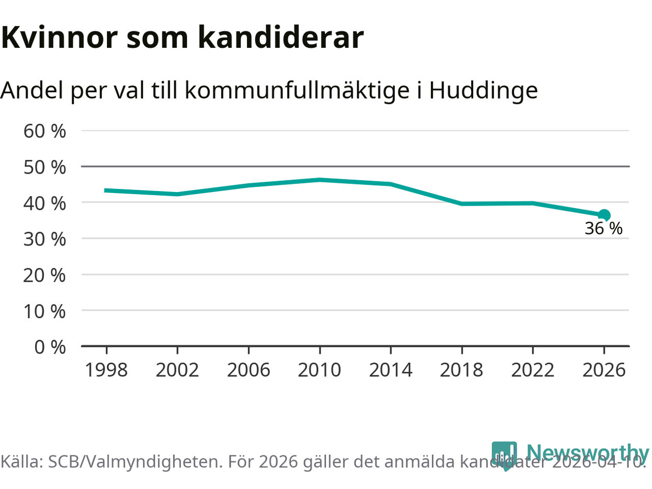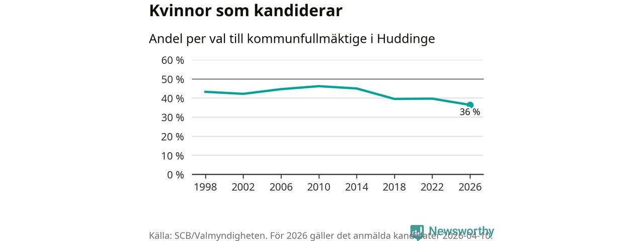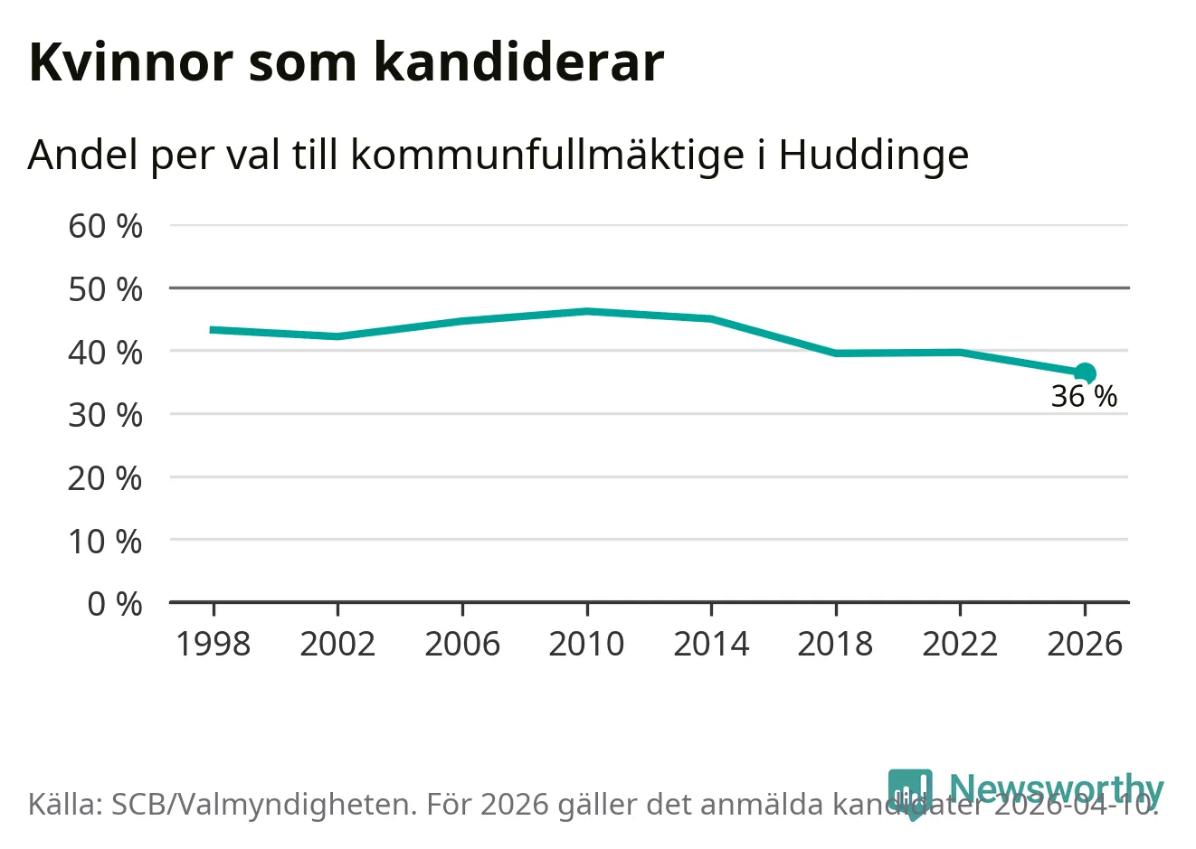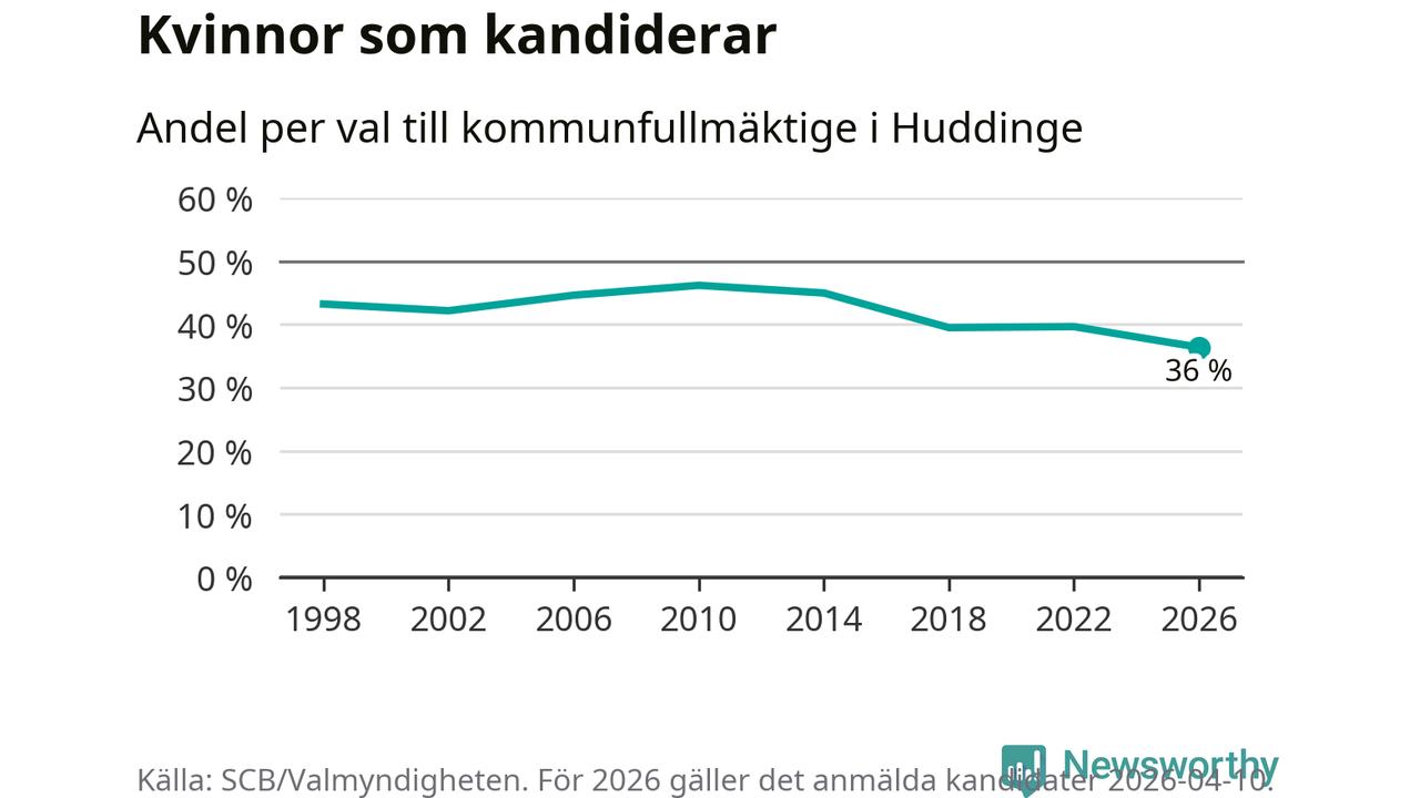Nu börjar kandidatlistorna till höstens kommunfullmäktigeval i Huddinge falla på plats. 108 kvinnor och 189 män från 16 partier är anmälda hittills. Det är den lägsta andelen kvinnor under det här århundradet.