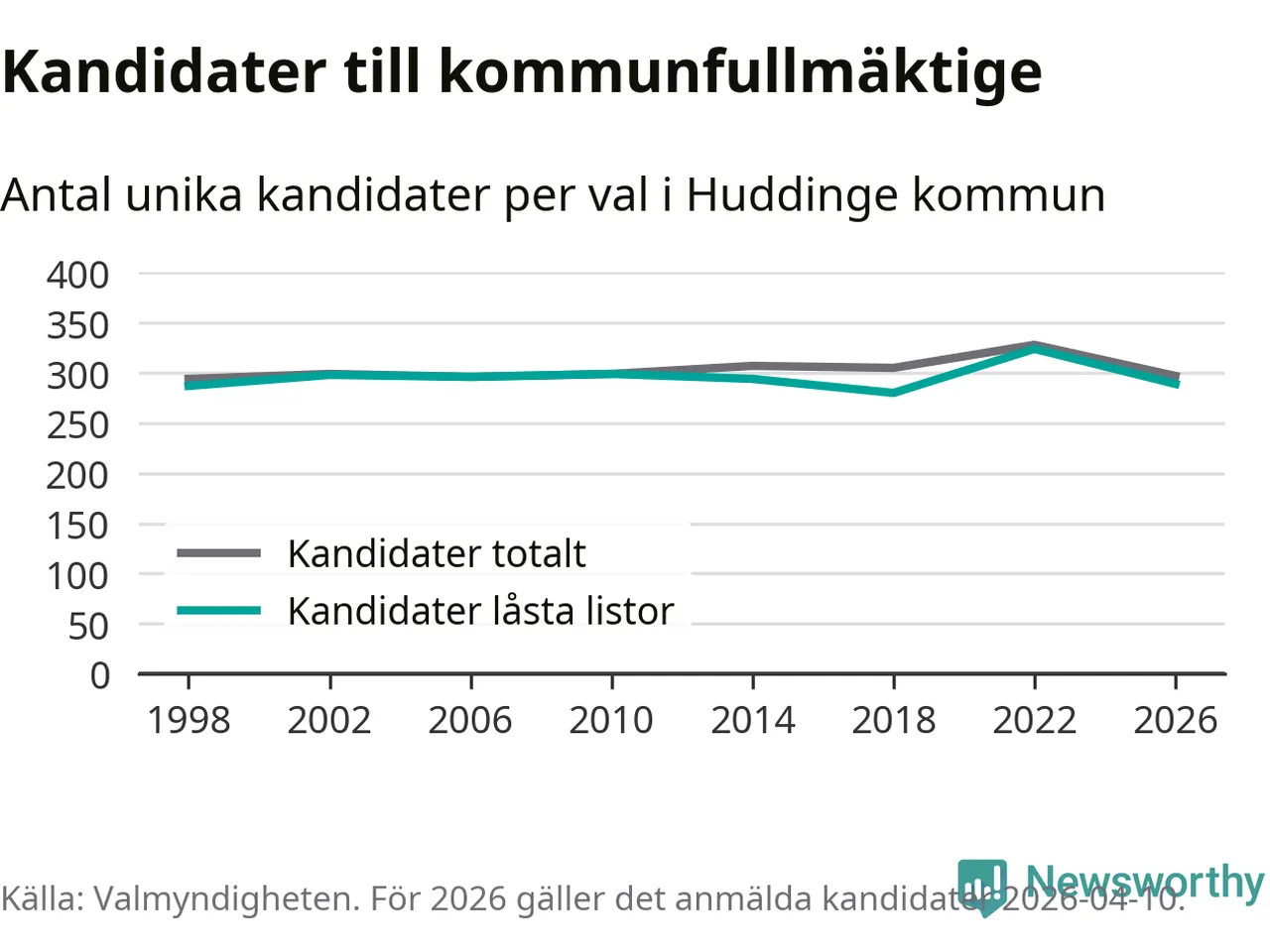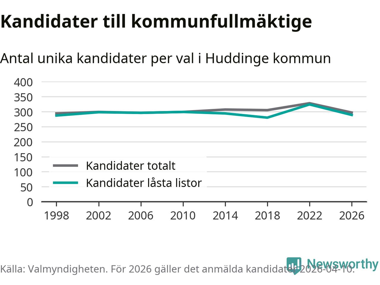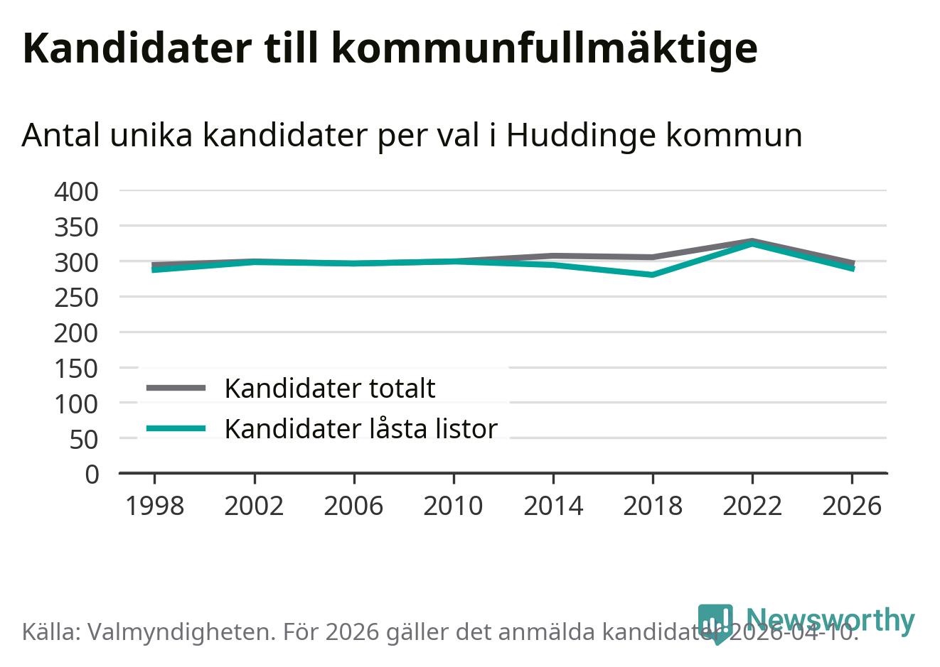 På torsdagen var det deadline för partier med låsta listor att registrera sina kandidater inför höstens val. Till valet till kommunfullmäktige i Huddinge är 289 kandidater anmälda på sådana listor, vilket är 35 färre än i valet 2022.